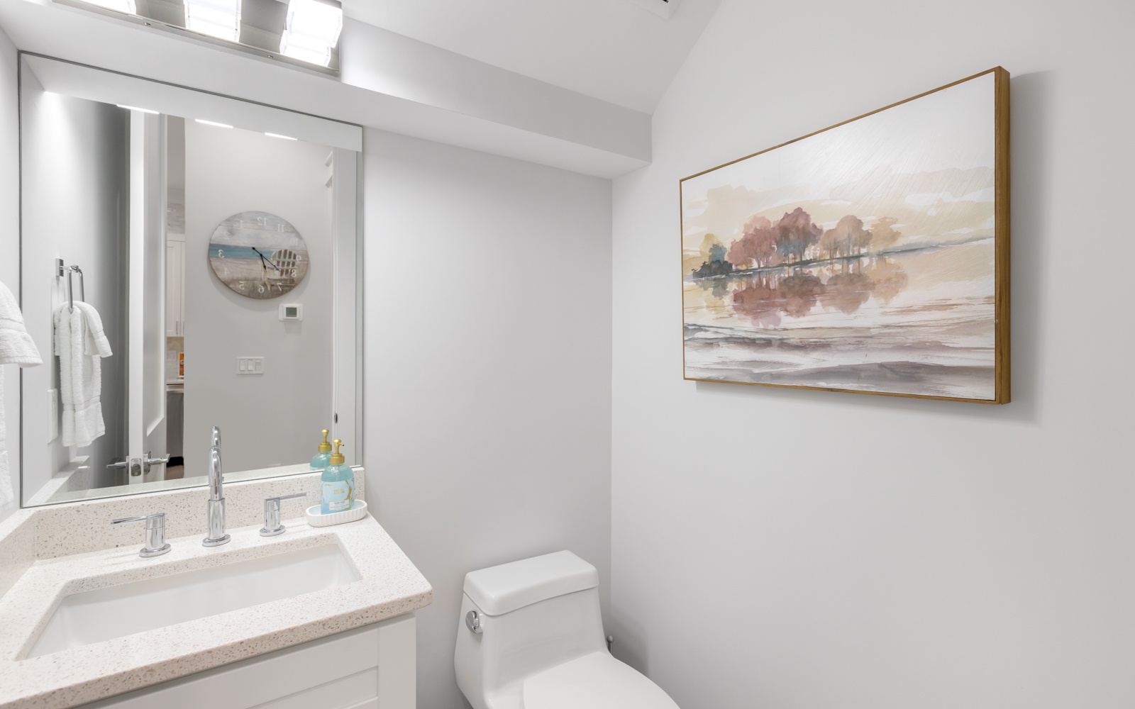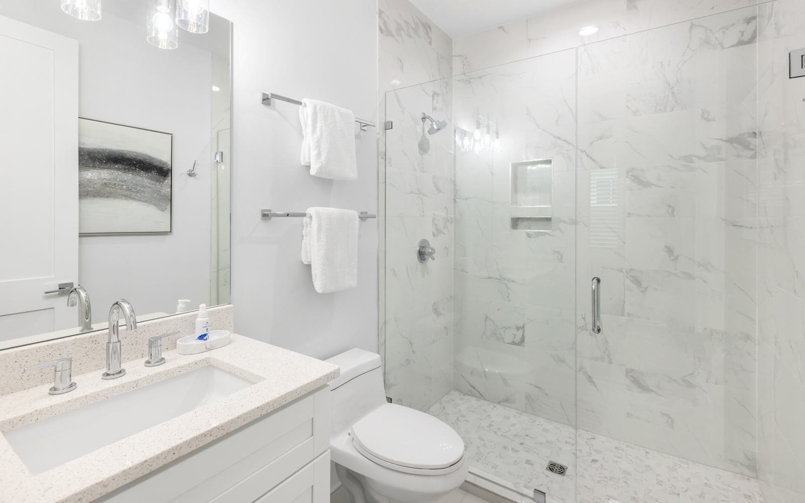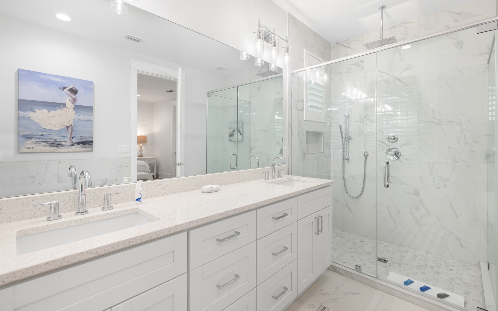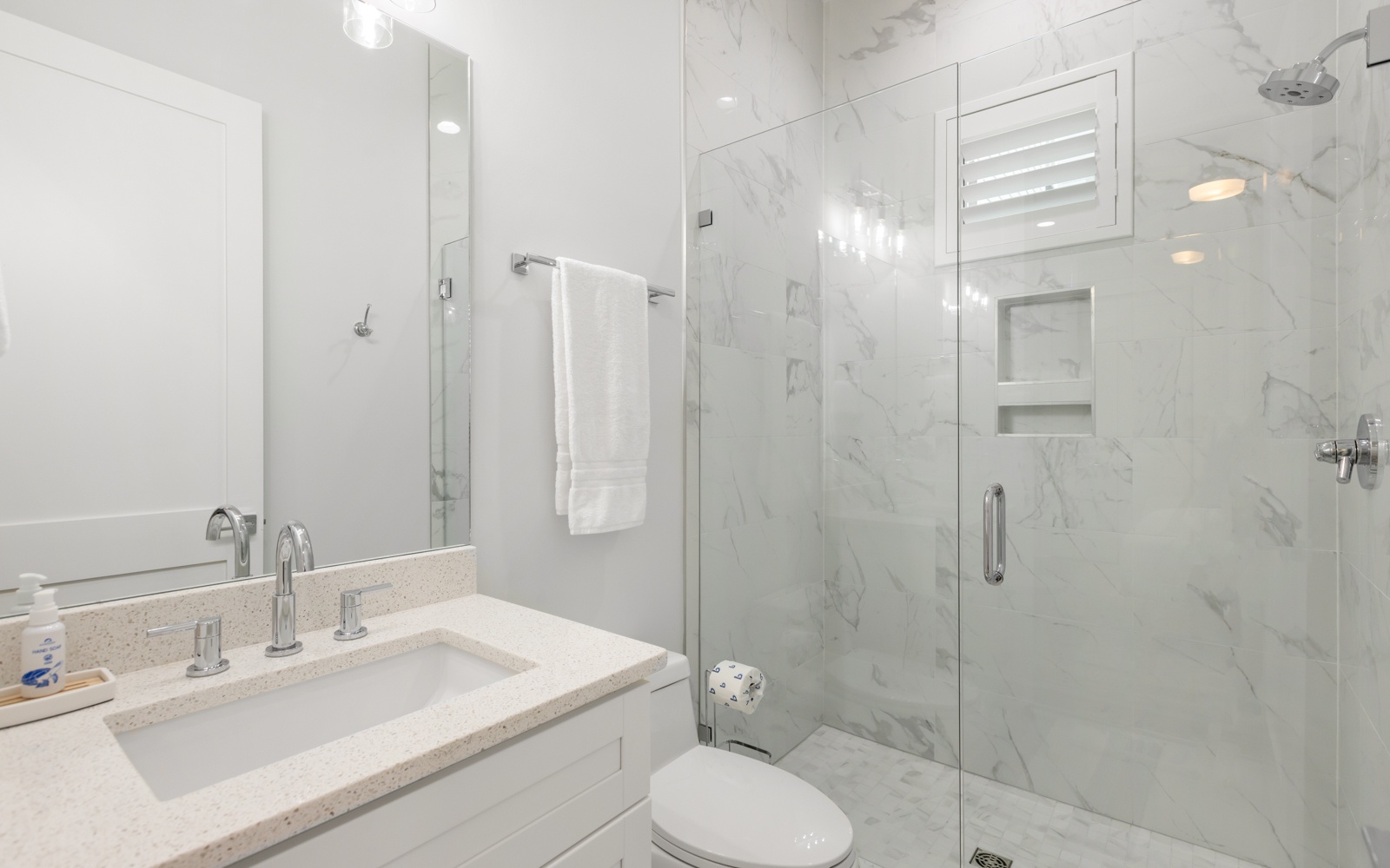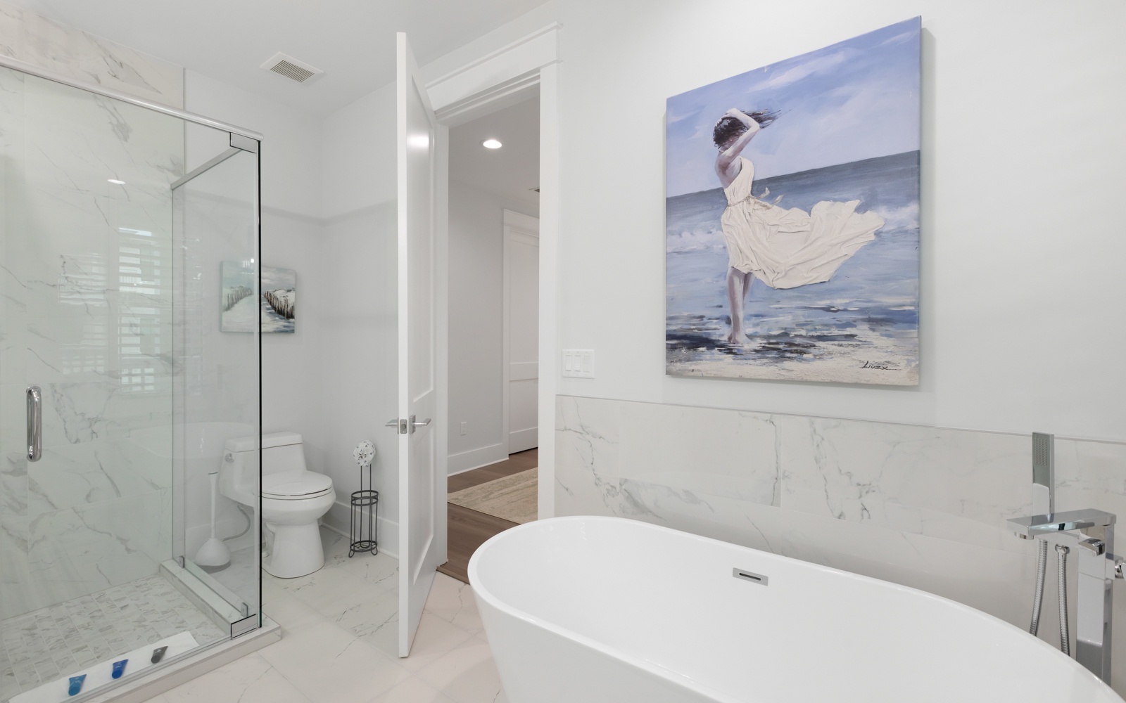 Design details are sharp throughout: quartzite and ceramic tile in the bathrooms, custom closets, wide-plank hardwood floors, shiplap accents, and crown molding that gives everything a polished finish. There’s a primary suite on the first floor with its own entrance, and another on the second floor with a private balcony and a spa-style bathroom, complete with a show-stopping soaking tub.