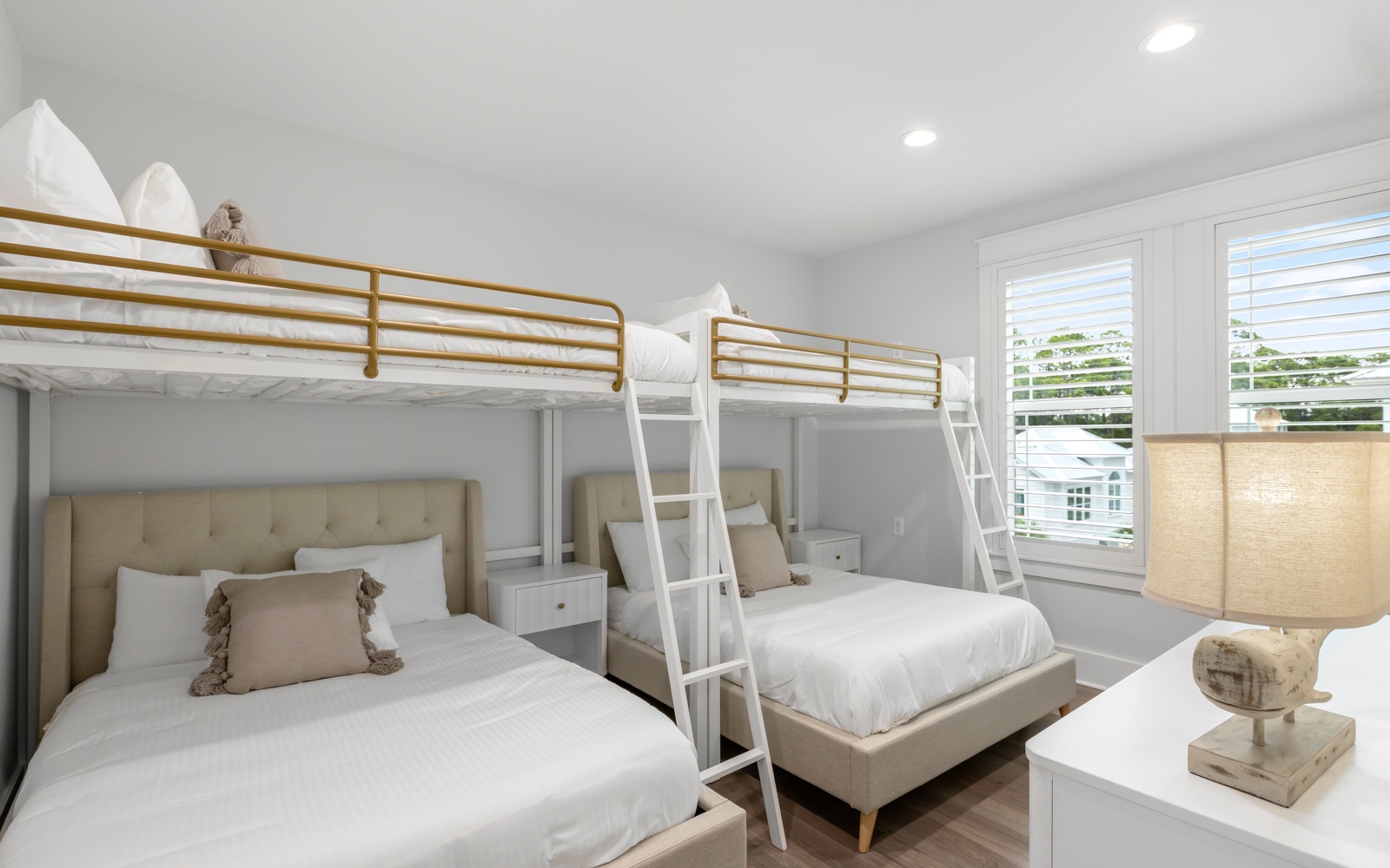 On the third level: two more primary bedrooms and a bunk room with four full beds, each one with its own private balcony. (Yes, every bedroom has porch access.