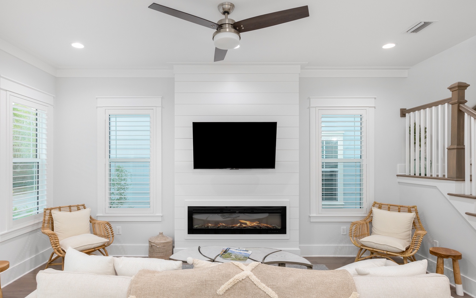 Downstairs, the living room has a sleek gas fireplace. Upstairs, a second hangout space opens to a screened-in porch and a media wall that’s just begging for movie marathons or game-day snacks.