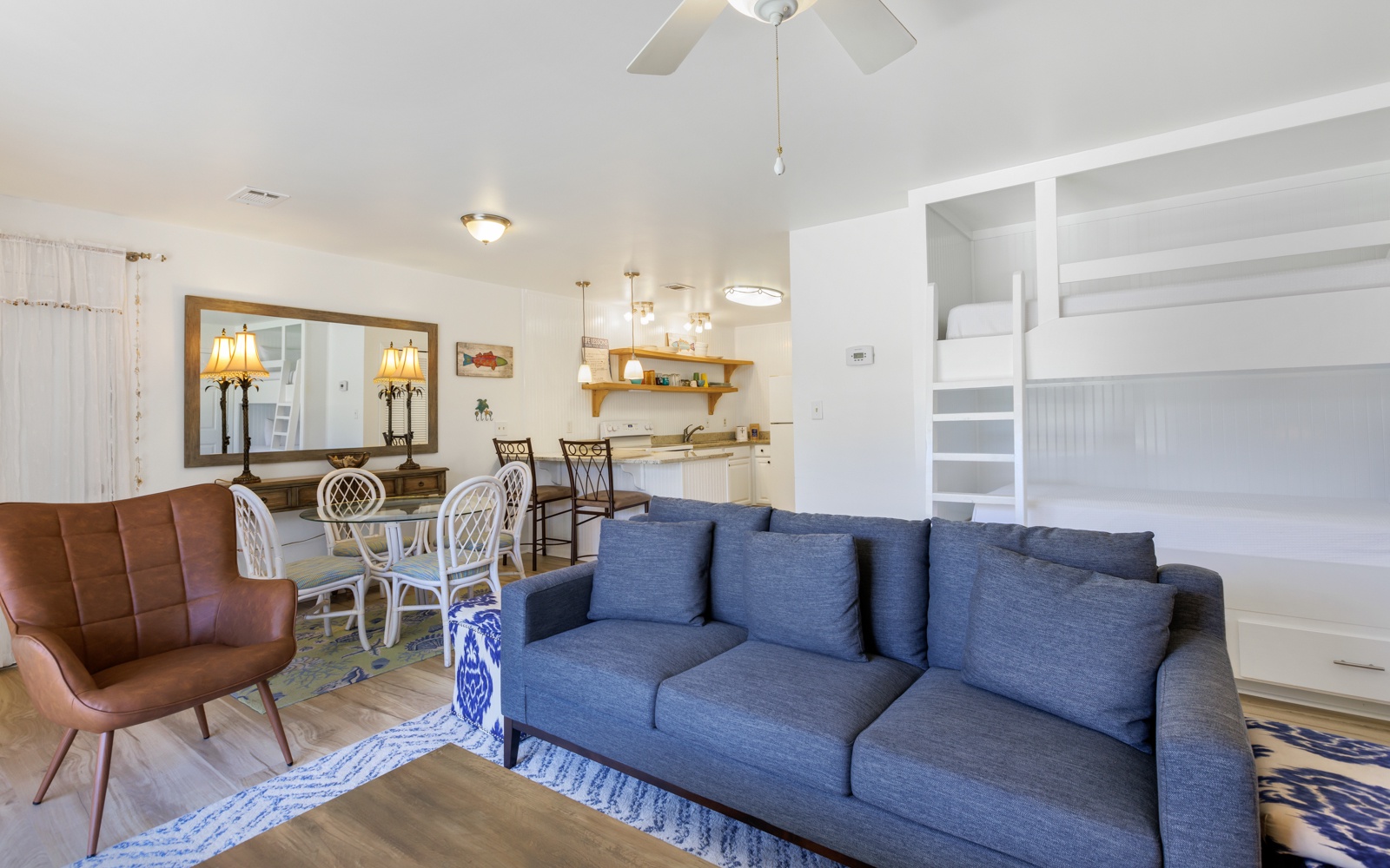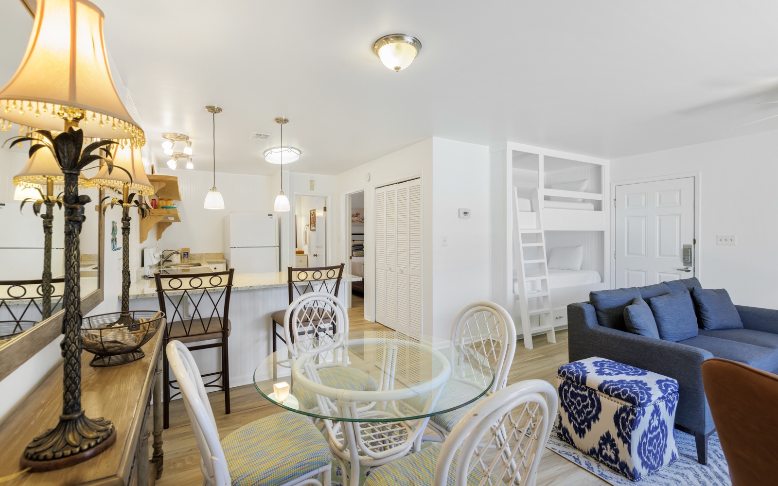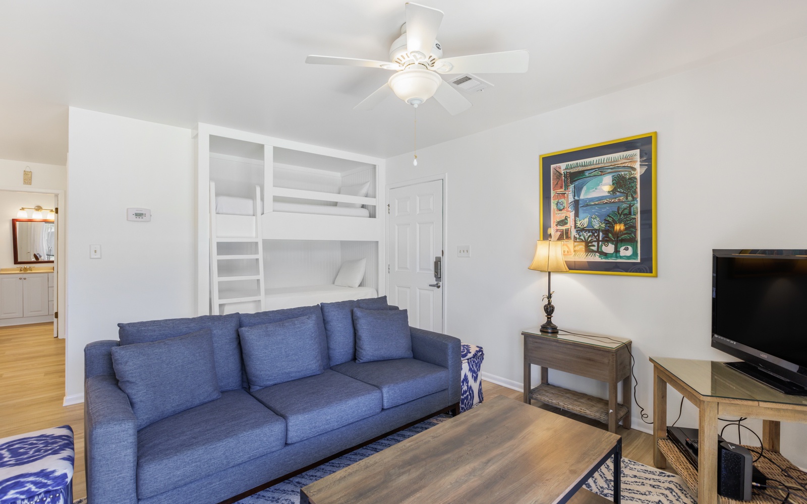 Newly renovated, this cute, first-floor condo has a beautiful living room space, with a bunk nook and two oversized twin beds, perfect for the kids.