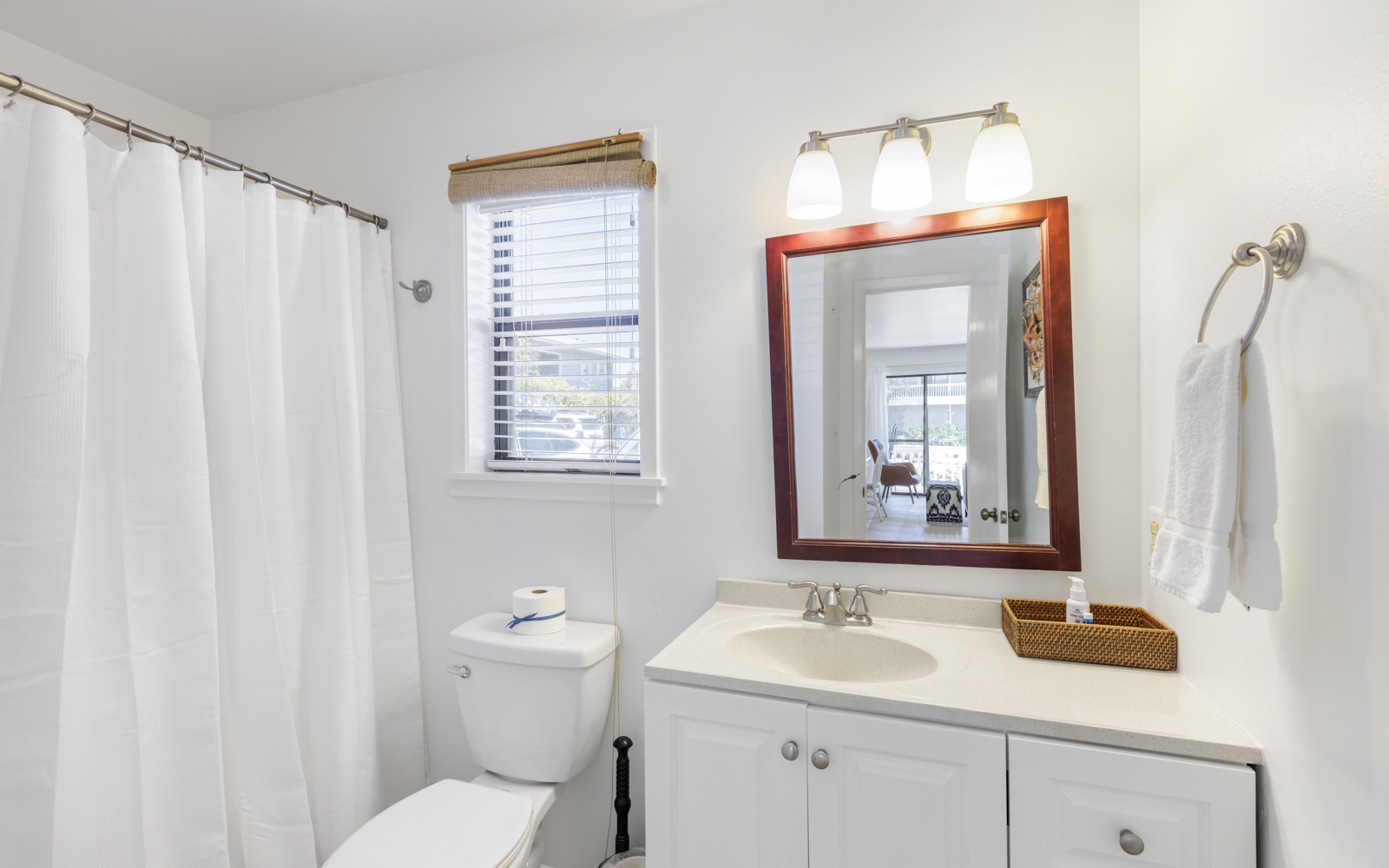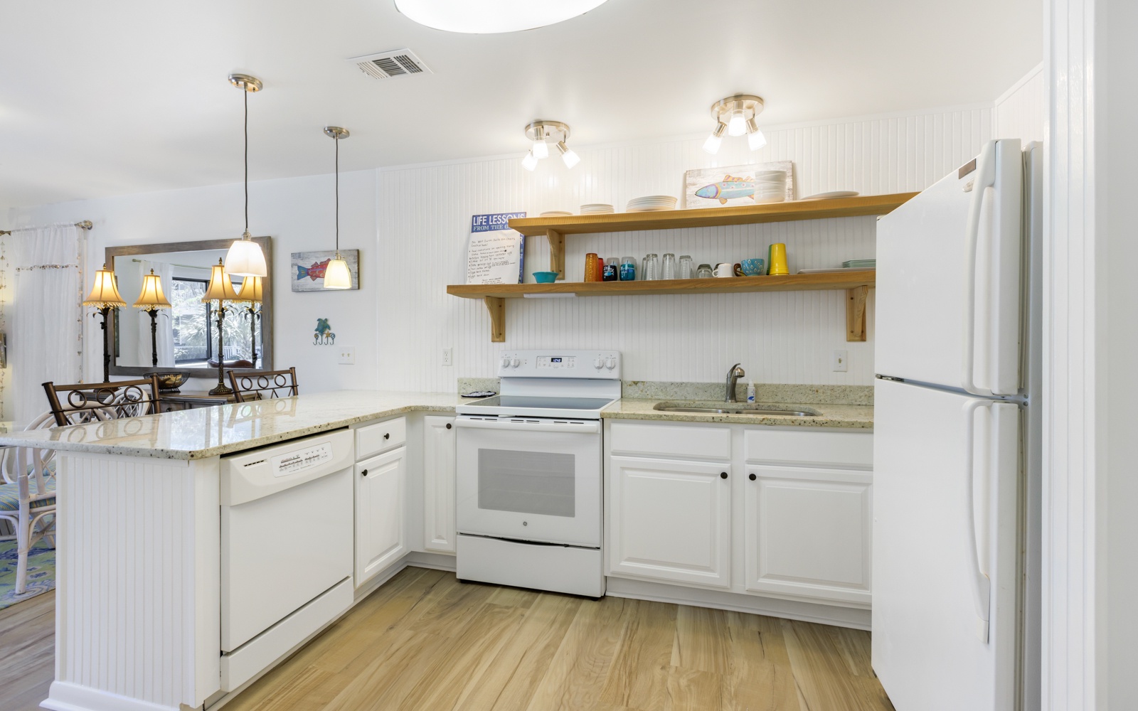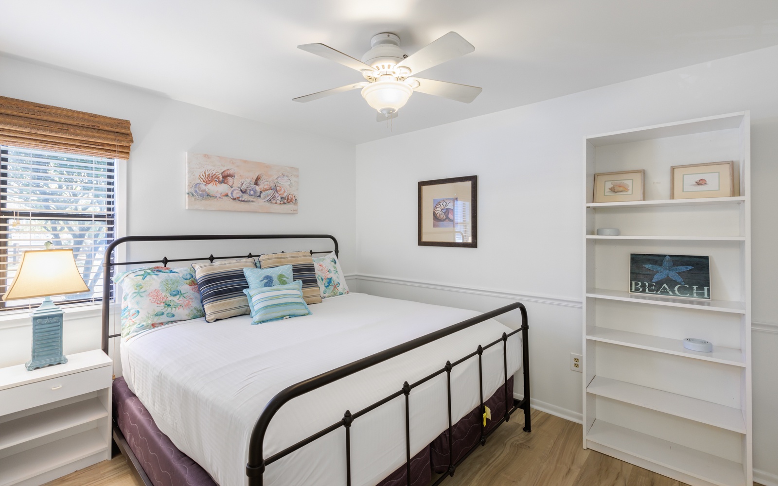 The primary bedroom, king, shares the hallway bath. The large, covered porch off the living room seats 4. And the cozy kitchen has plenty of counter space for preparing meals or snacks for the beach.
