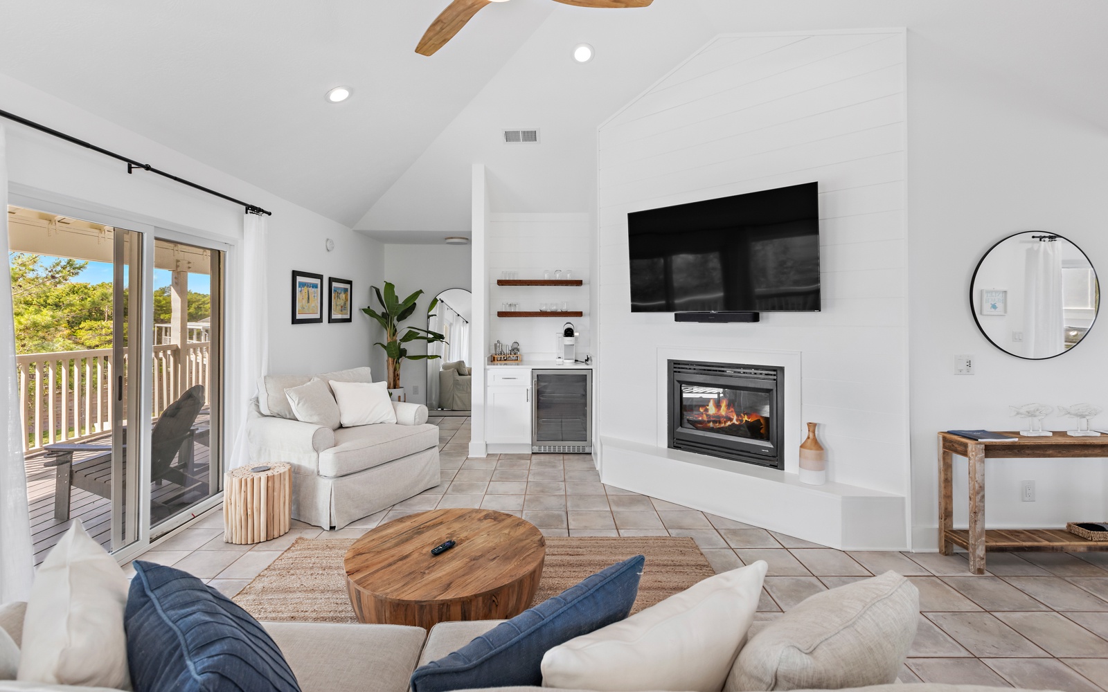 Inside, the open layout invites you to unwind in a sunlit living room with an electric fireplace and a coffee and beverage bar.