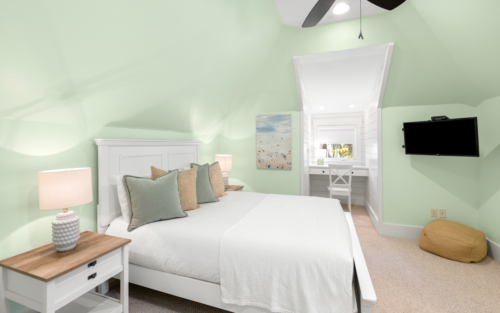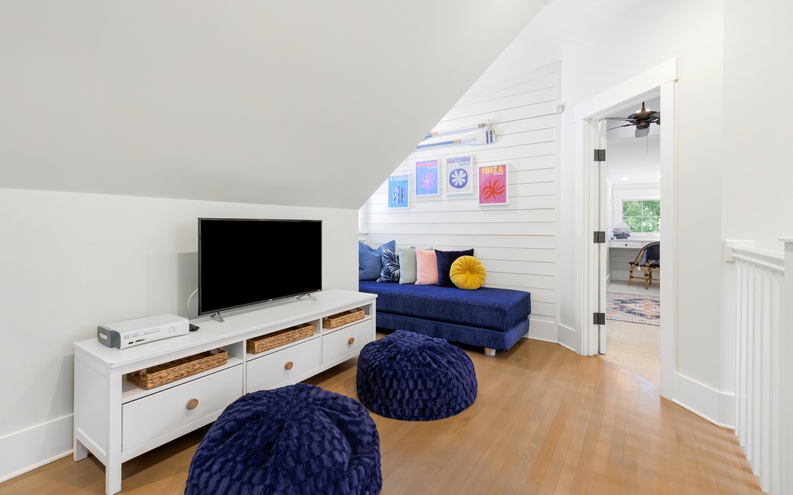Upstairs, a cozy guest room, king, is great for friends or family members seeking their own private oasis. Adjacent to it is another charming guest room with a queen and a twin bed, ideal for children or additional guests.