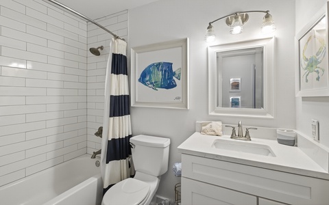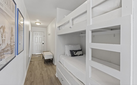 The guest room boasts a comfortable queen bed and a full bath. Additionally, there's a convenient bunk nook, perfect for kids or extra guests.