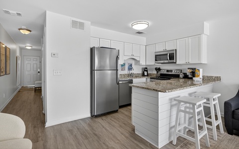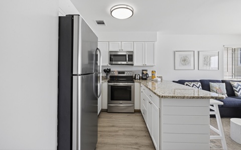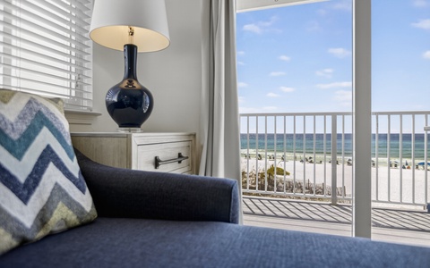 At the top of the stairs (please note, there is no elevator), you'll find a welcoming living room featuring a sleeper sofa. The living area opens up to a covered porch, an ideal spot to savor your morning coffee while watching the waves crash on the shore.
