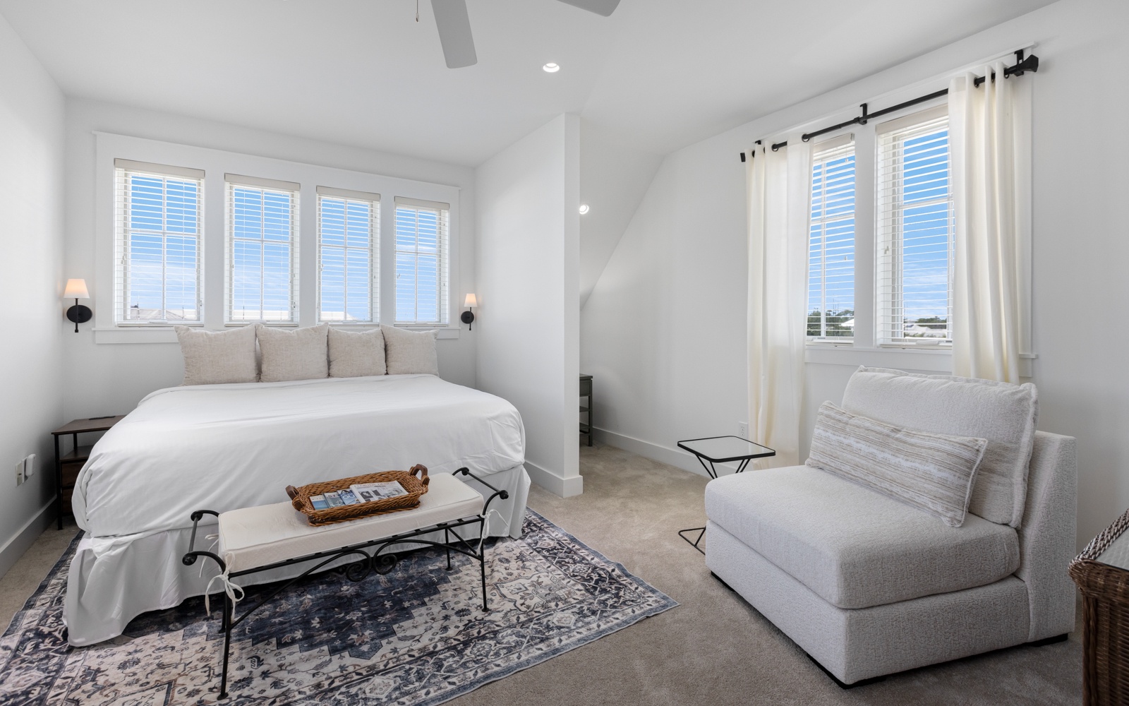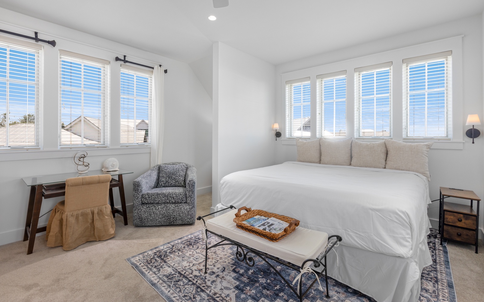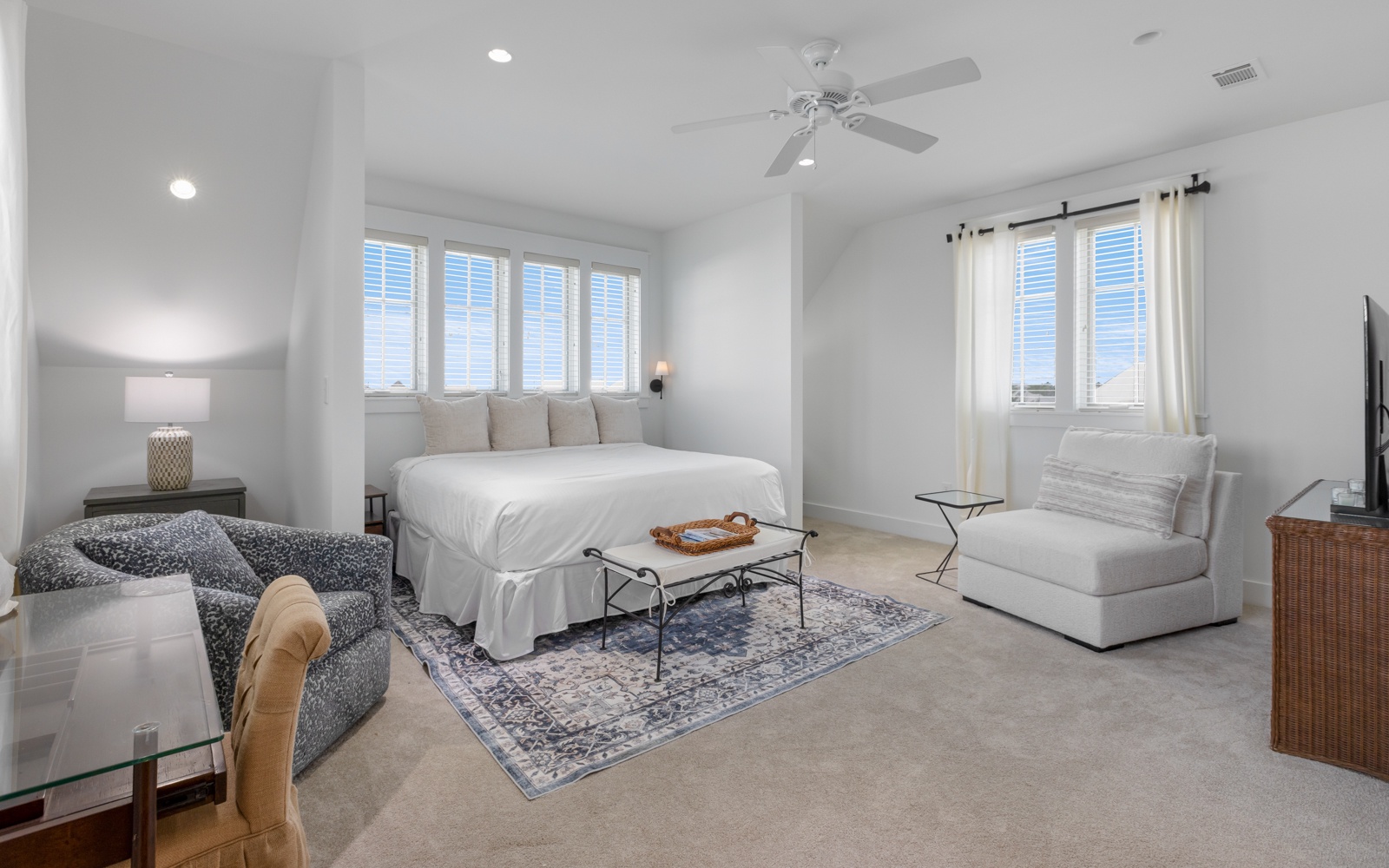 - Primary Suite: King bed, private bath