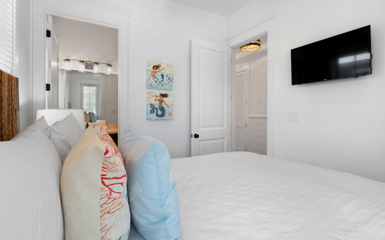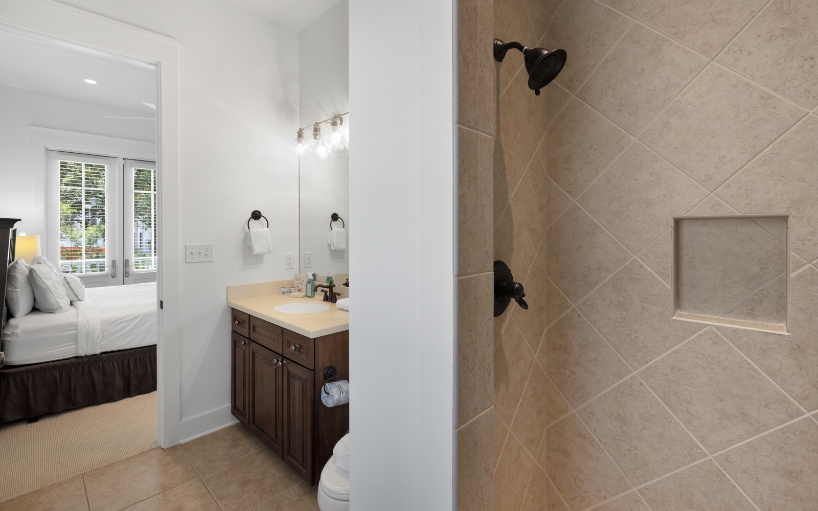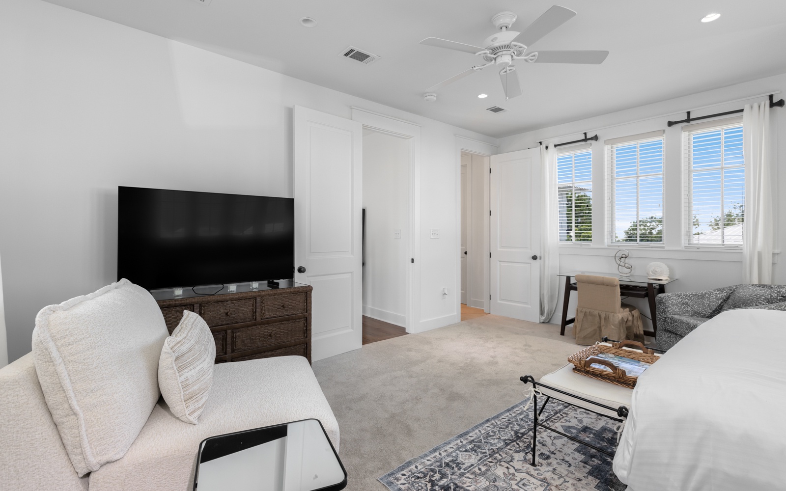 - Primary Suite: King bed, private bath