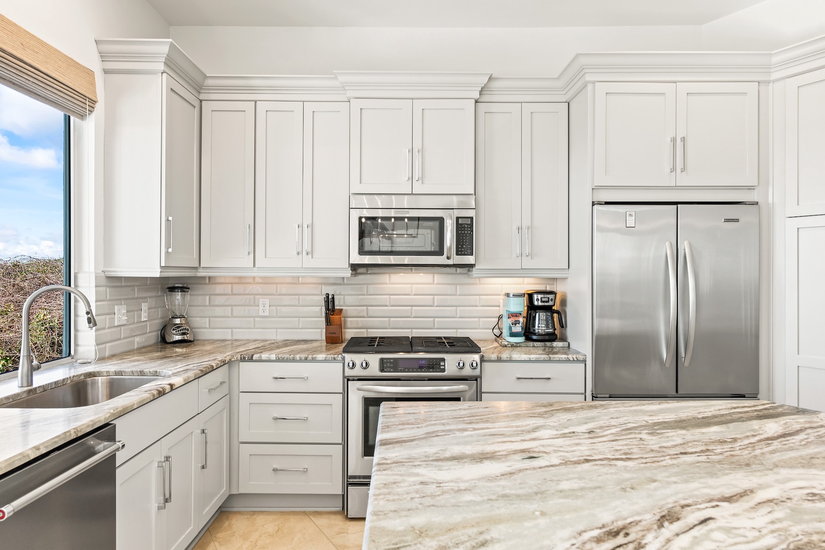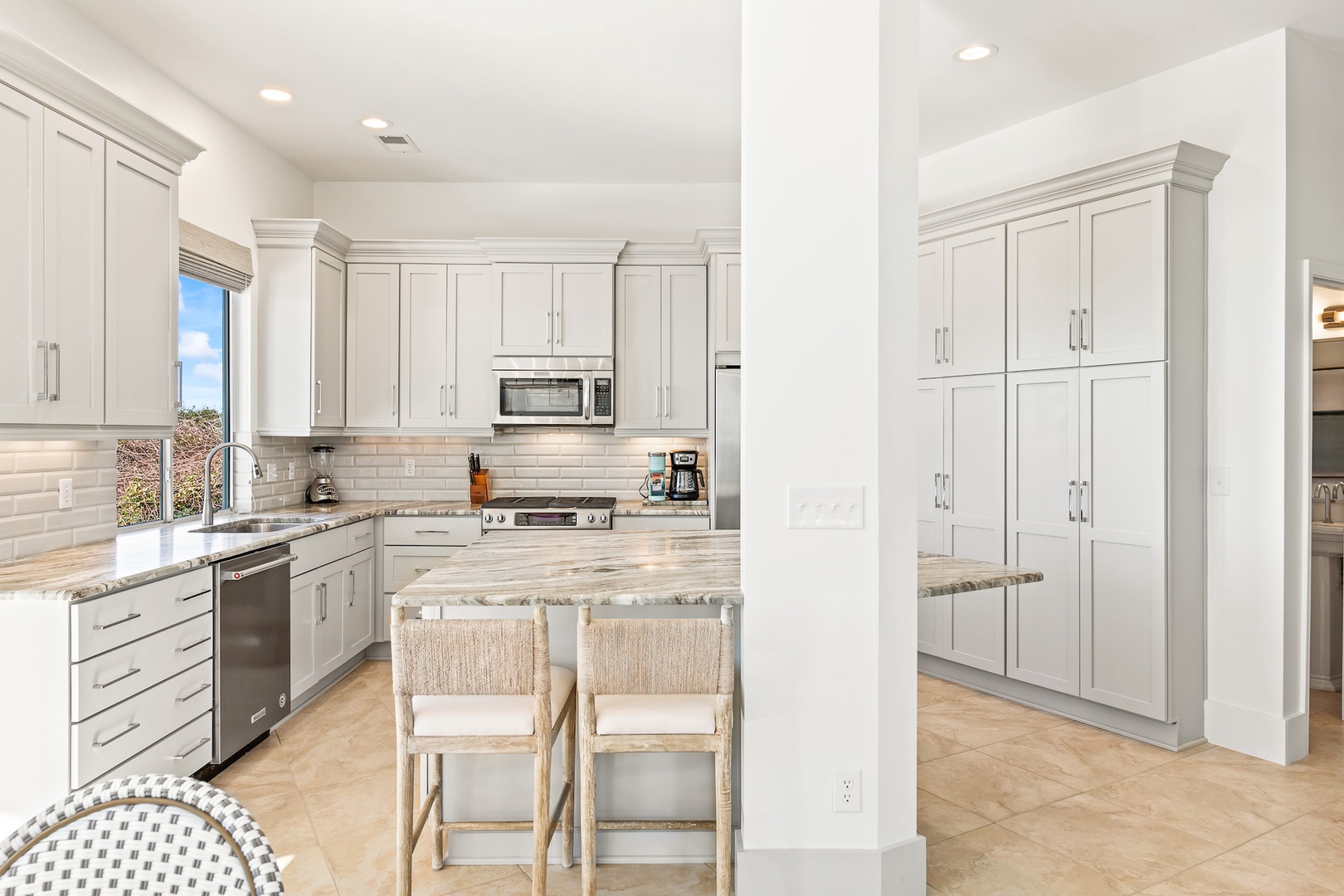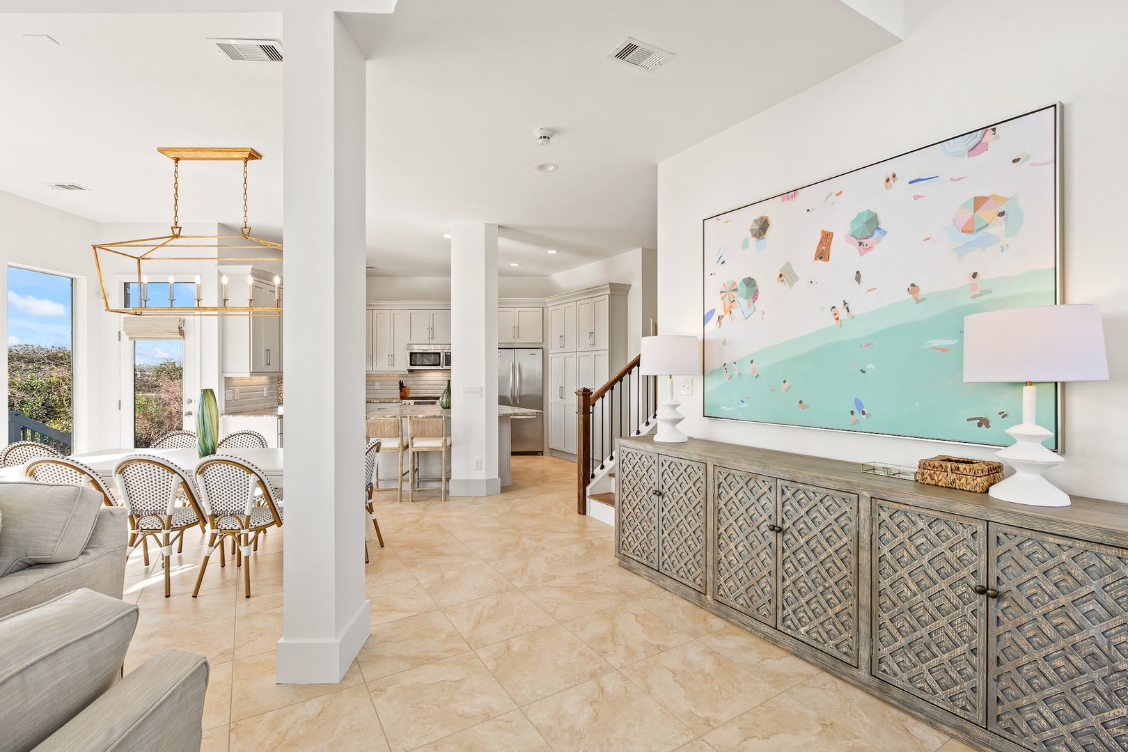 Open and bright, the main level hosts a comfy living area, dining space, and a fully equipped kitchen, ready for waffles, casual snacks, and big family dinners. Step outside onto your beachfront patio and feel the salt breeze any time of day.