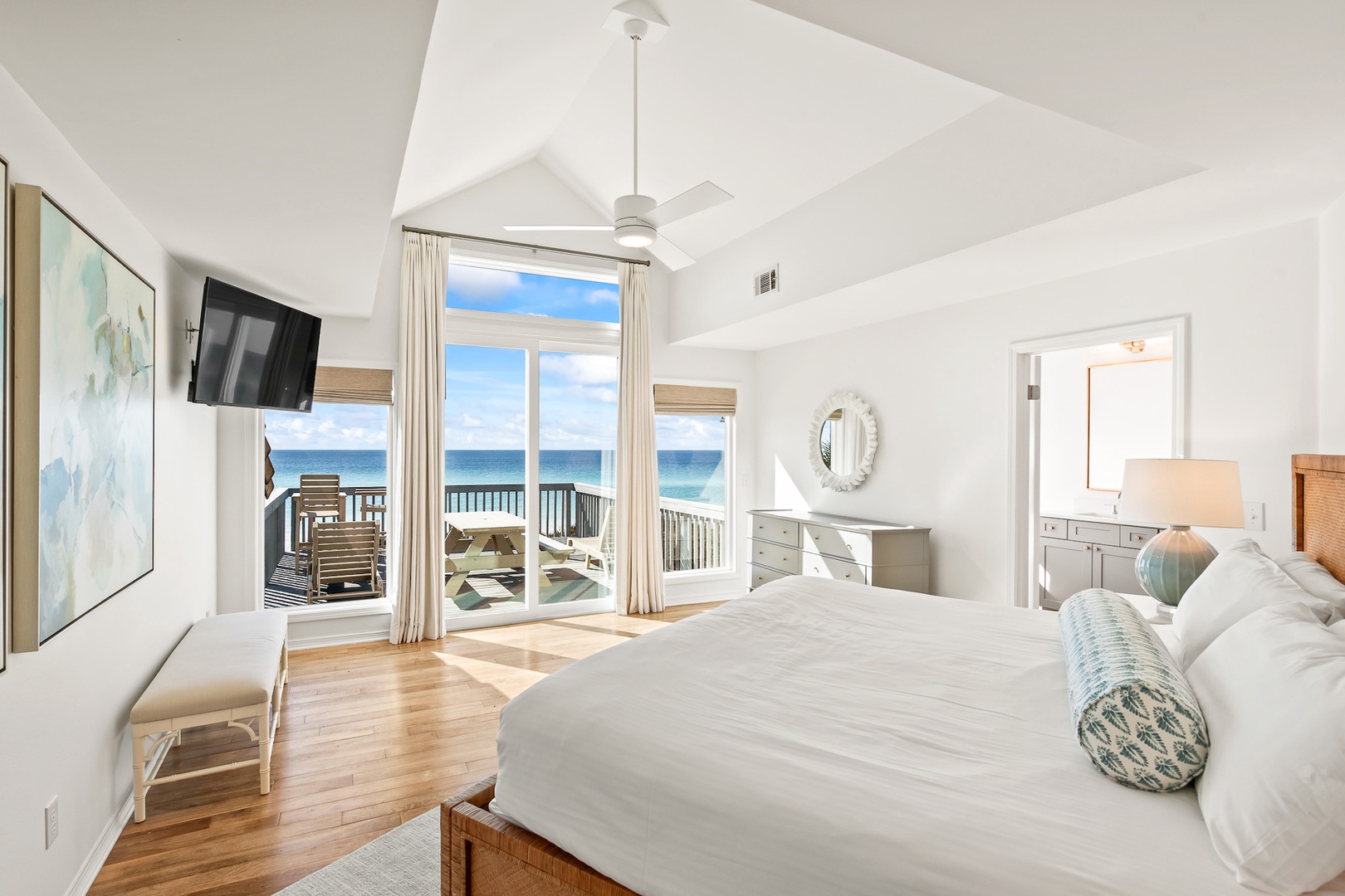 -Primary Bedroom: King bed, private en suite bath, soaking tub, shower, private Gulf-view balcony, TV
