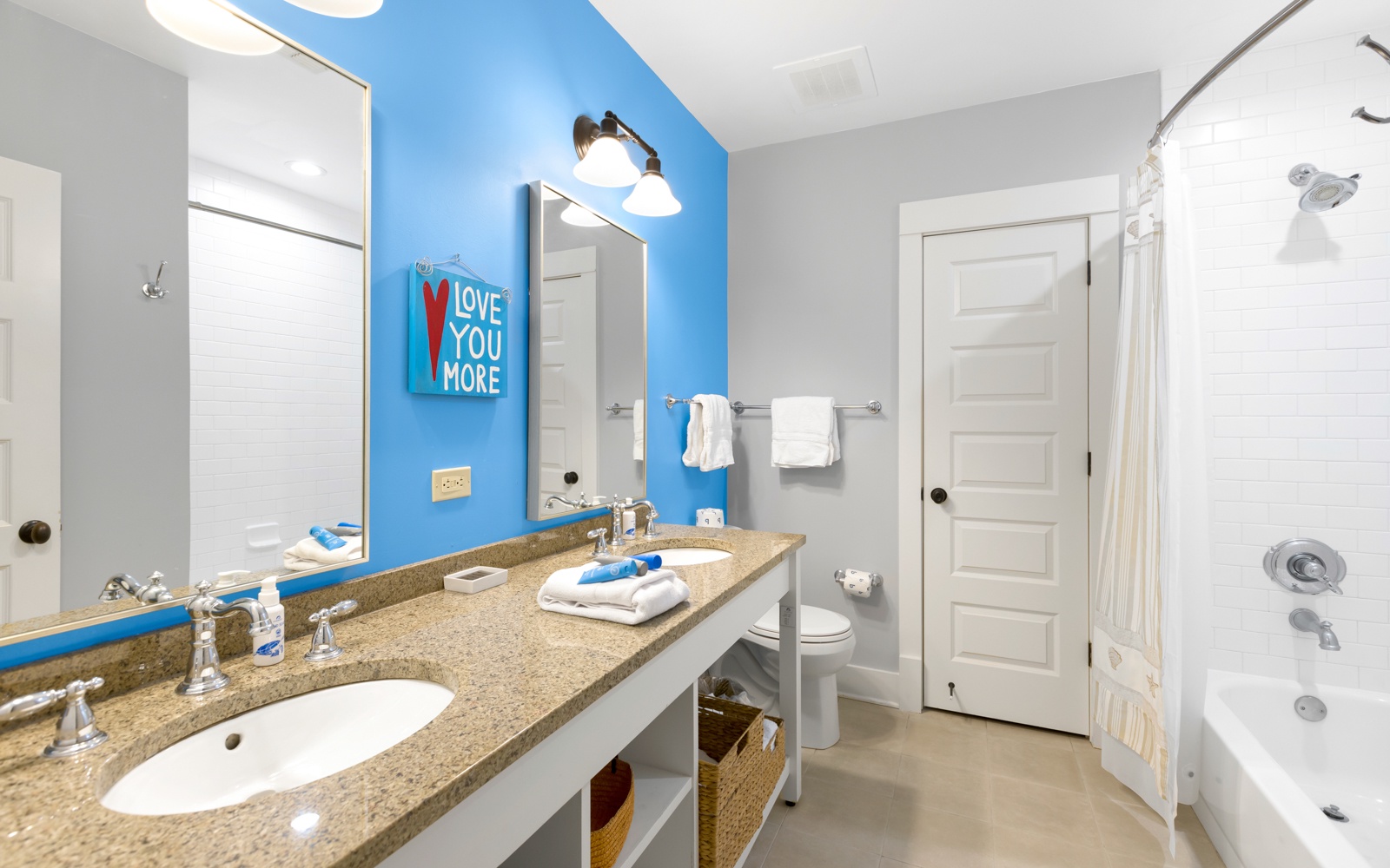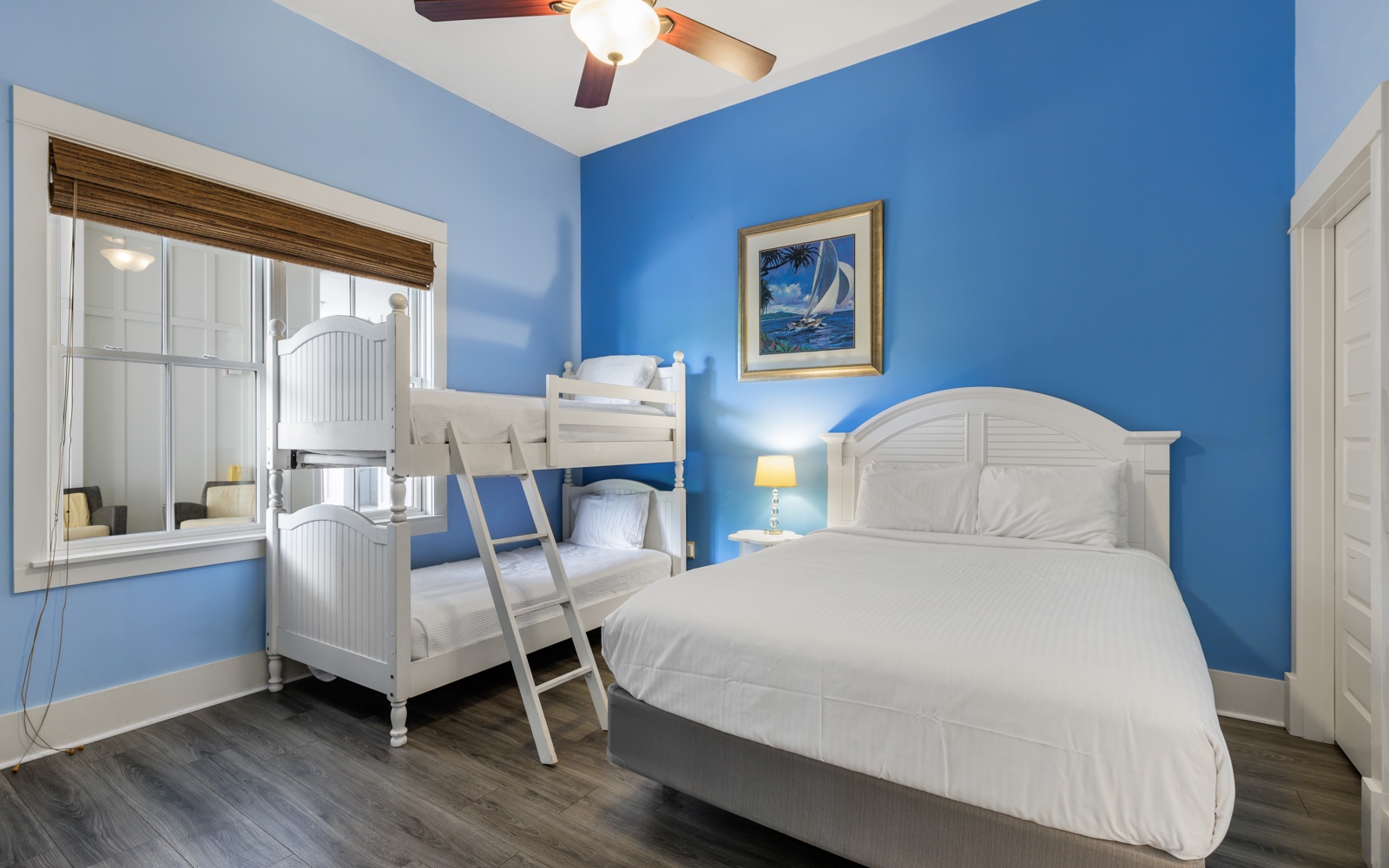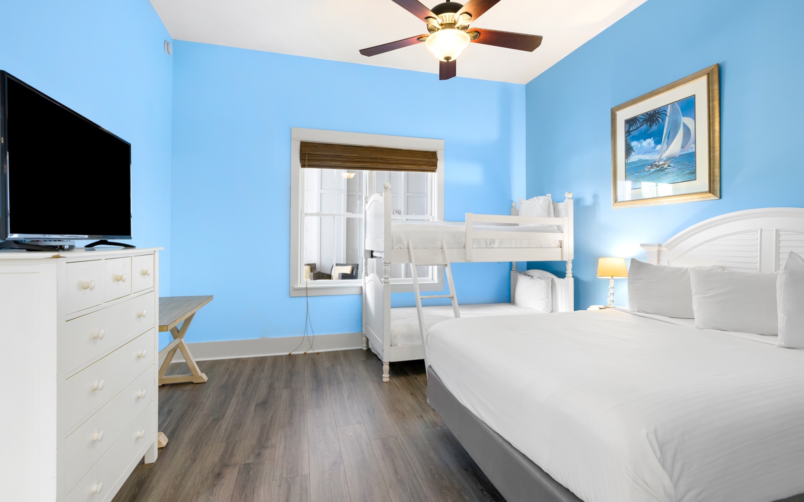 The first guest bedroom features a twin bunk and a queen bed, along with a private bath, tub/shower combo, and dual vanity. The primary bedroom offers a king bed, large TV, and a spacious private bath with a walk-in shower, soaking tub, and dual vanity.