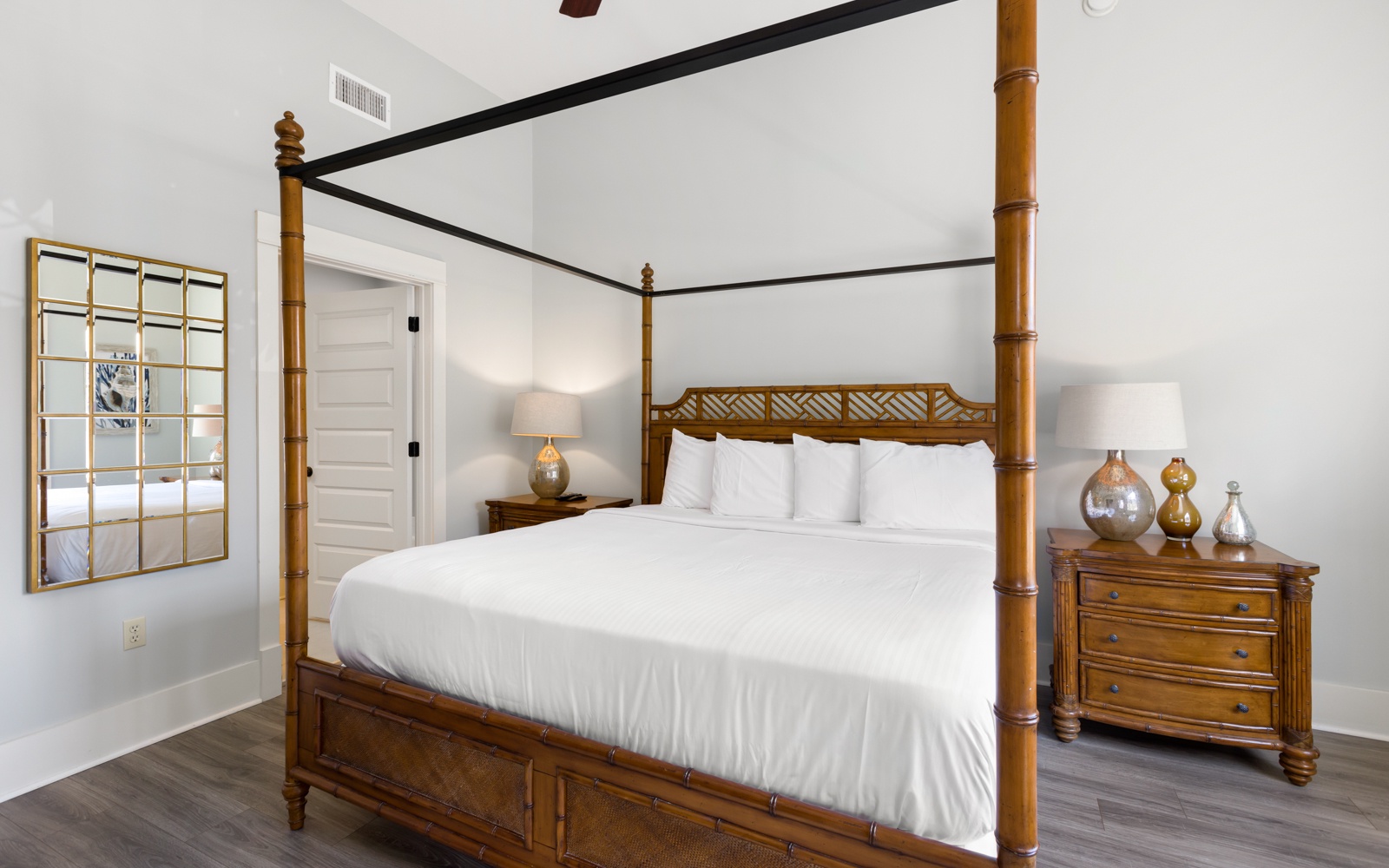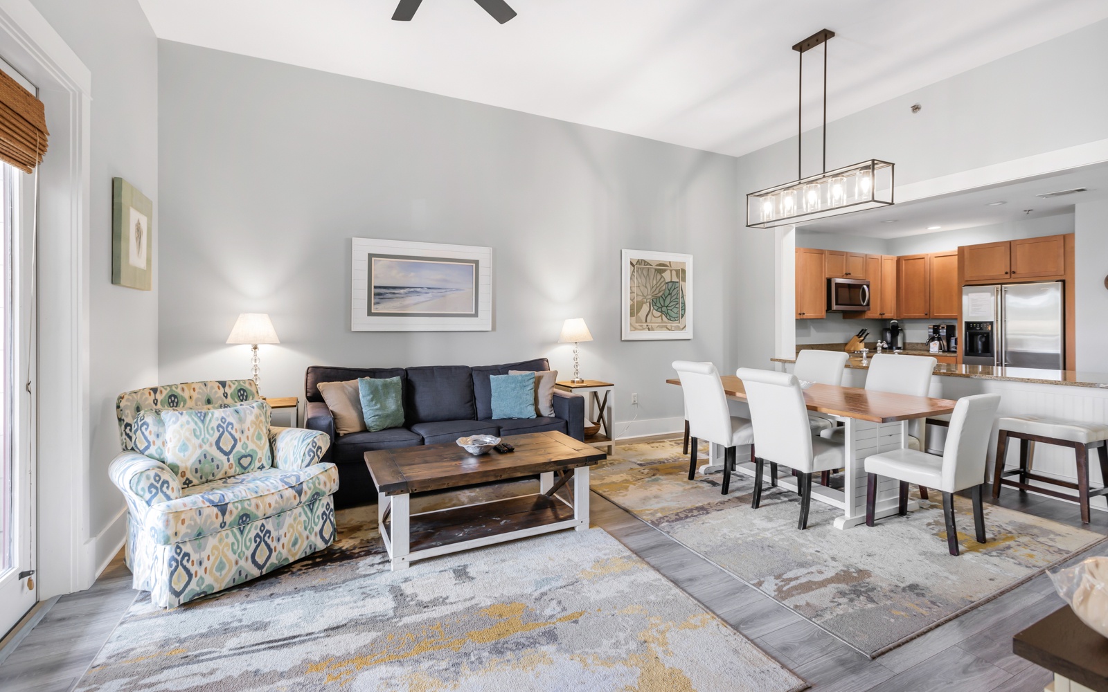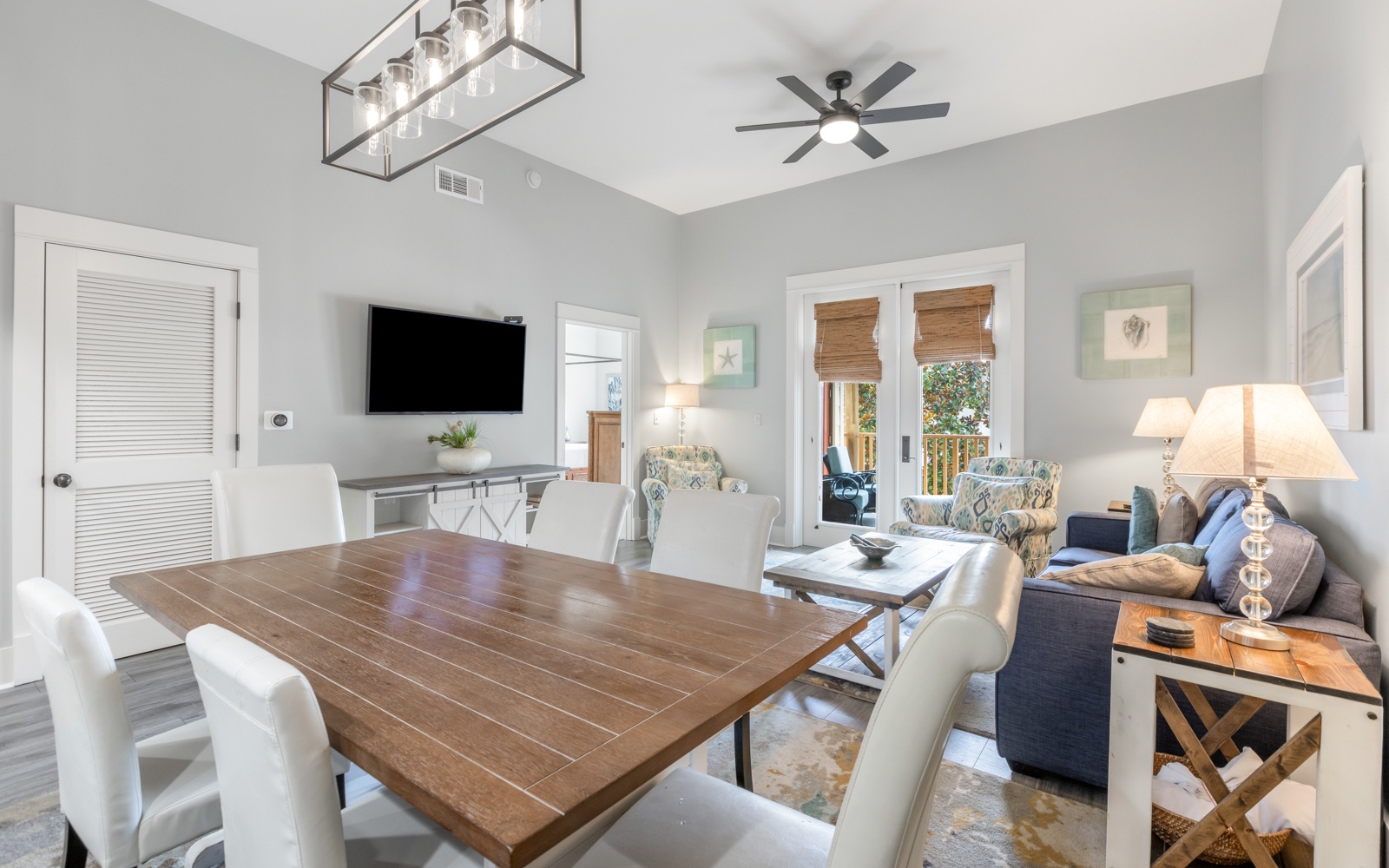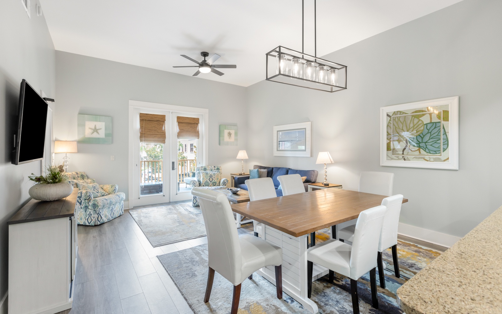 Welcome to Lucky Fins at Redfish Village! Just a short stroll from local gems like Red Fish Taco and Blue Mountain Creamery, this two-bedroom getaway brings the best of 30A right to your doorstep.