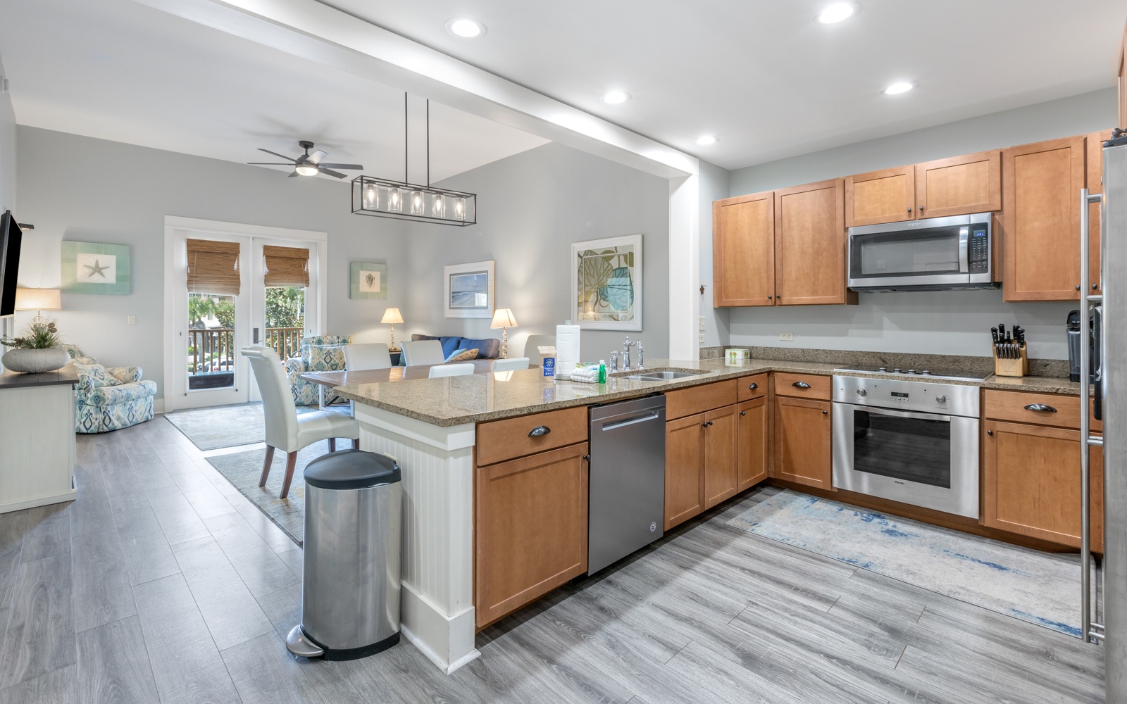 The kitchen is fully equipped with stainless steel appliances and a K-cup coffee maker. The dining area has seating for six, with additional bench seating at the kitchen island.