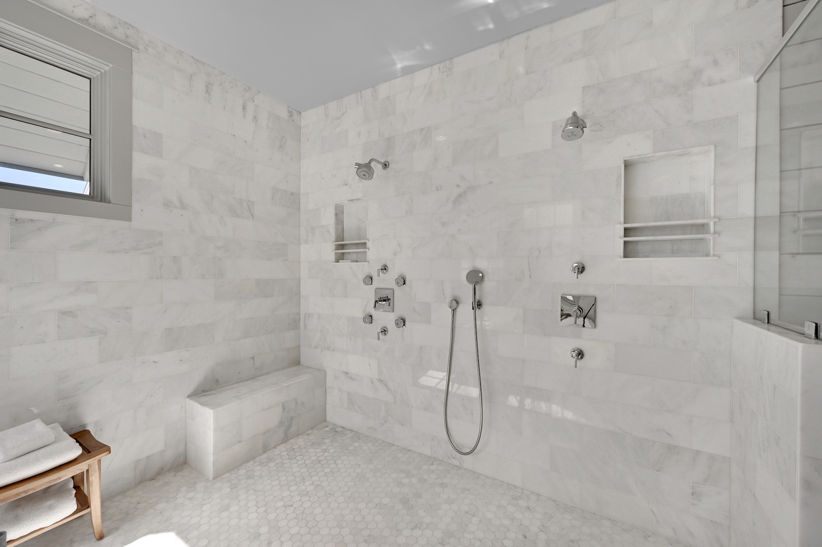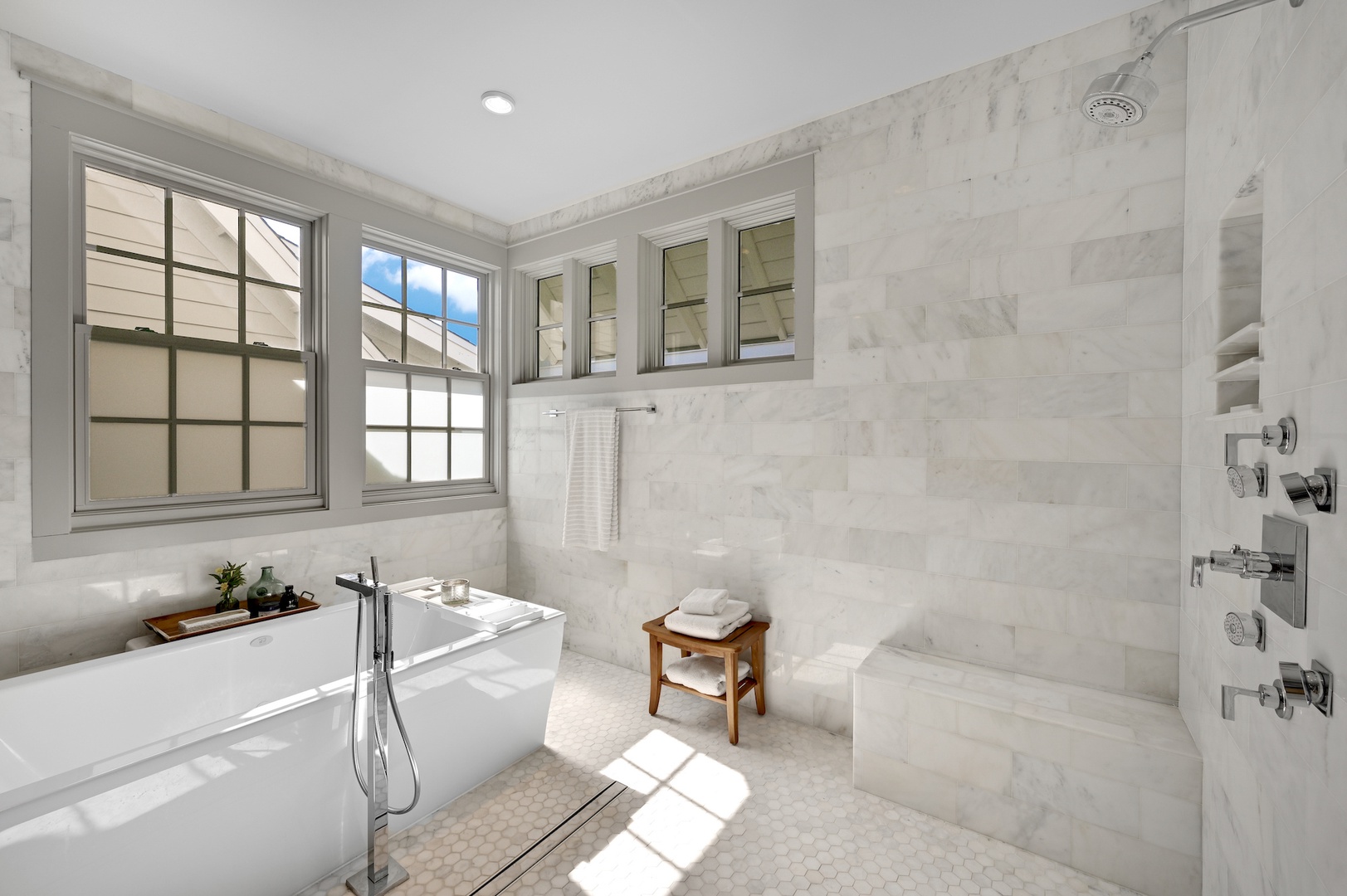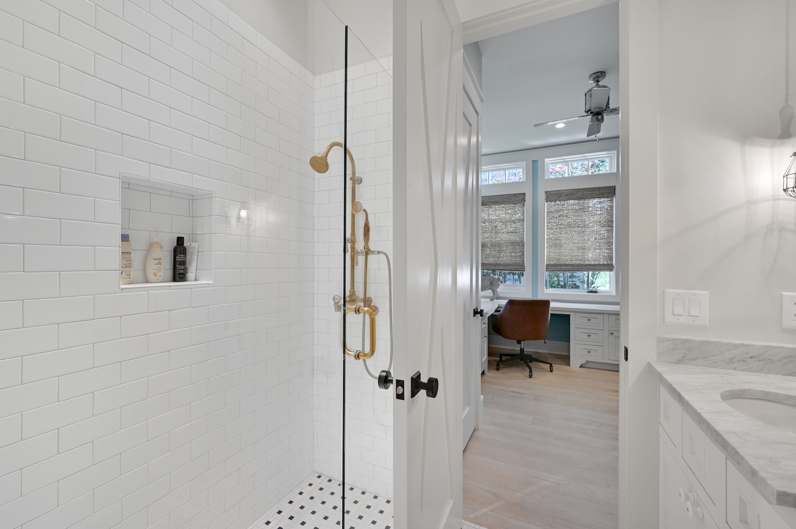Upstairs, the primary suite includes a private sitting area and spa-style bathroom with dual shower and soaking tub.