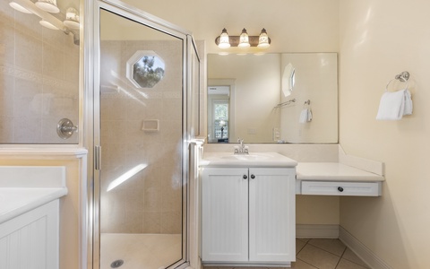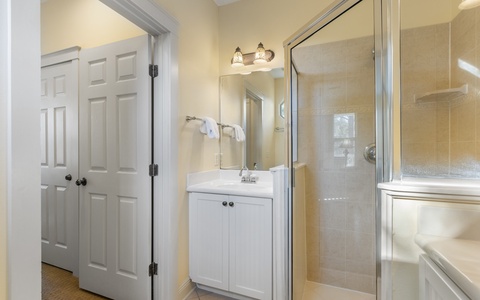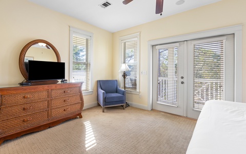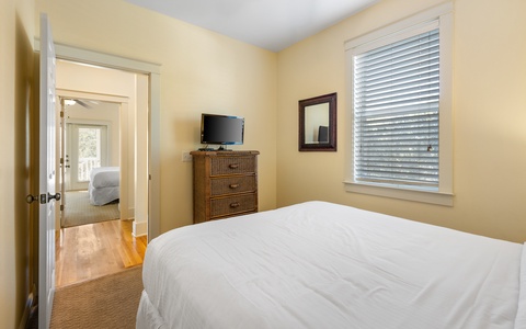 - Primary Bedroom: King bed, private bath, TV (32”)