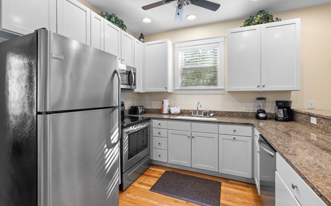 Inside, the main level is open and inviting, with a comfy living area, dining space, and a kitchen that keeps the conversation flowing. A guest room with two twin beds and a hall bath make it great for families.