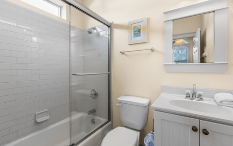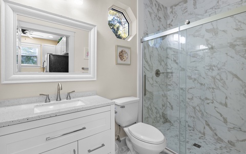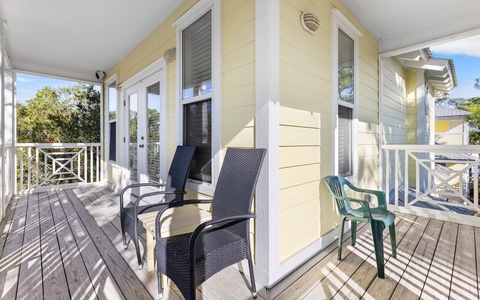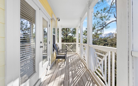Upstairs, the primary suite comes with a private wraparound porch (ideal for slow mornings with coffee), while the guest rooms has its own full bath.