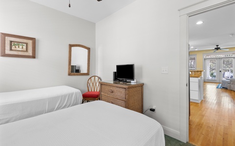 - Guest Room: 2 twin beds, shared bathroom, TV (24”)