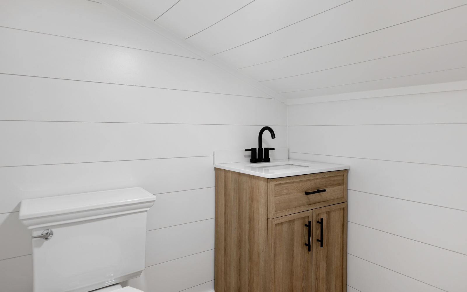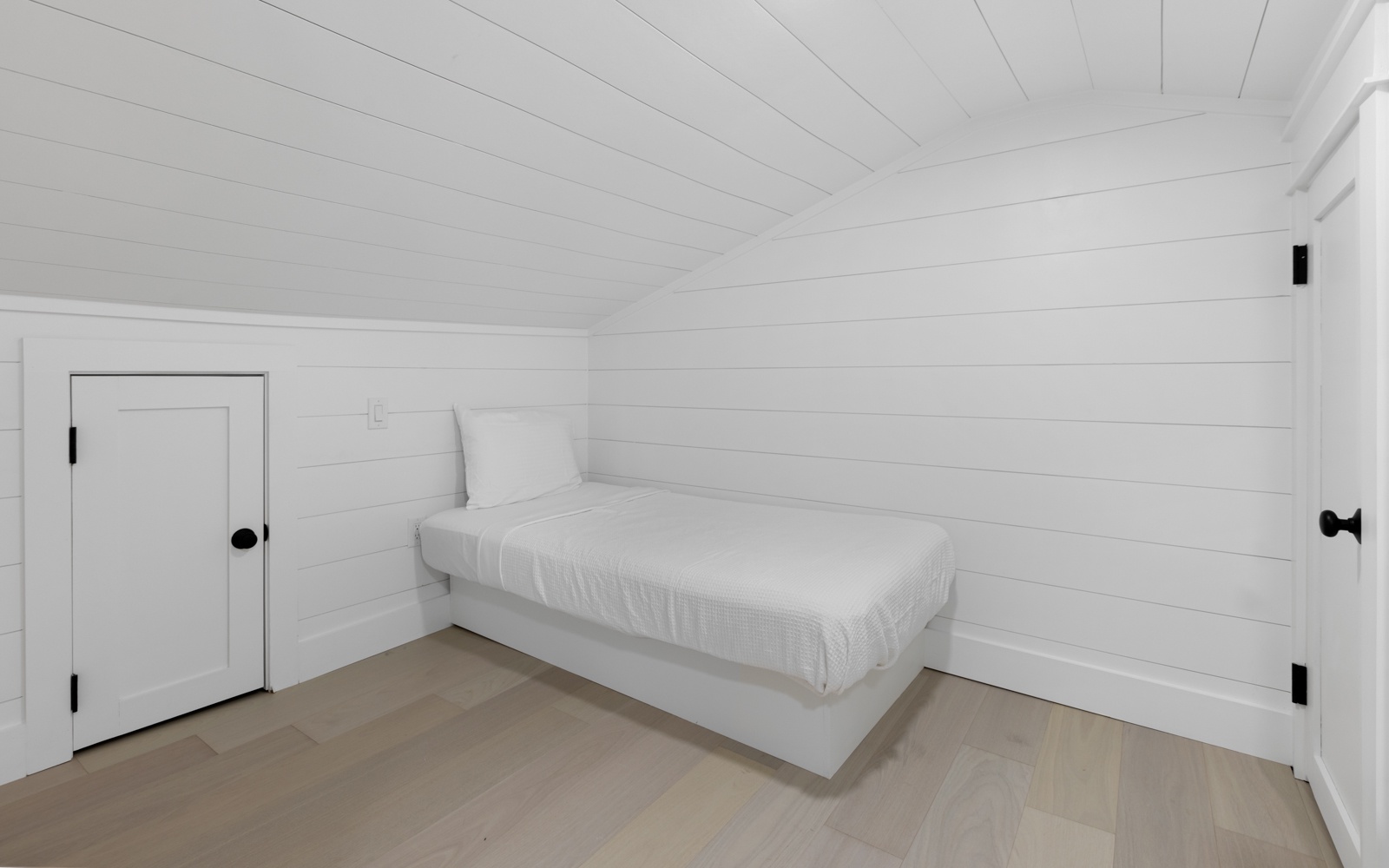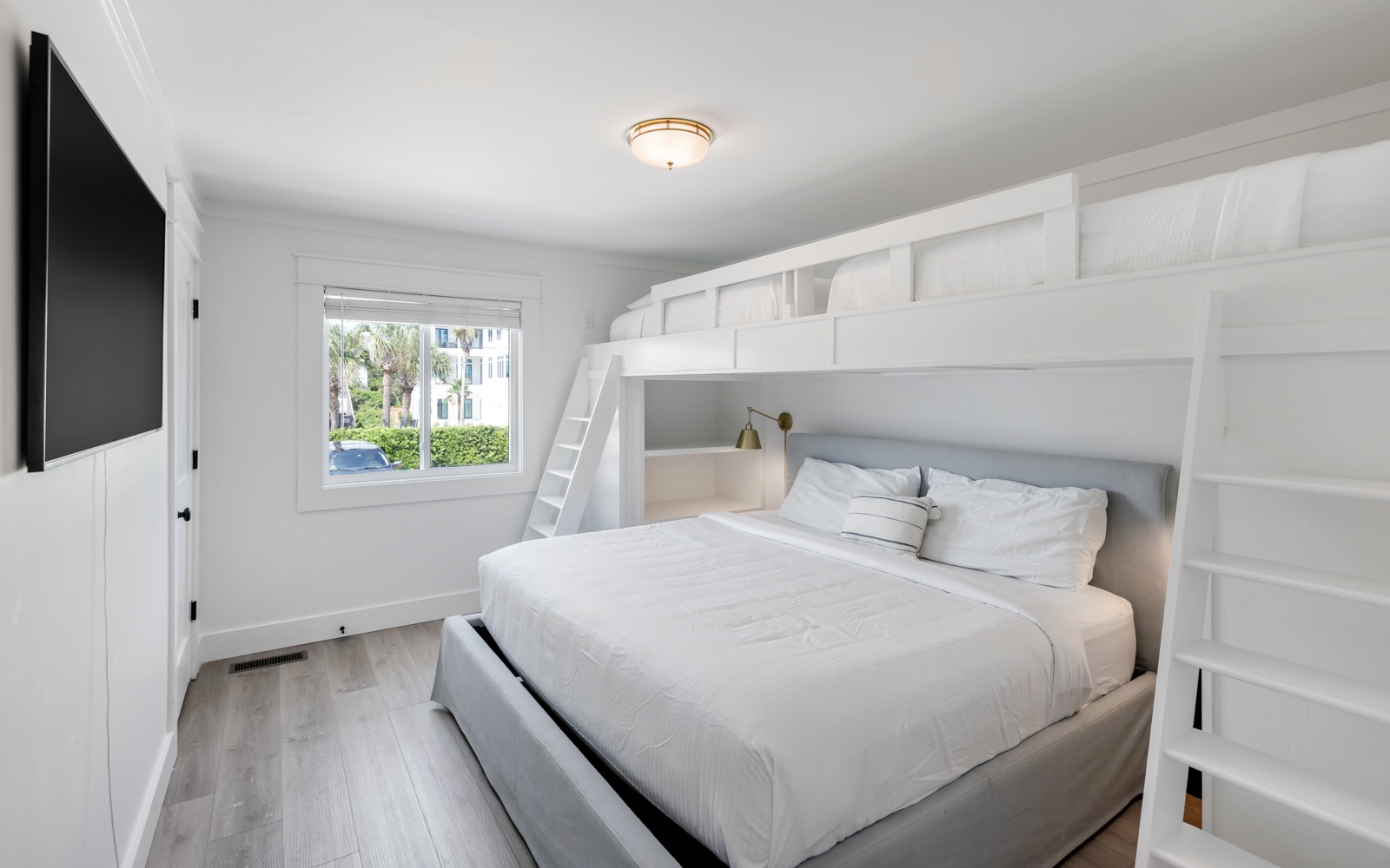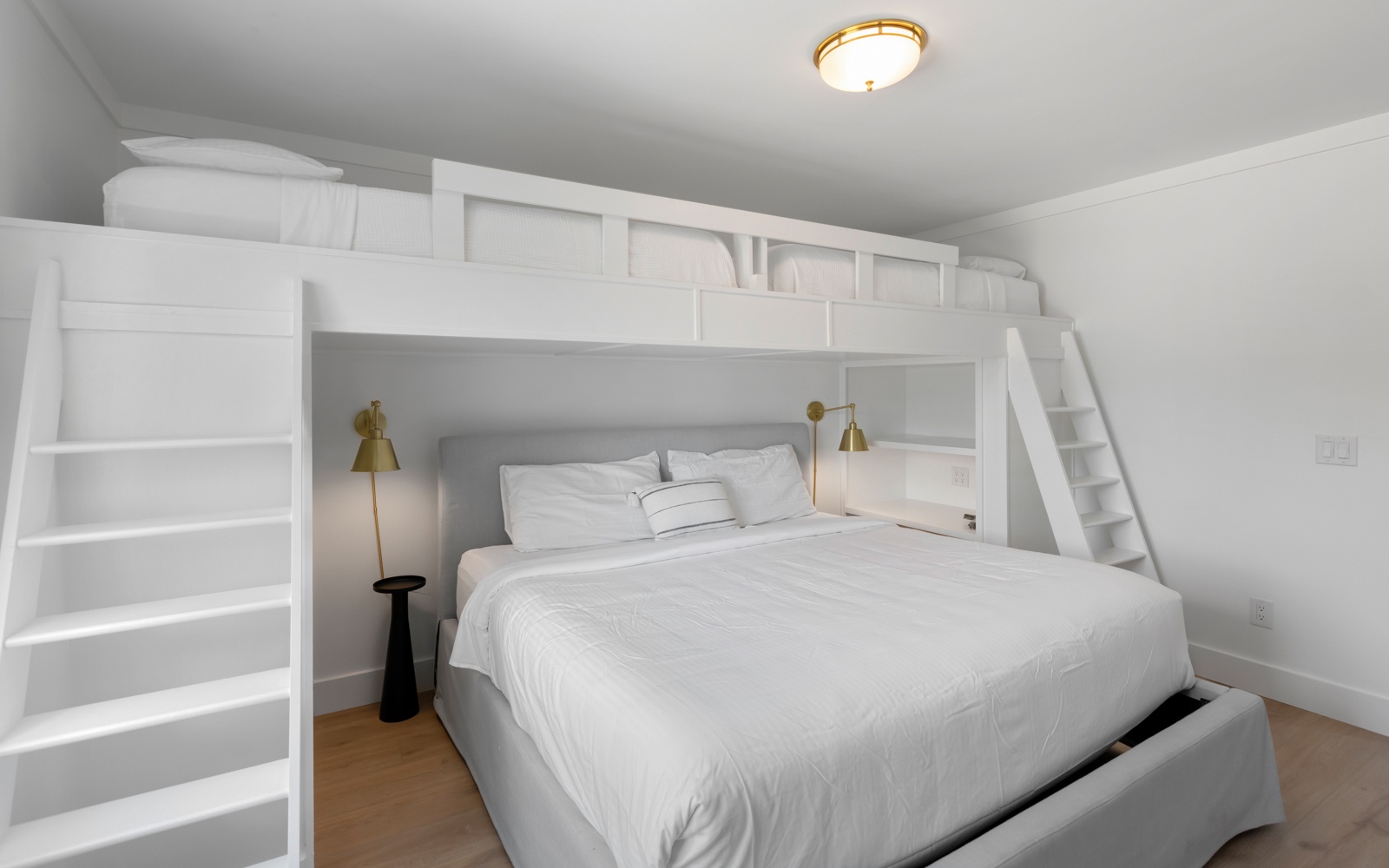 Another guest bedroom, king, also has its own private bath. A ladder leads to the third-floor bonus room, which has a full and twin bed, ideal for extra guests or kids.
