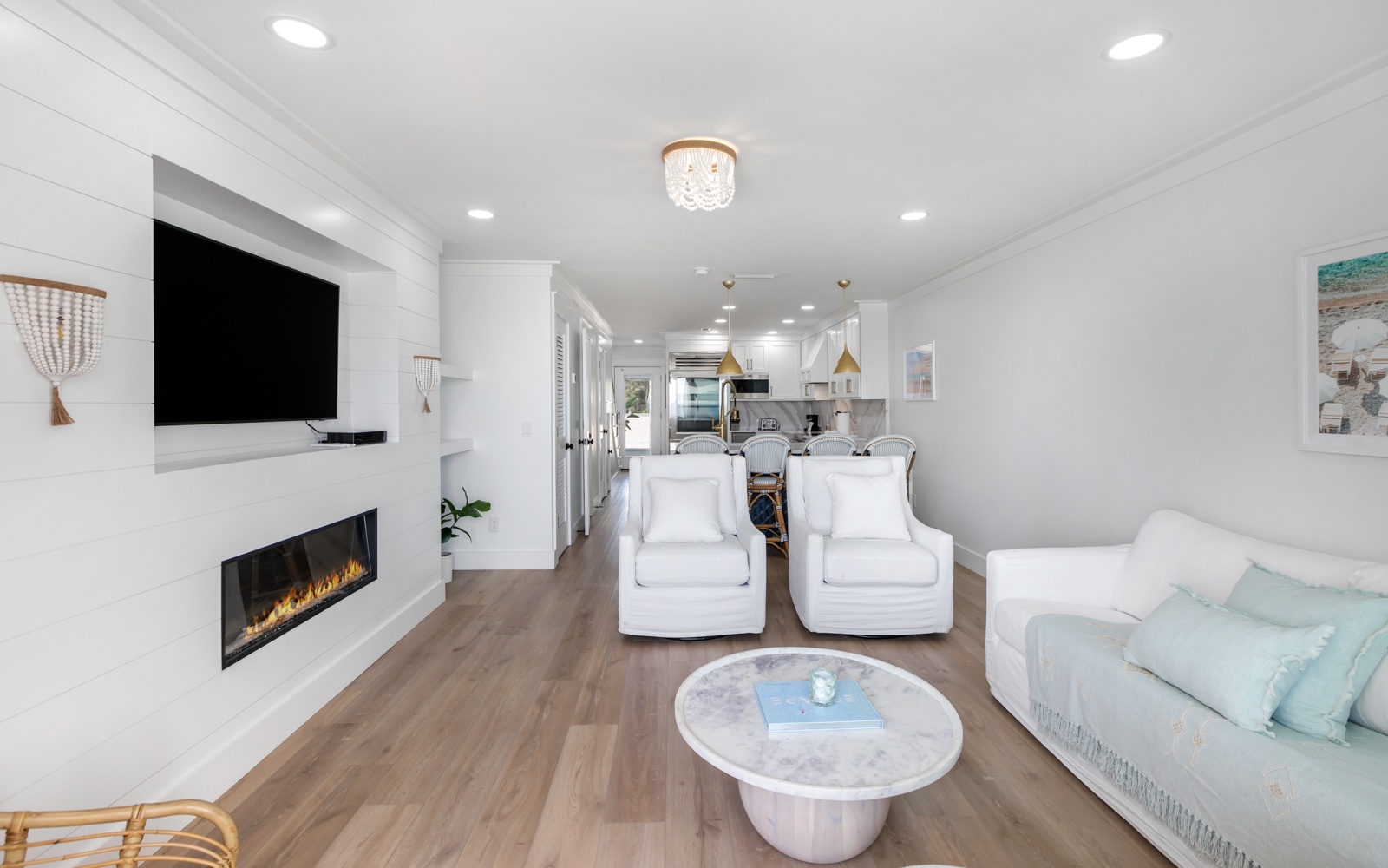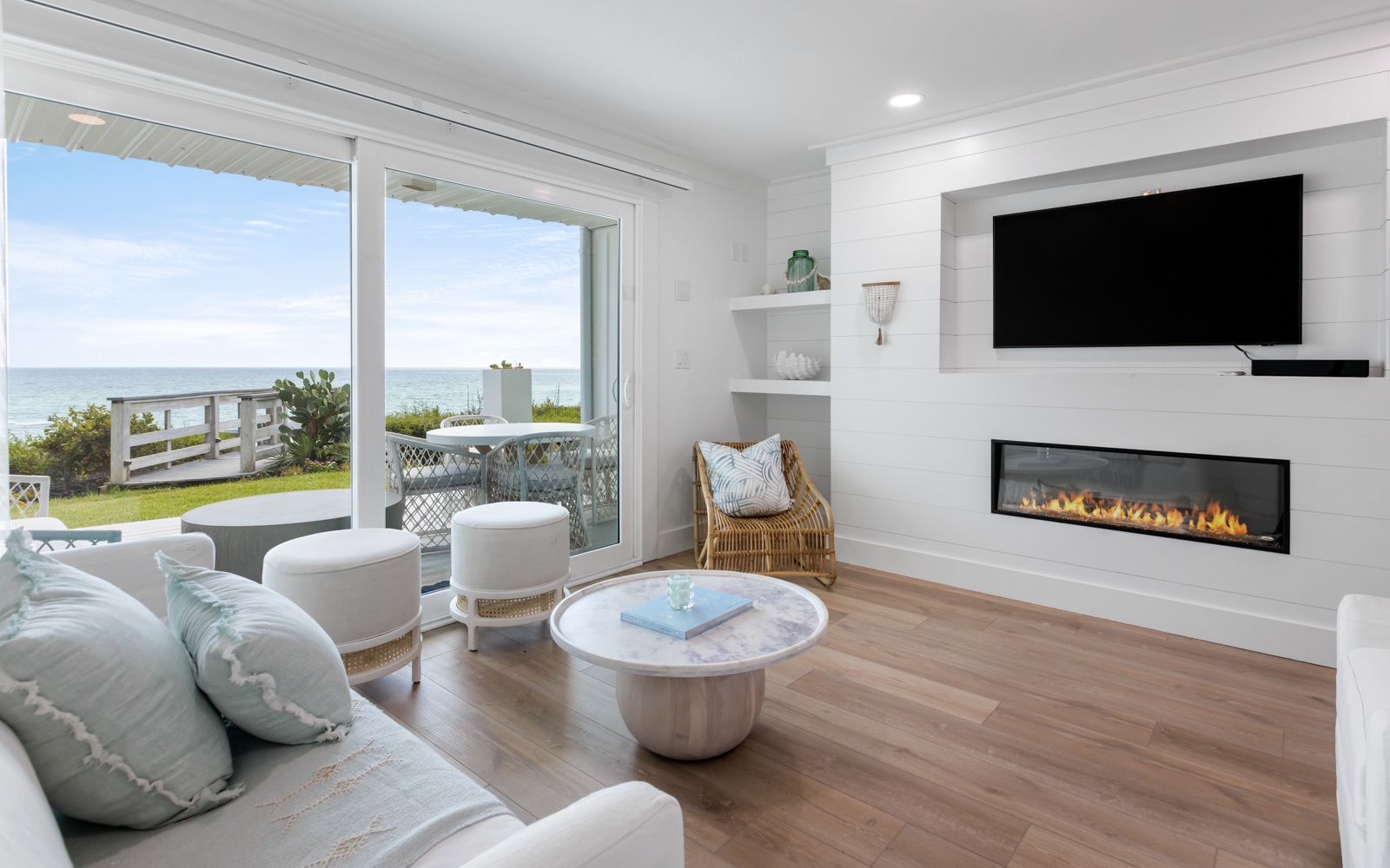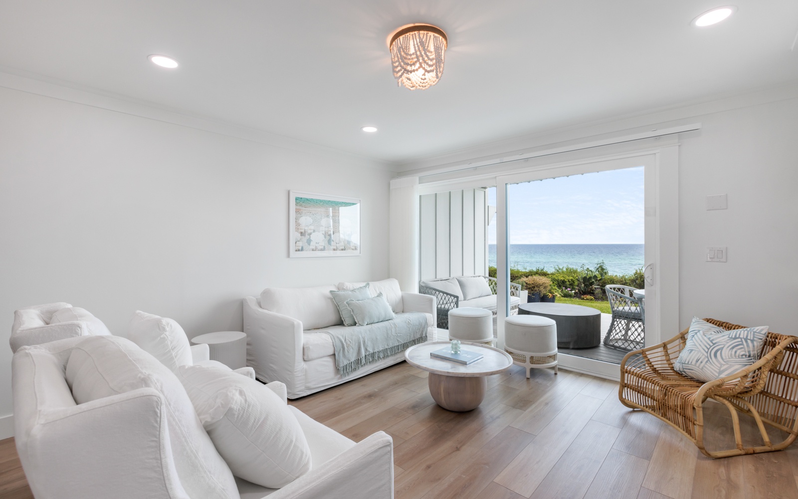 Step outside through the sliding glass doors to a beachfront patio with a dining area and cozy seating—your perfect spot to unwind. Stunning.