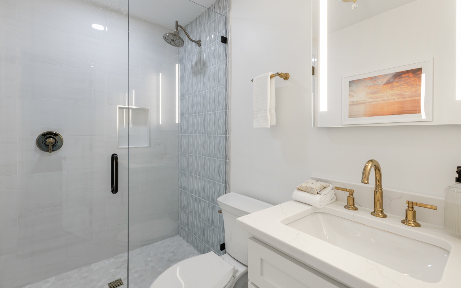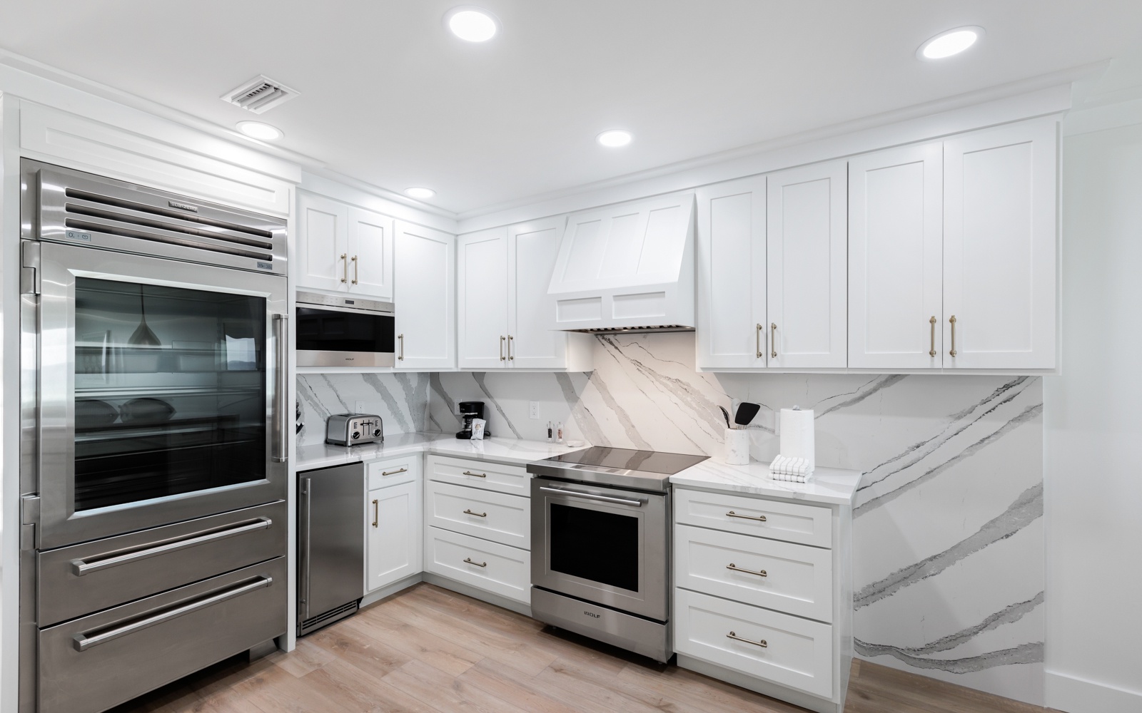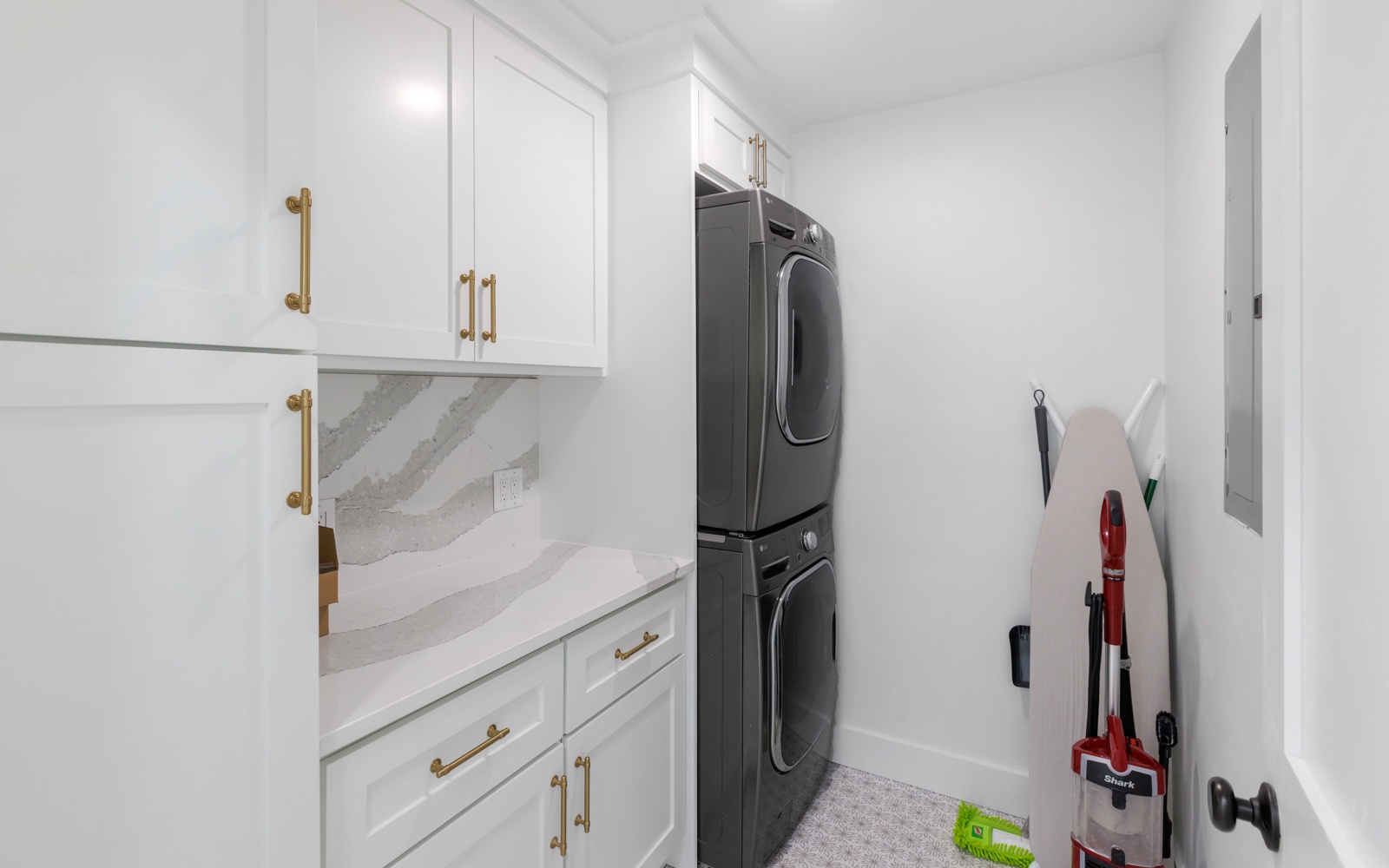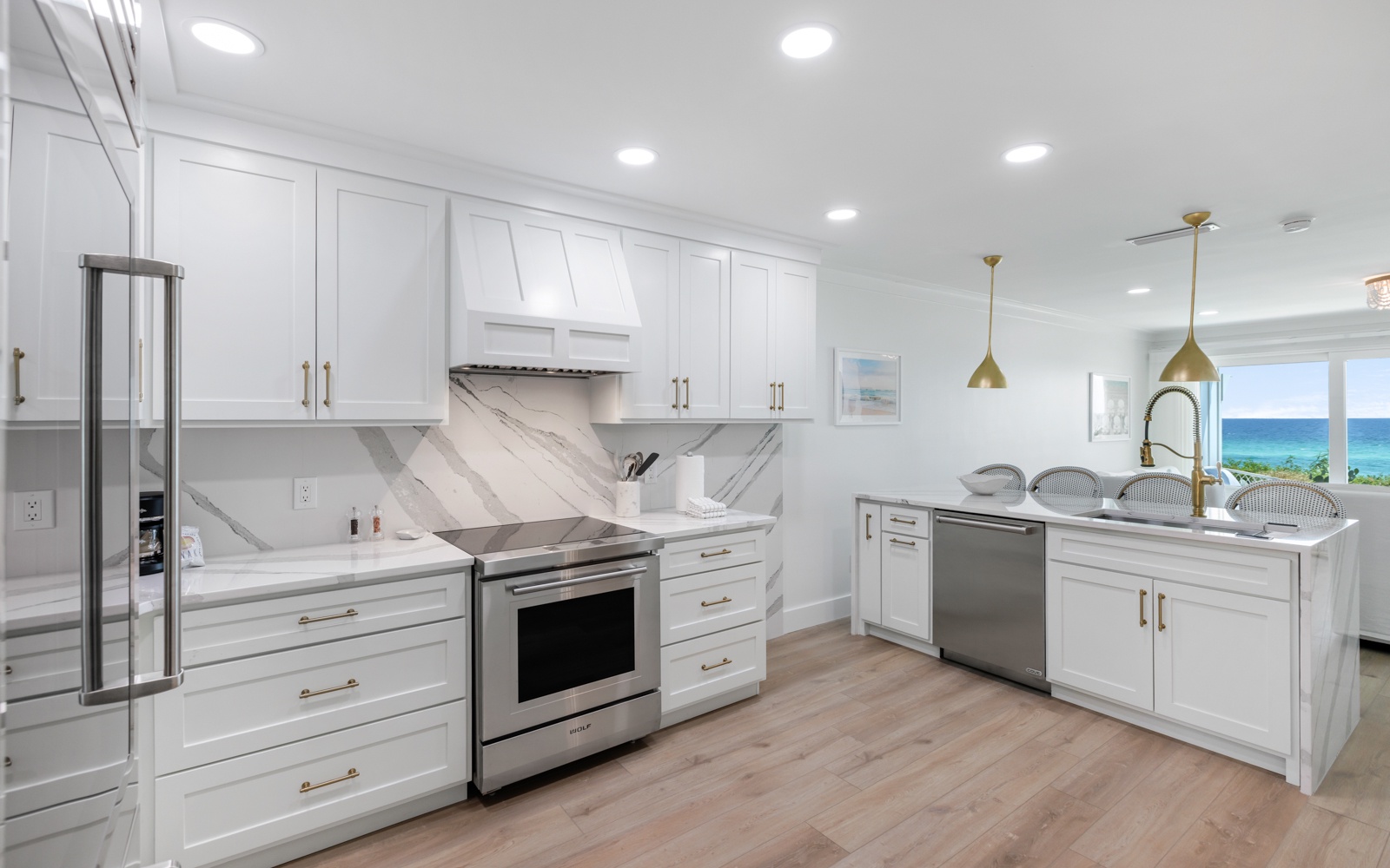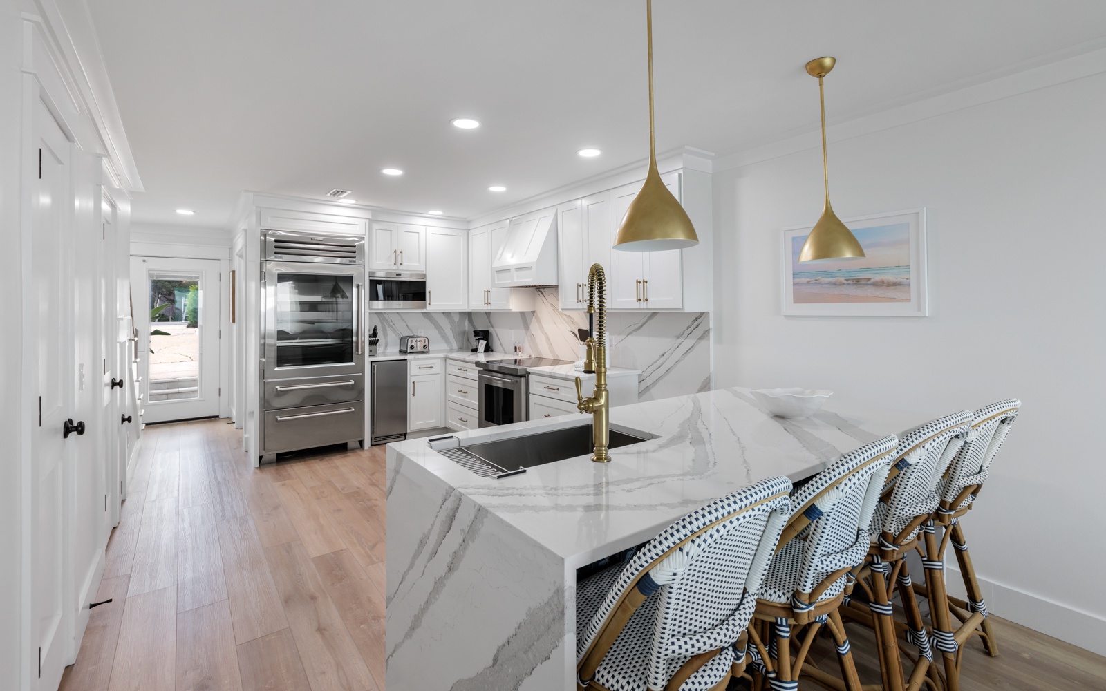 On the main level, you’ll find a half bath and a laundry room. The chef's kitchen comes fully equipped with marble countertops, Wolf and Sub-Zero appliances. The living room, with its 65-inch smart TV, opens up to stunning Gulf views.
