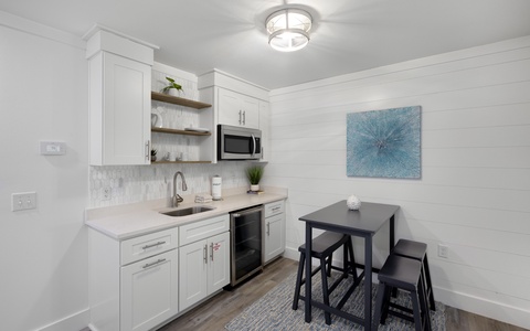 The first floor includes a primary suite with a king bed and walk-in shower, plus a guest room with a queen bed and en suite bath. Upstairs, there are three more bedrooms and a handy kitchenette.