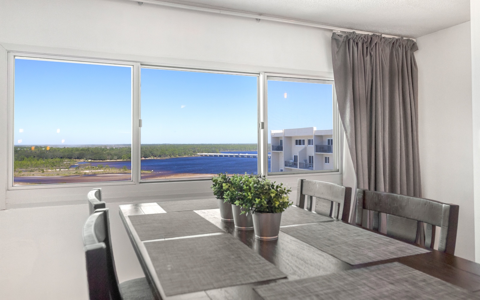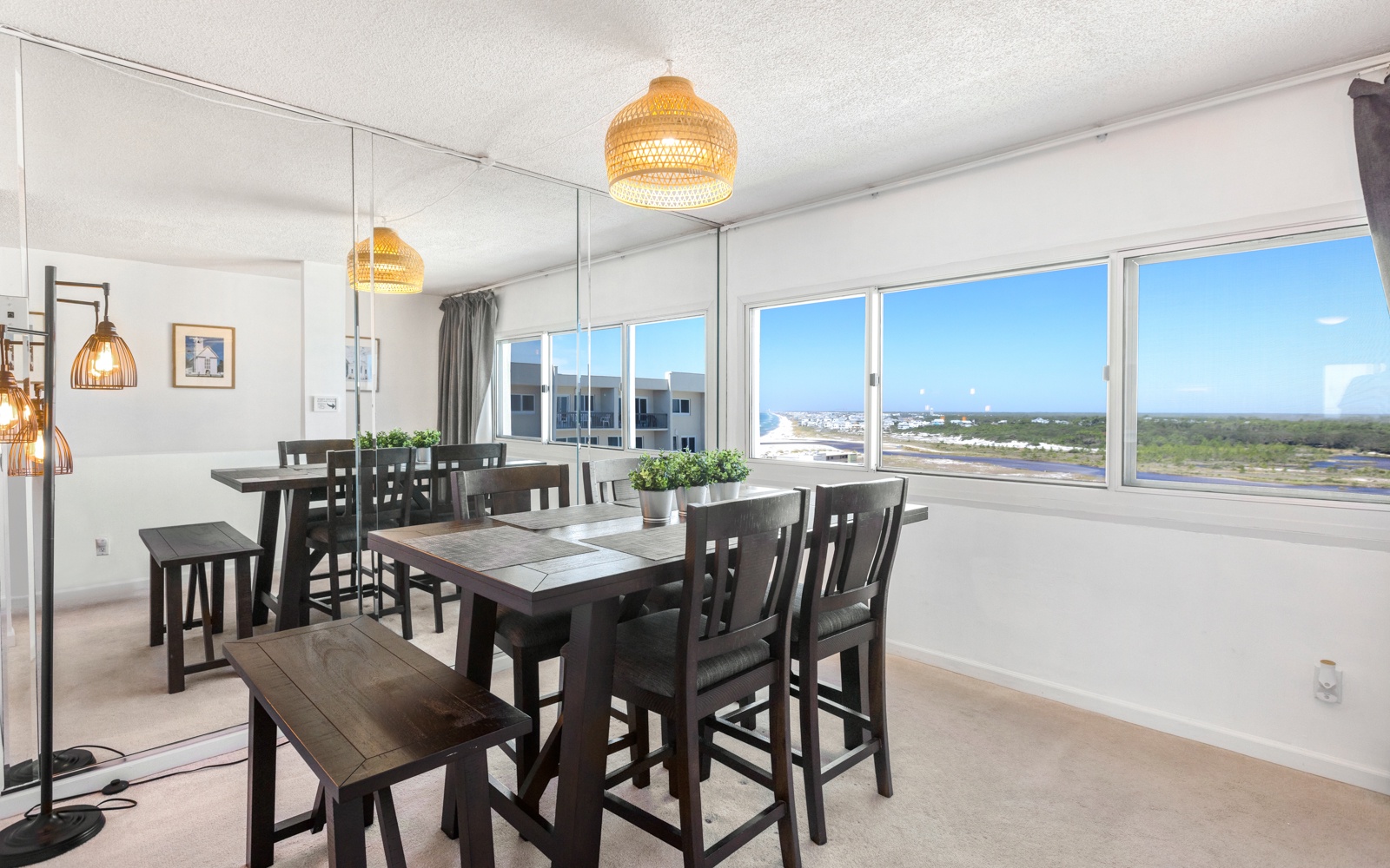 Soak in the sun and keep an eye out for dolphins on the 11th-floor, yoga-friendly balcony. Or finish up some work on the vintage writer's desk. The dining room offers panoramic views of the dune lake and forest at Camp Helen State Park.