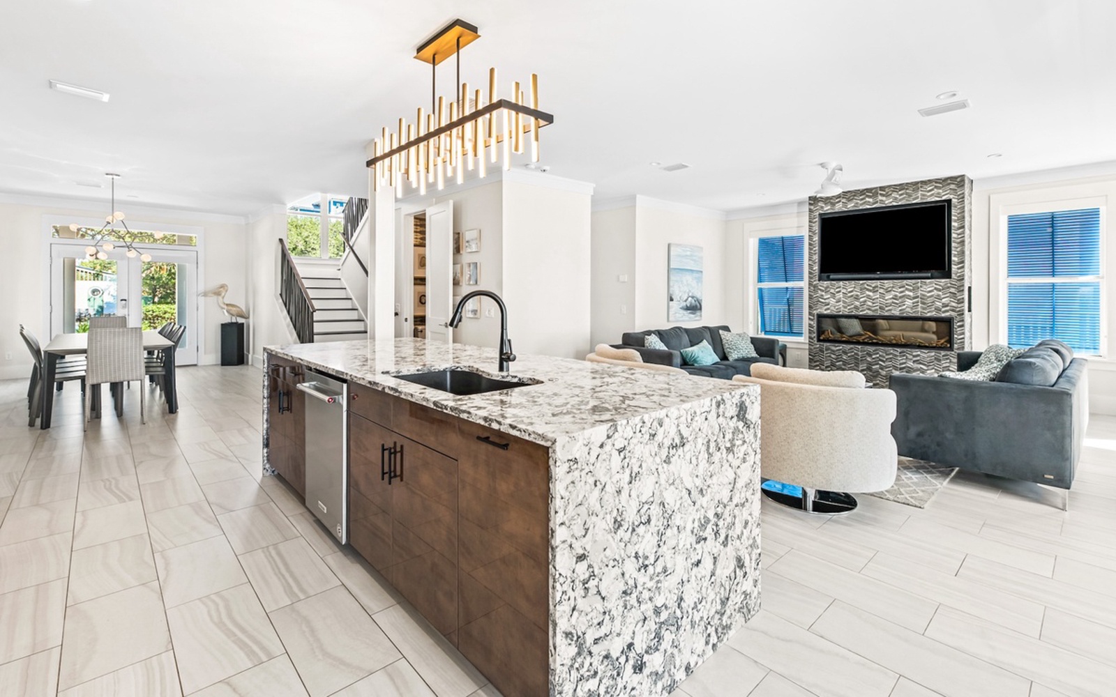 Check out these stunning interiors. The home has definite upscale vibes with colorful design and a convenient layout. The first level revolves around an impressive island in a kitchen that has everything you need to create quick breakfasts and unhurried dinners. With gulf views, cooking feels more like part of the vacation.