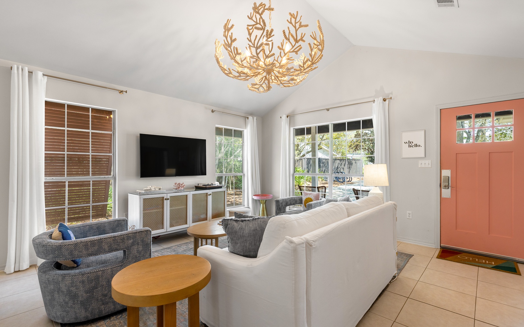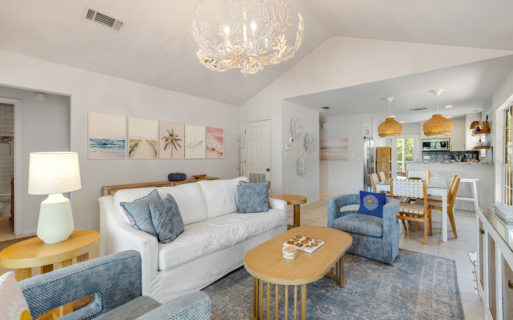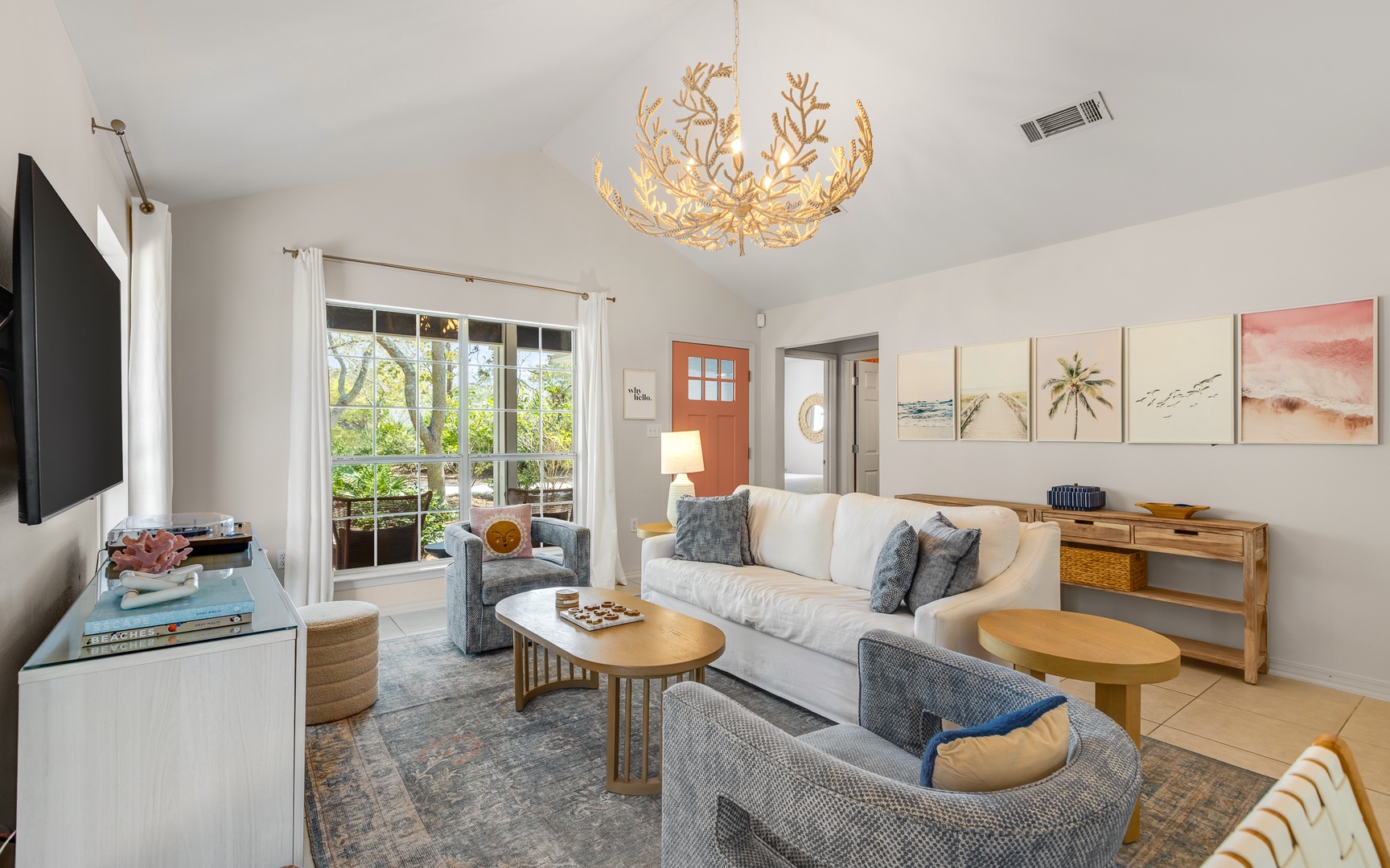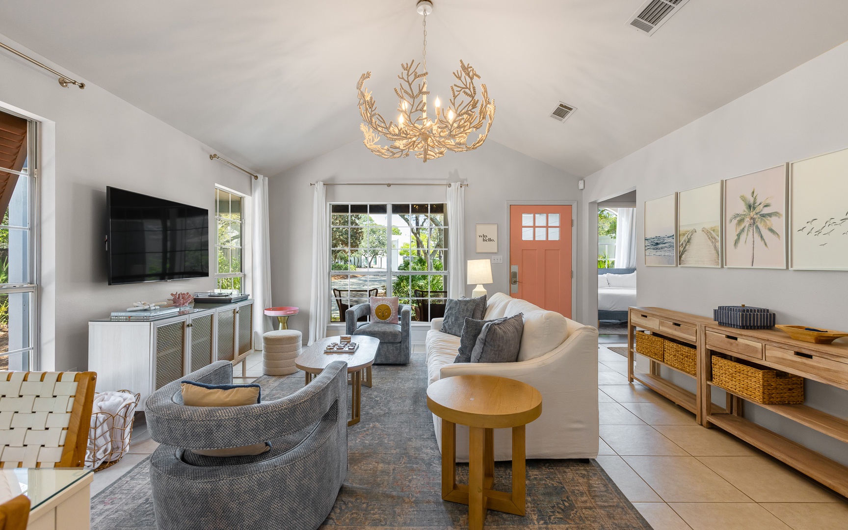 Inside, this coral and blue jewel, a very unique and charming home, features a cozy living area with a smart TV, a fully equipped kitchen, and comfortable sleeping arrangements for up to 10 guests.