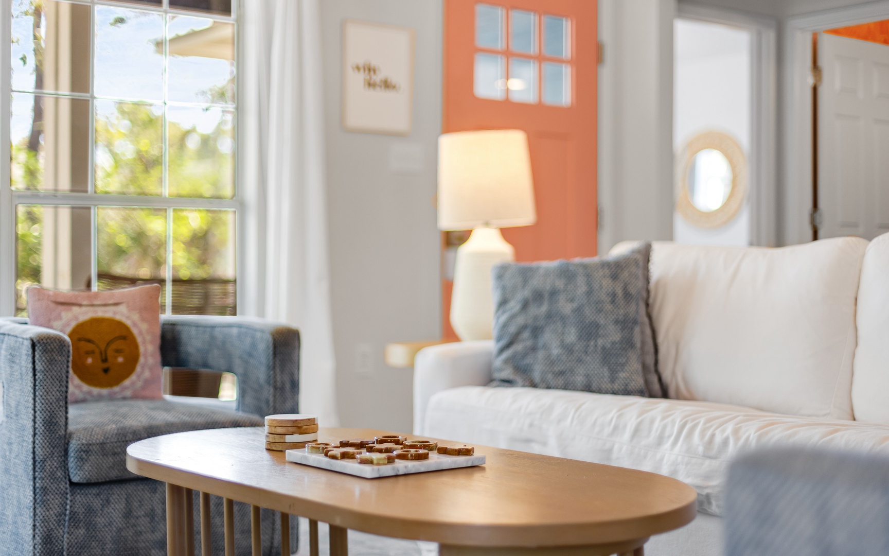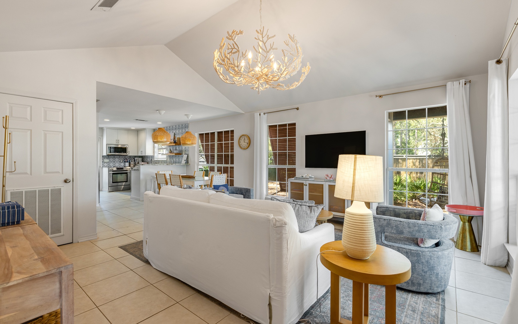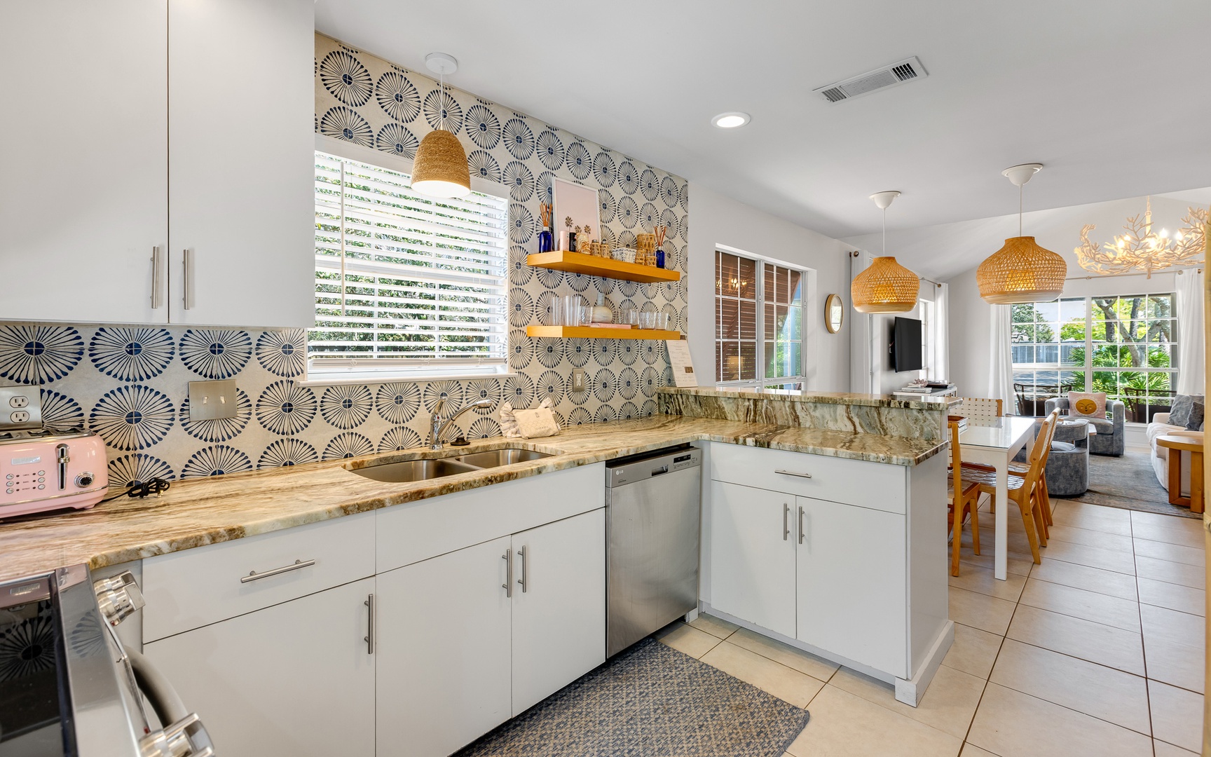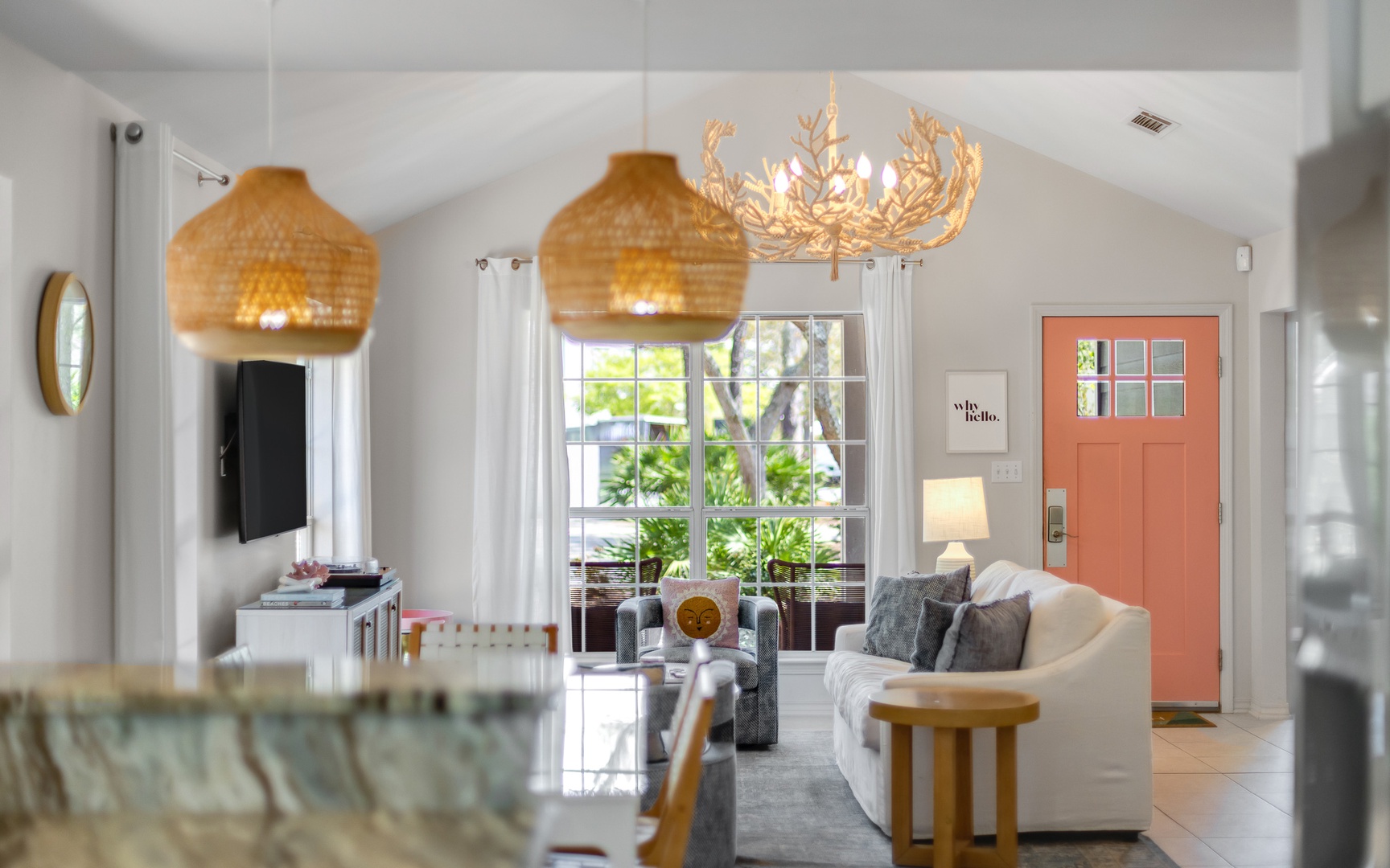 Inside, this coral and blue jewel, a very unique and charming home, features a cozy living area with a smart TV, a fully equipped kitchen, and comfortable sleeping arrangements for up to 10 guests.