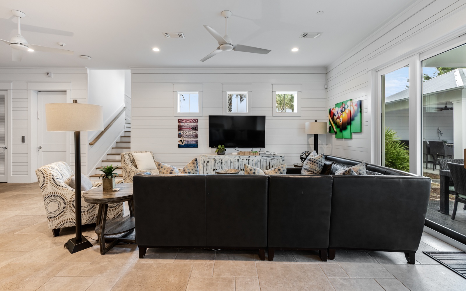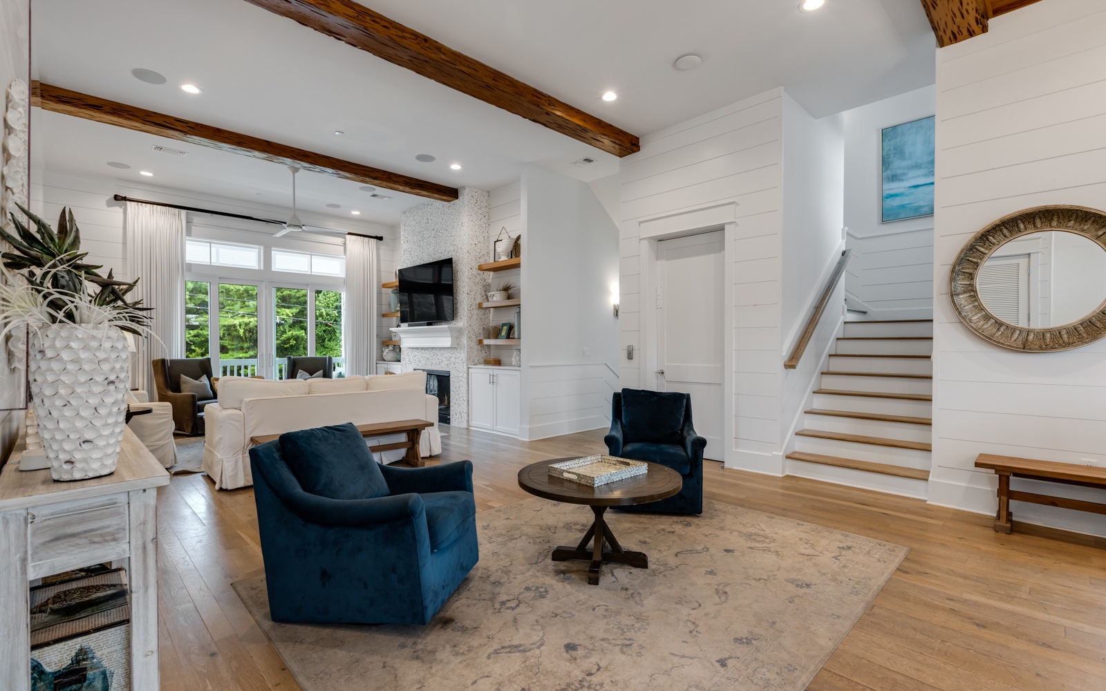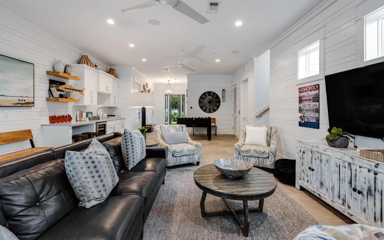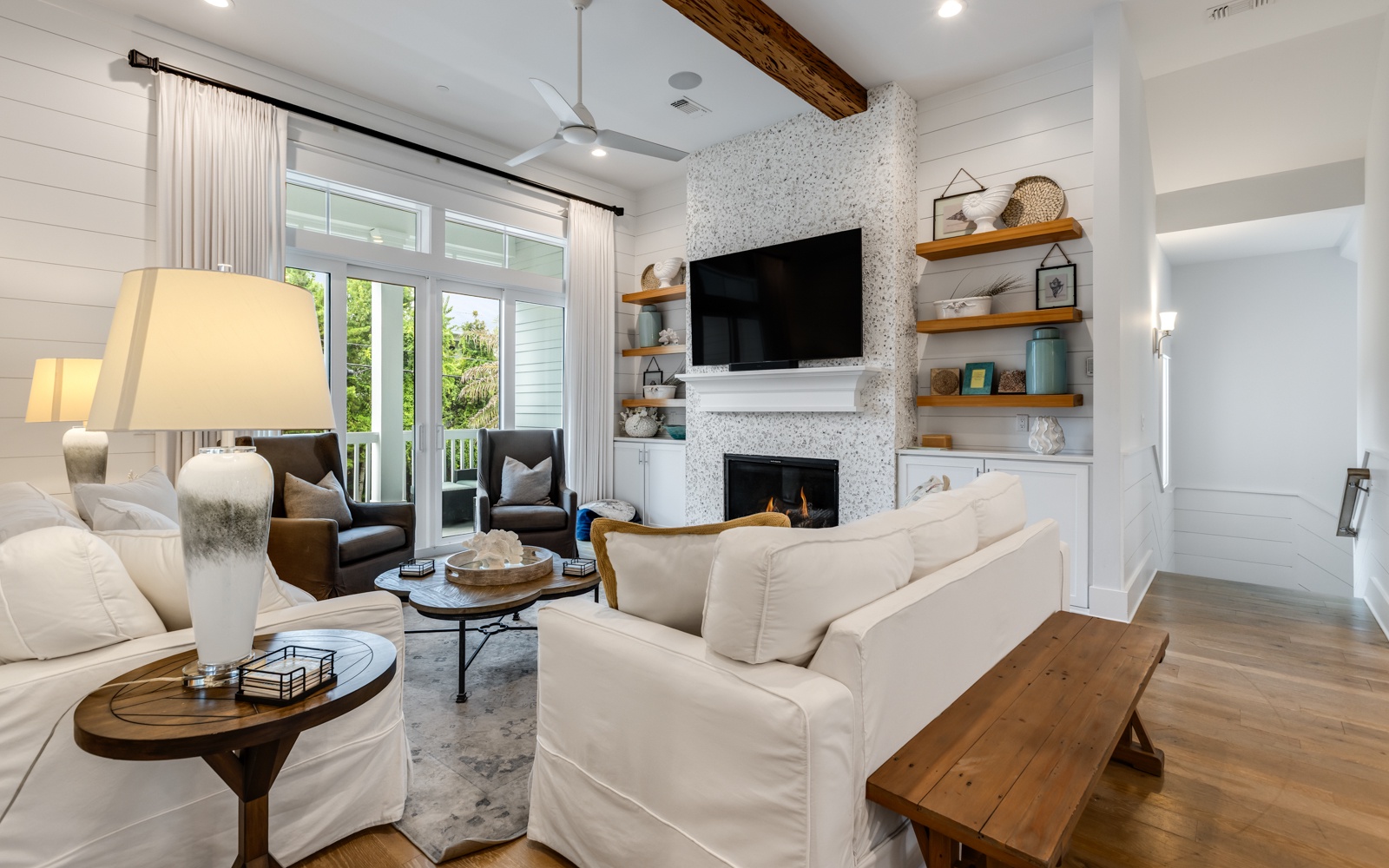 This magnificent Blue Mountain Beach home is opulent living on 30A. Four floors of stunning beauty, including a sun deck with an outdoor kitchen, dining, and ocean views. In addition to the outdoor spaces, Our 30A Sandcastle has three indoor living/entertainment rooms, a chef's kitchen and a dining table that can seat twenty (20). The living room is grand yet cozy with the gas burning fireplace and comfortable seating for all.