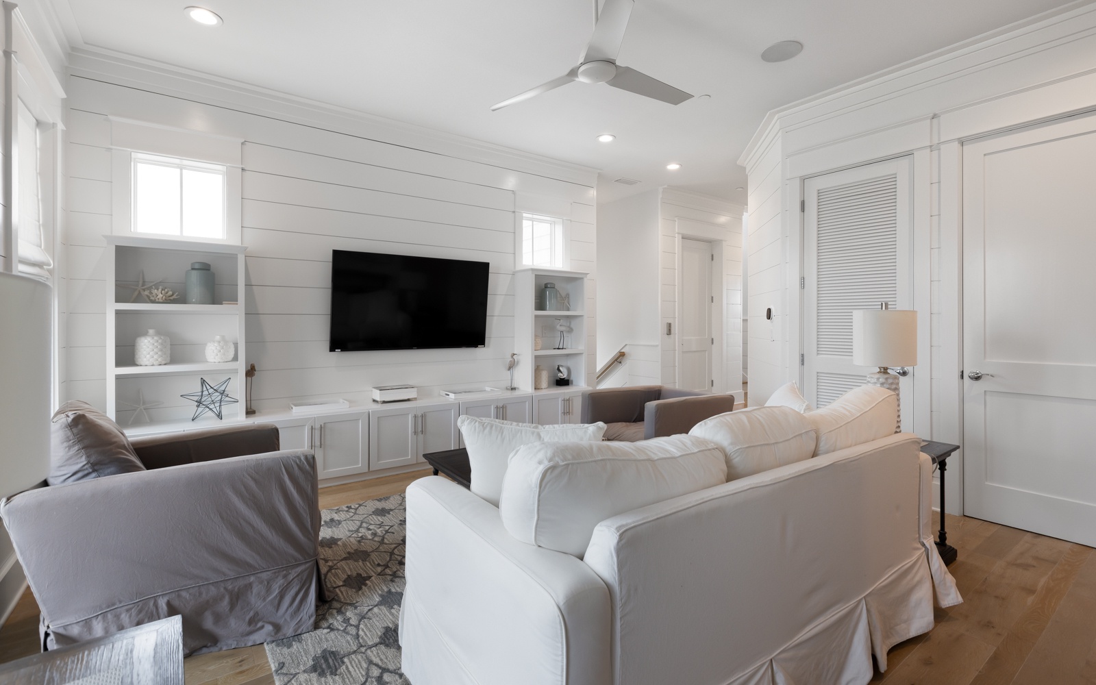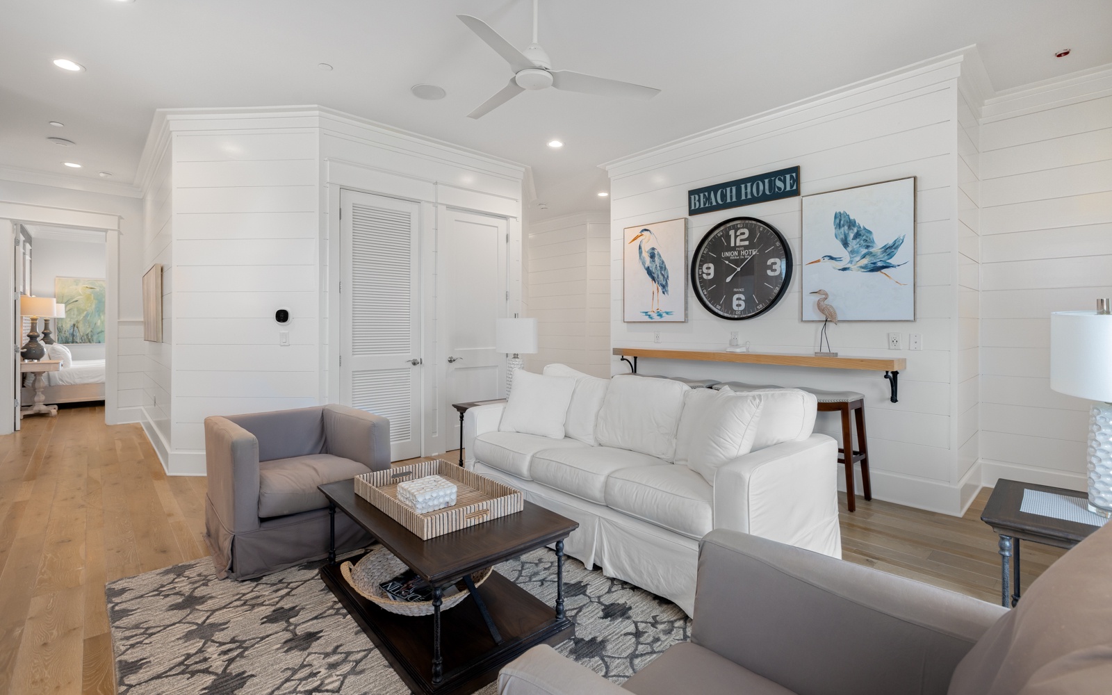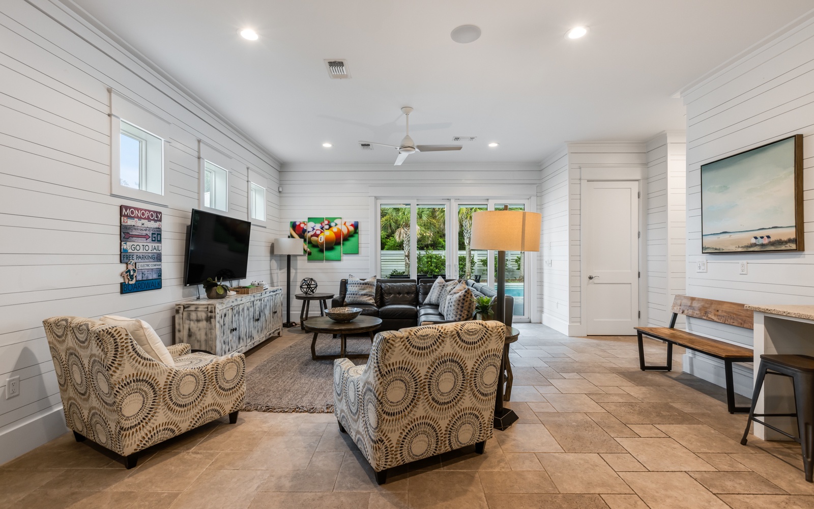 This magnificent Blue Mountain Beach home is opulent living on 30A. Four floors of stunning beauty, including a sun deck with an outdoor kitchen, dining, and ocean views. In addition to the outdoor spaces, Our 30A Sandcastle has three indoor living/entertainment rooms, a chef's kitchen and a dining table that can seat twenty (20). The living room is grand yet cozy with the gas burning fireplace and comfortable seating for all.