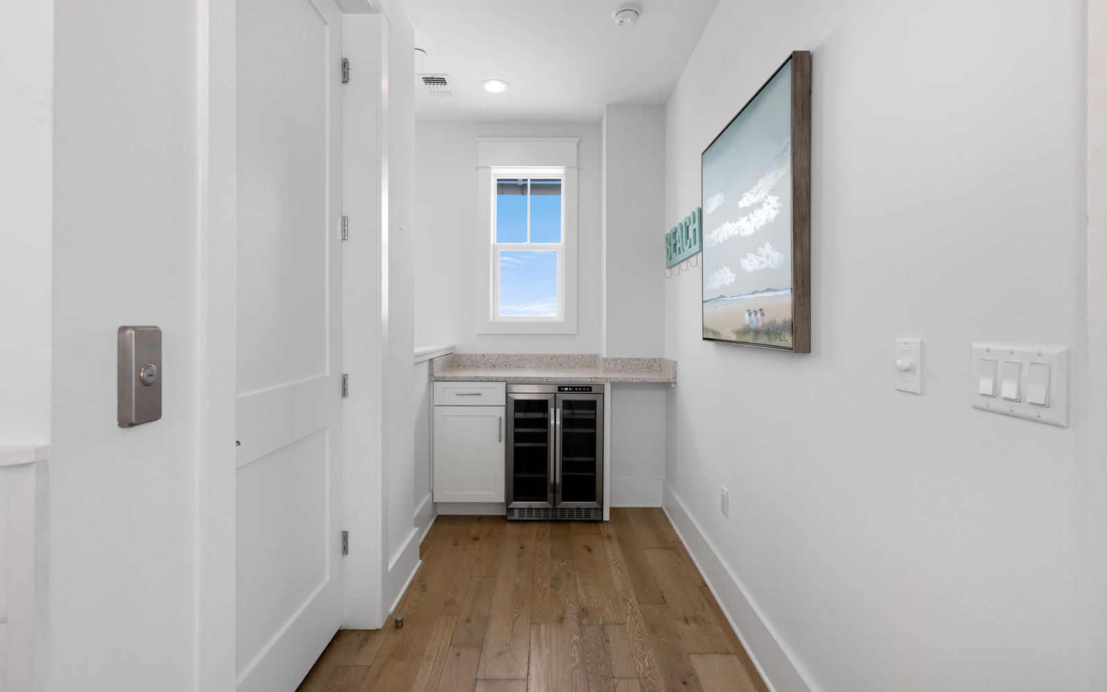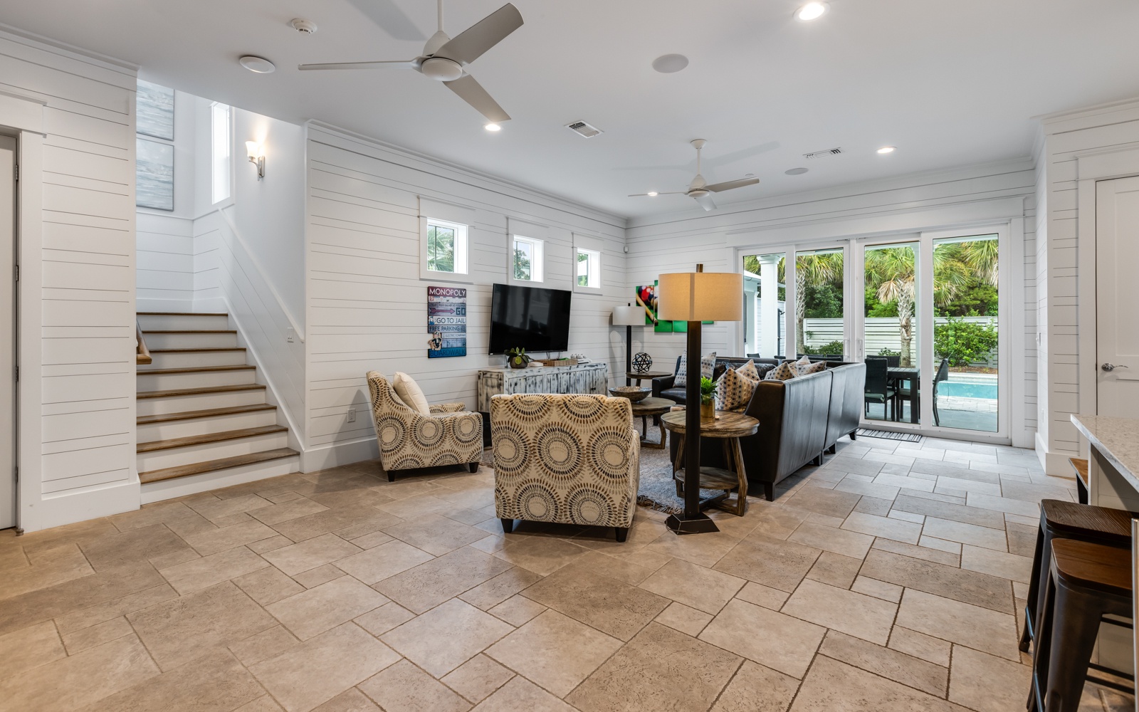 You can easily access the backyard pool, lounge, and outdoor kitchen from this floor. There are two bedrooms, one bunk room that sleeps ten (10), each bed has its own tv and a queen bedroom nearby.