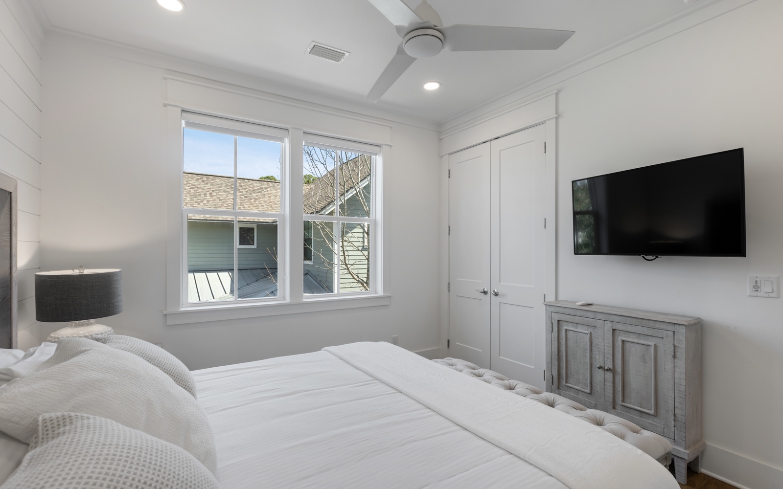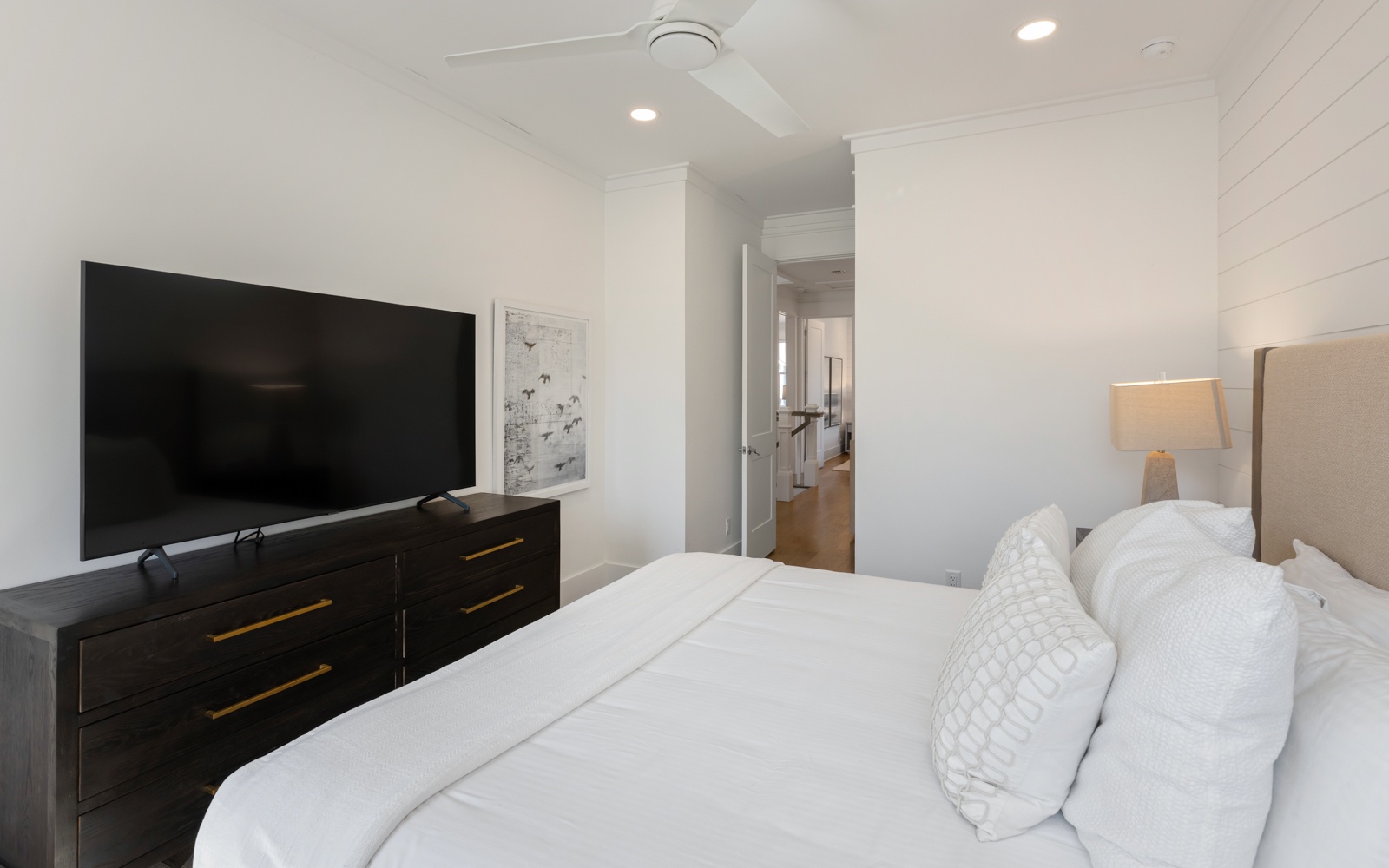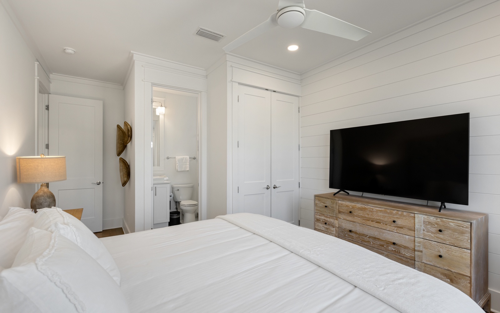 - Queen in 1st floor guest room (barn door); shared bath; TV