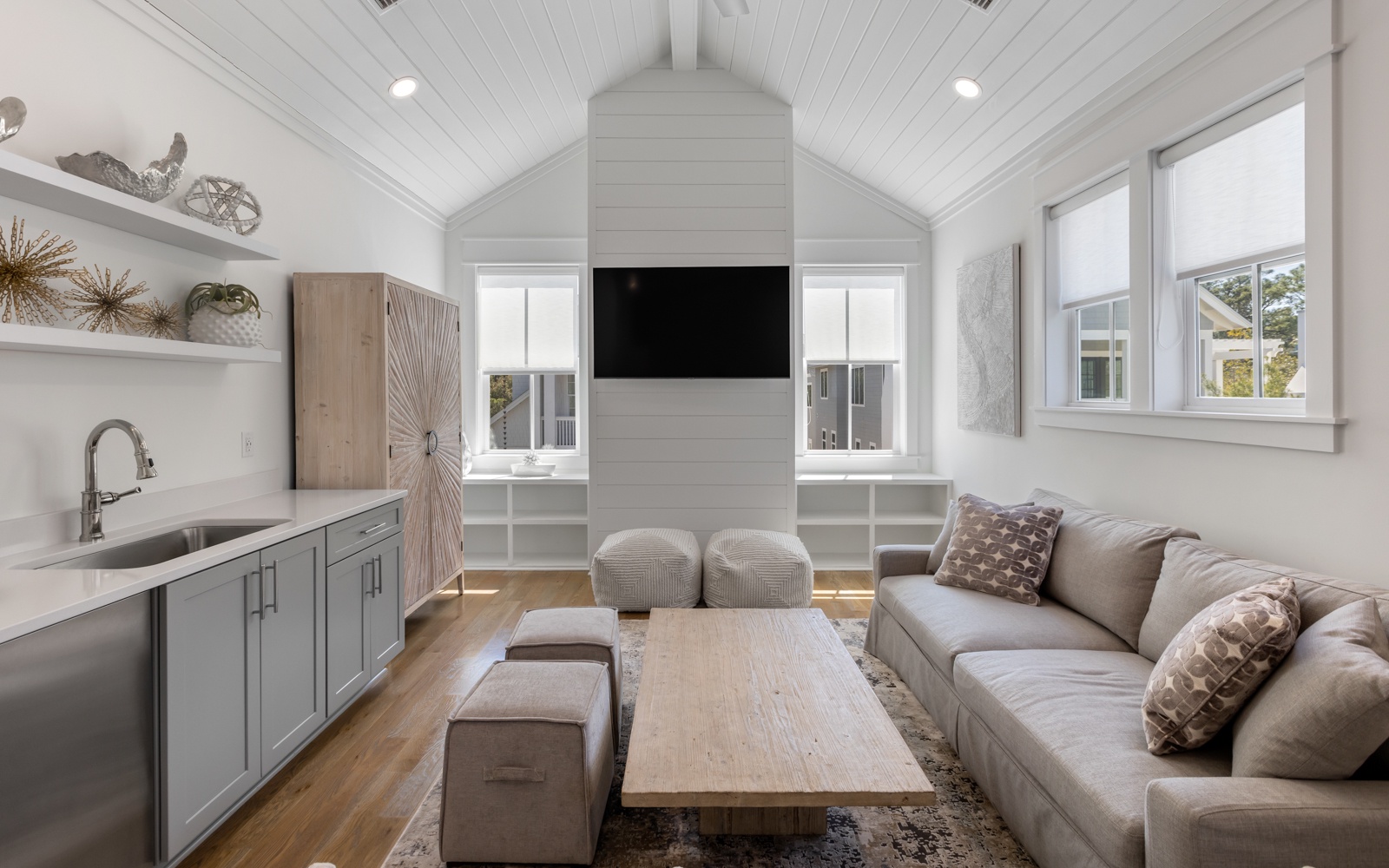 Upstairs, a second living area makes for the best movie night spot, complete with a big couch, chairs, and a Smart TV for all your streaming marathons.