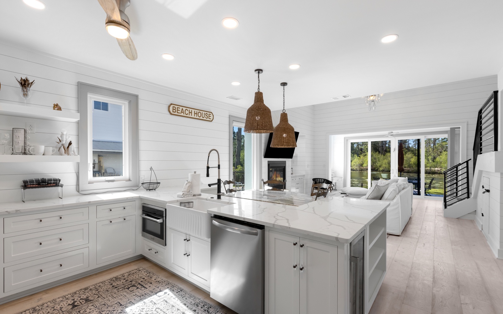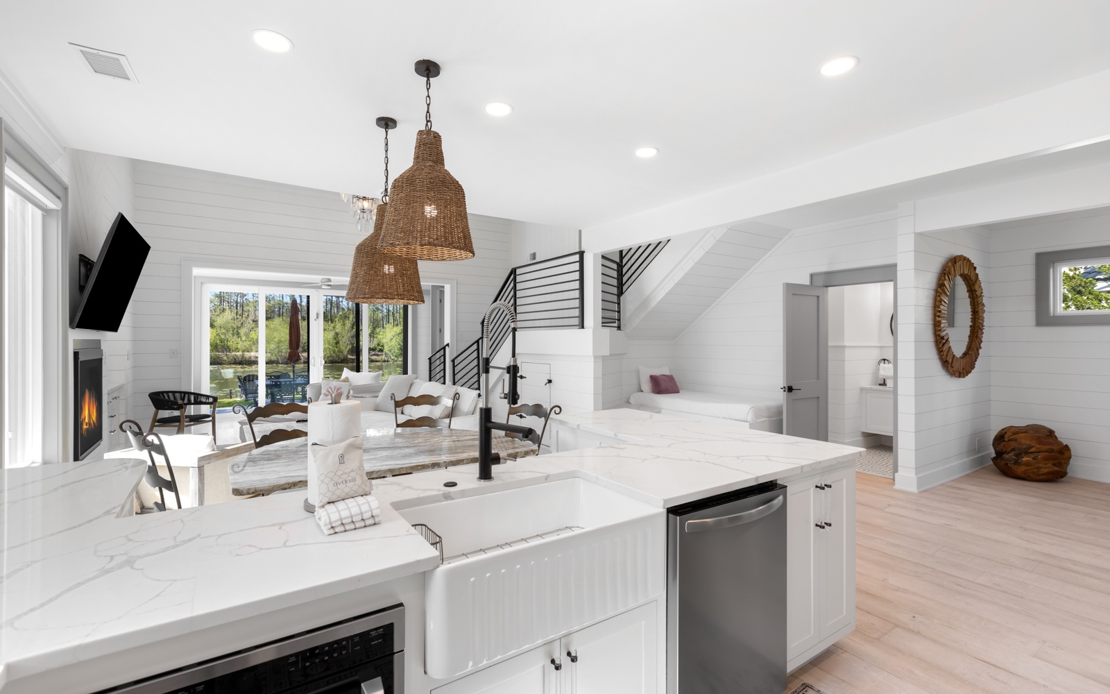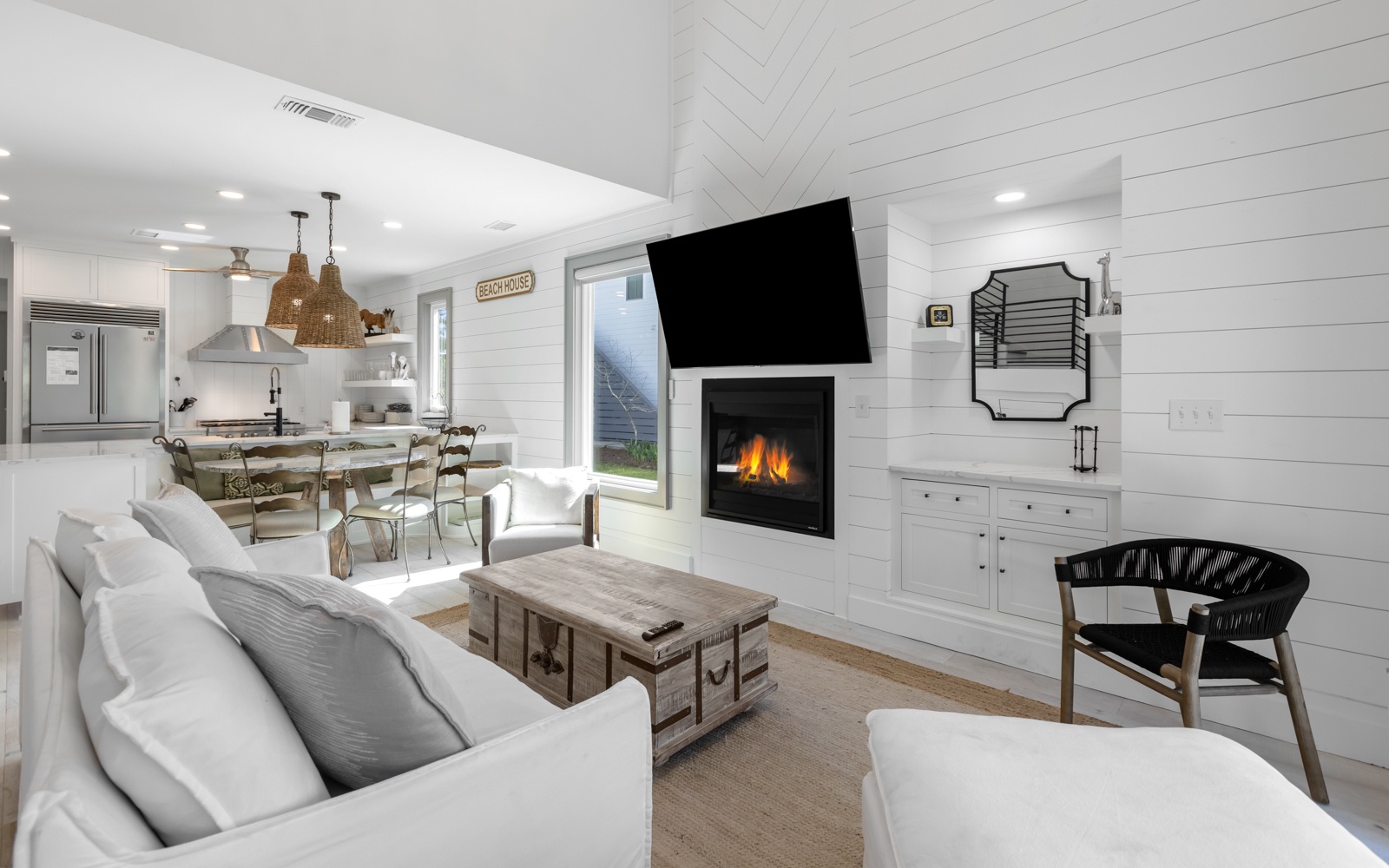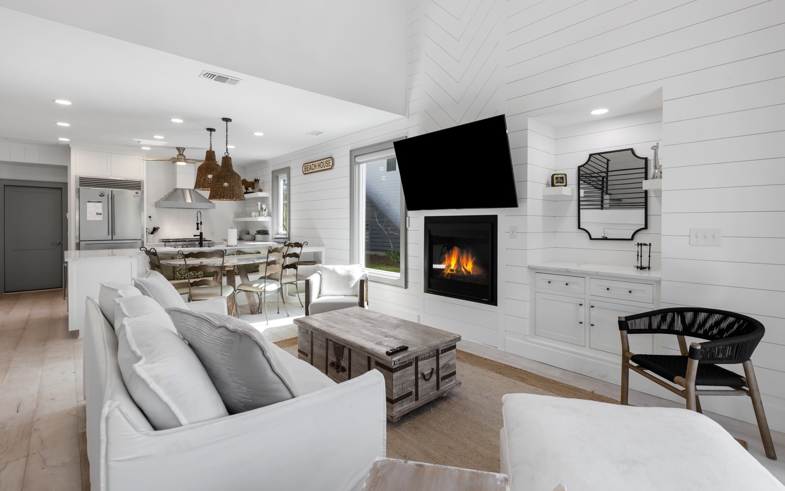 Inside, the first floor is a blend of comfort and charm, highlighted by delightful shiplap accents throughout. A spacious open area features a living room, dining space, and a breakfast bar kitchen, serving as the central gathering point for groups of up to 8 guests.