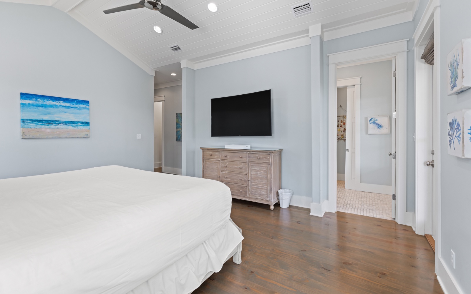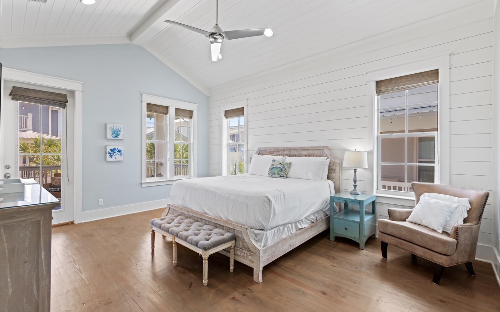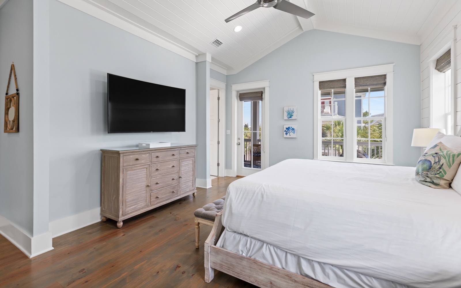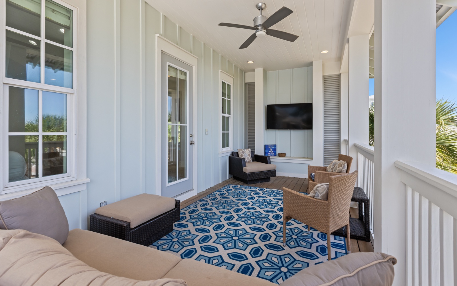 Upstairs, three more bedrooms await. The second-floor Captain’s Quarters is the primary suite you won’t want to leave. A king bed with a pillow-top mattress, a luxurious bathroom with a soaking tub, and a private veranda with comfy seating make this space a dream. You’ll also find a 65” curved 4K TV with premium channels for added indulgence.