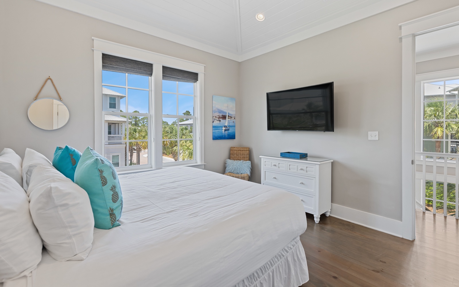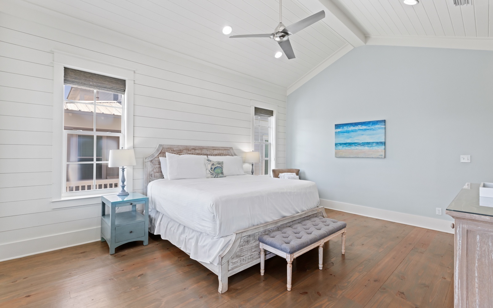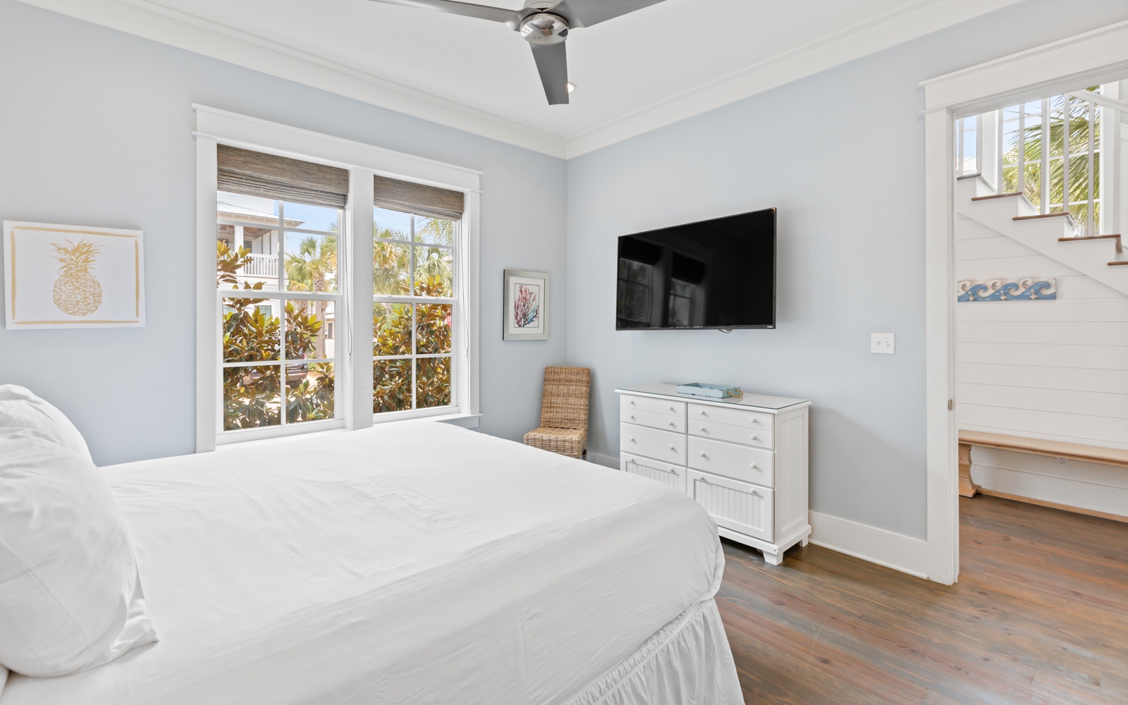 Upstairs, three more bedrooms await. The second-floor Captain’s Quarters is the primary suite you won’t want to leave. A king bed with a pillow-top mattress, a luxurious bathroom with a soaking tub, and a private veranda with comfy seating make this space a dream. You’ll also find a 65” curved 4K TV with premium channels for added indulgence.