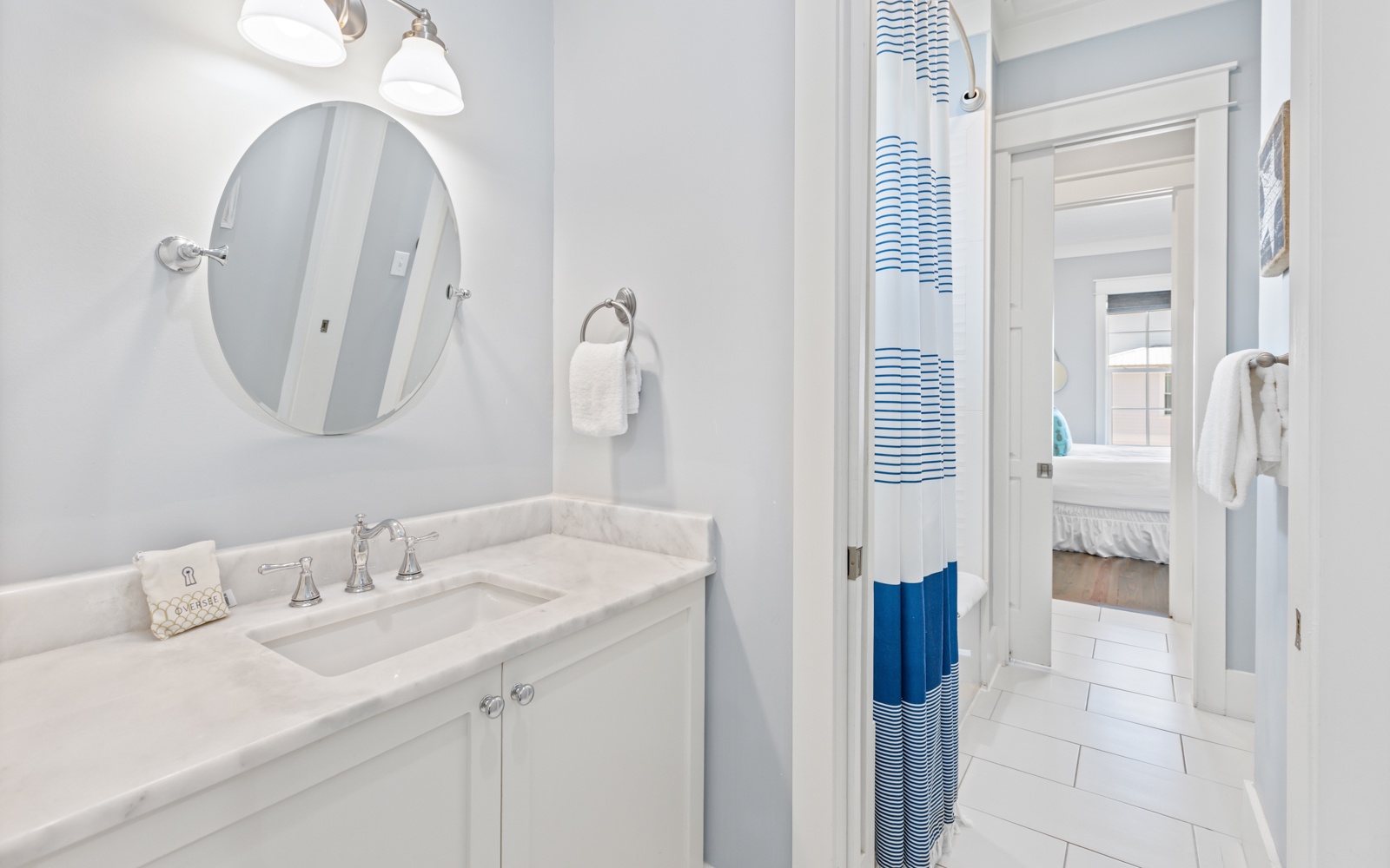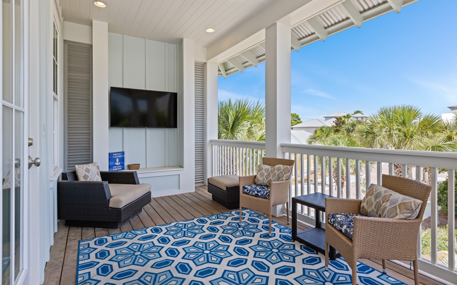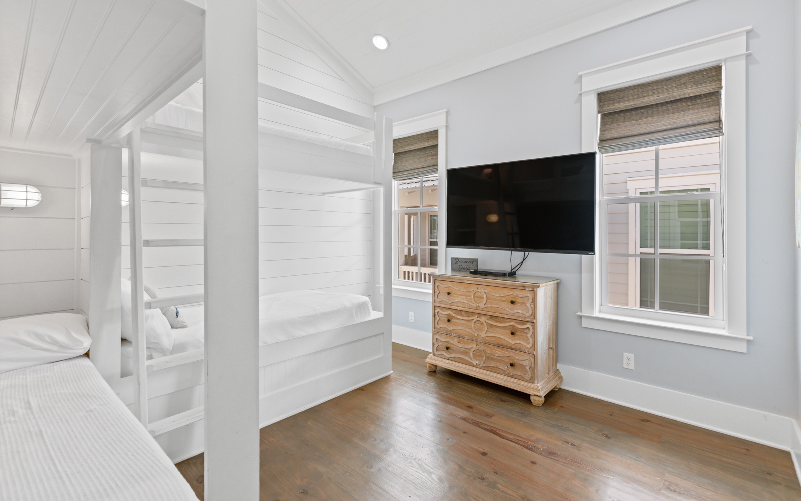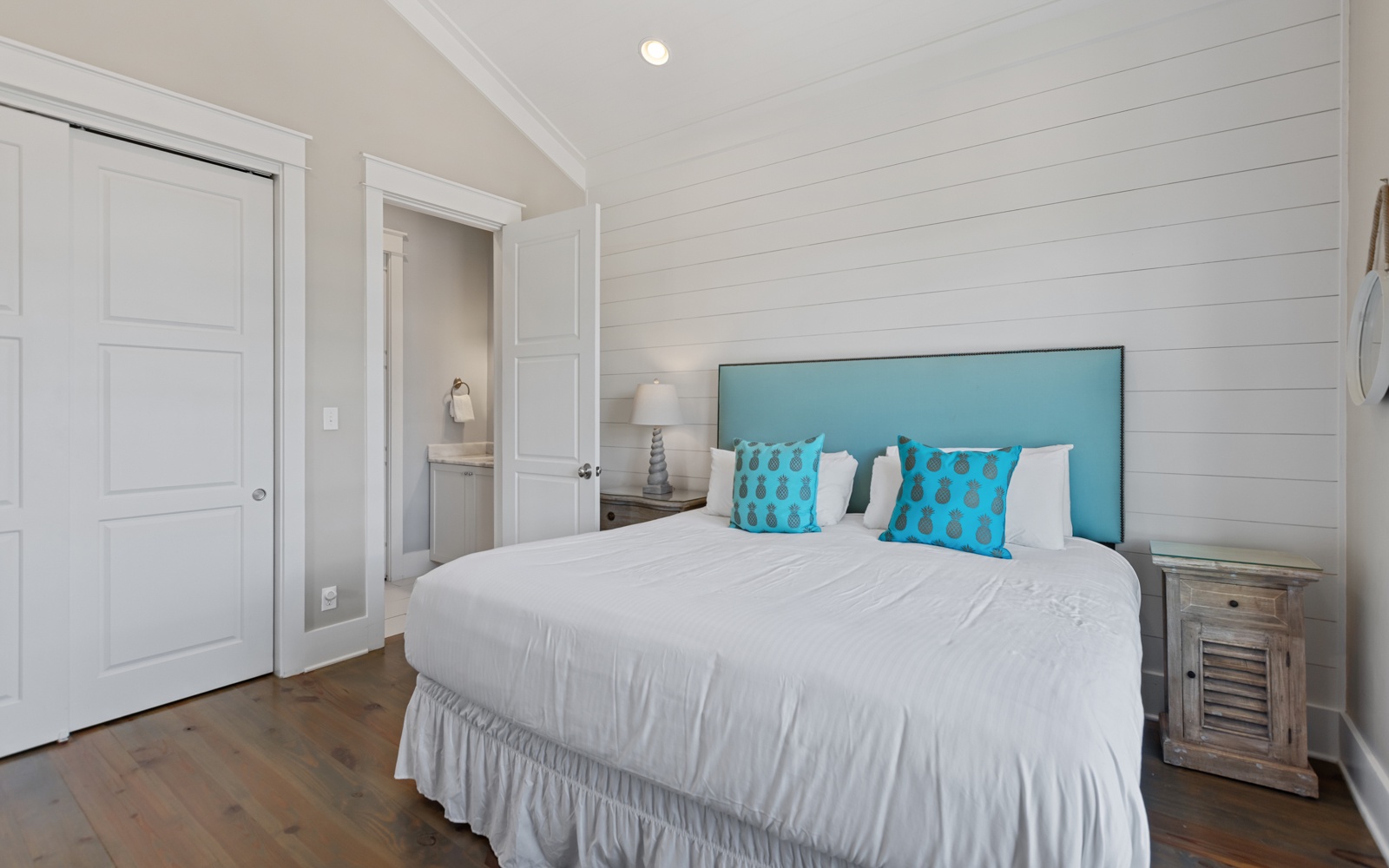 Upstairs, three more bedrooms await. The second-floor Captain’s Quarters is the primary suite you won’t want to leave. A king bed with a pillow-top mattress, a luxurious bathroom with a soaking tub, and a private veranda with comfy seating make this space a dream. You’ll also find a 65” curved 4K TV with premium channels for added indulgence.