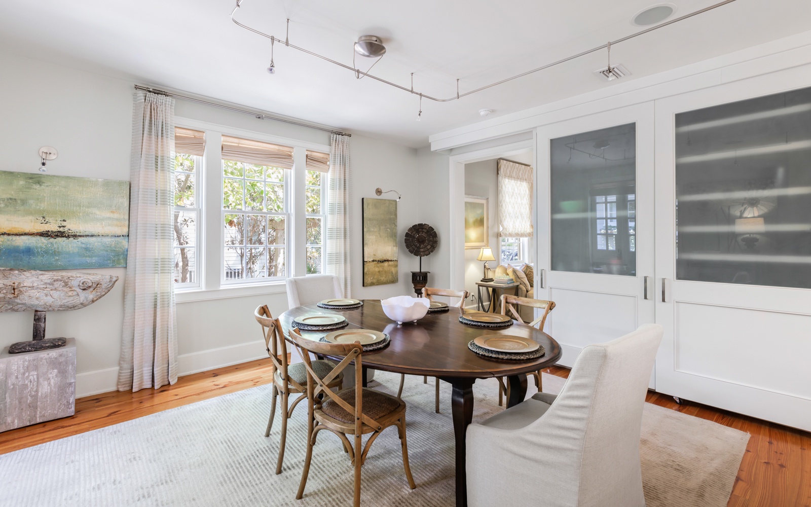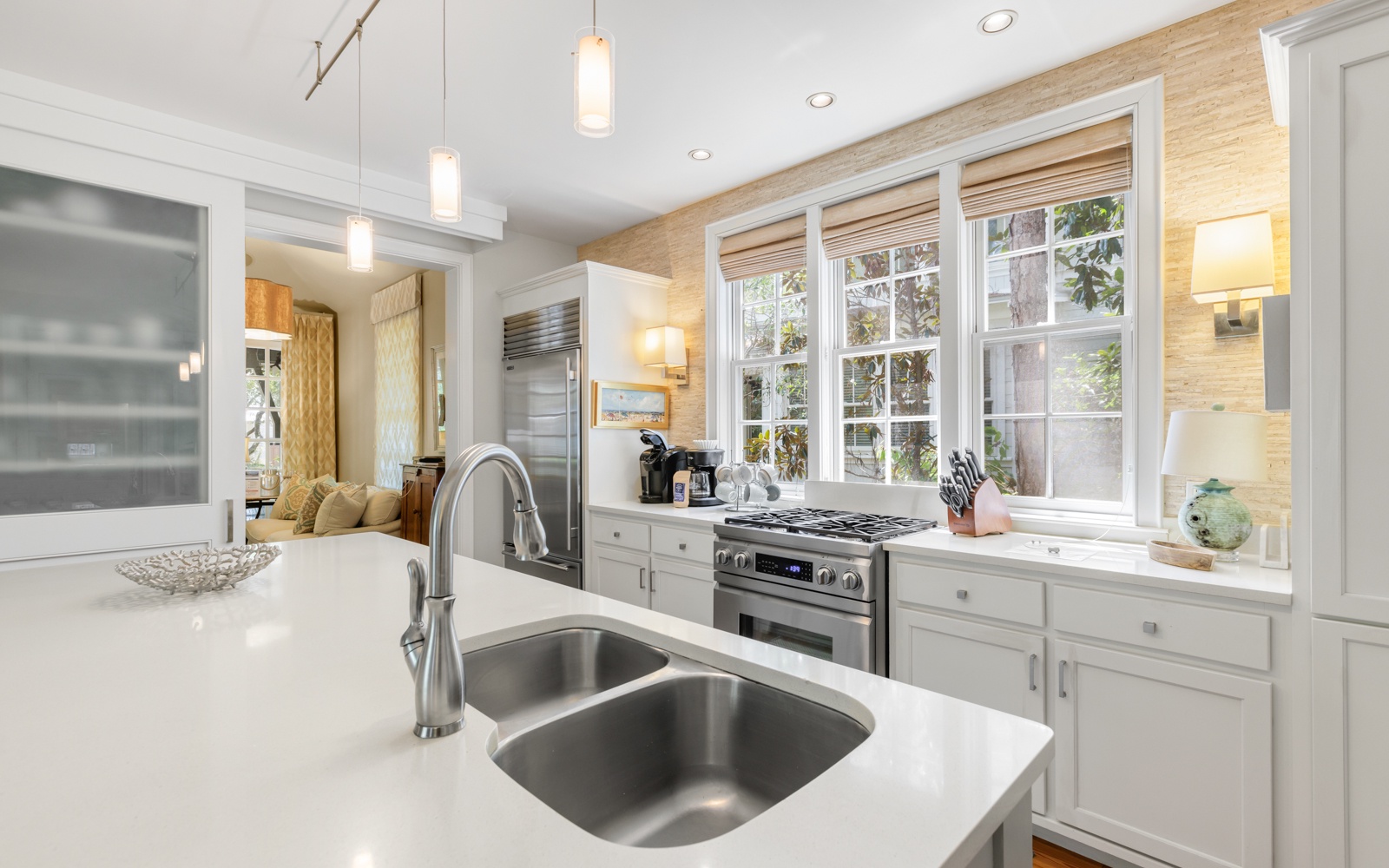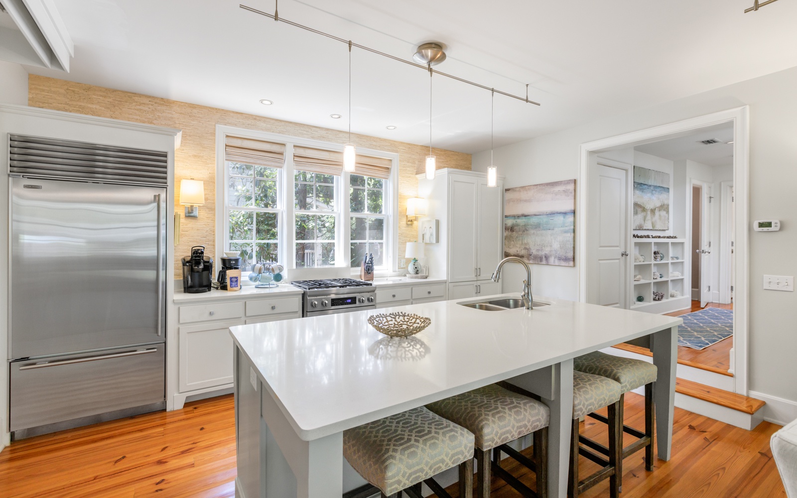 Inside, the luxurious open dining-kitchen area has a serene, calming effect, a great space for all to hang out and unwind. The kitchen features high-end appliances with bar seating for 4, the dining table seats 6.