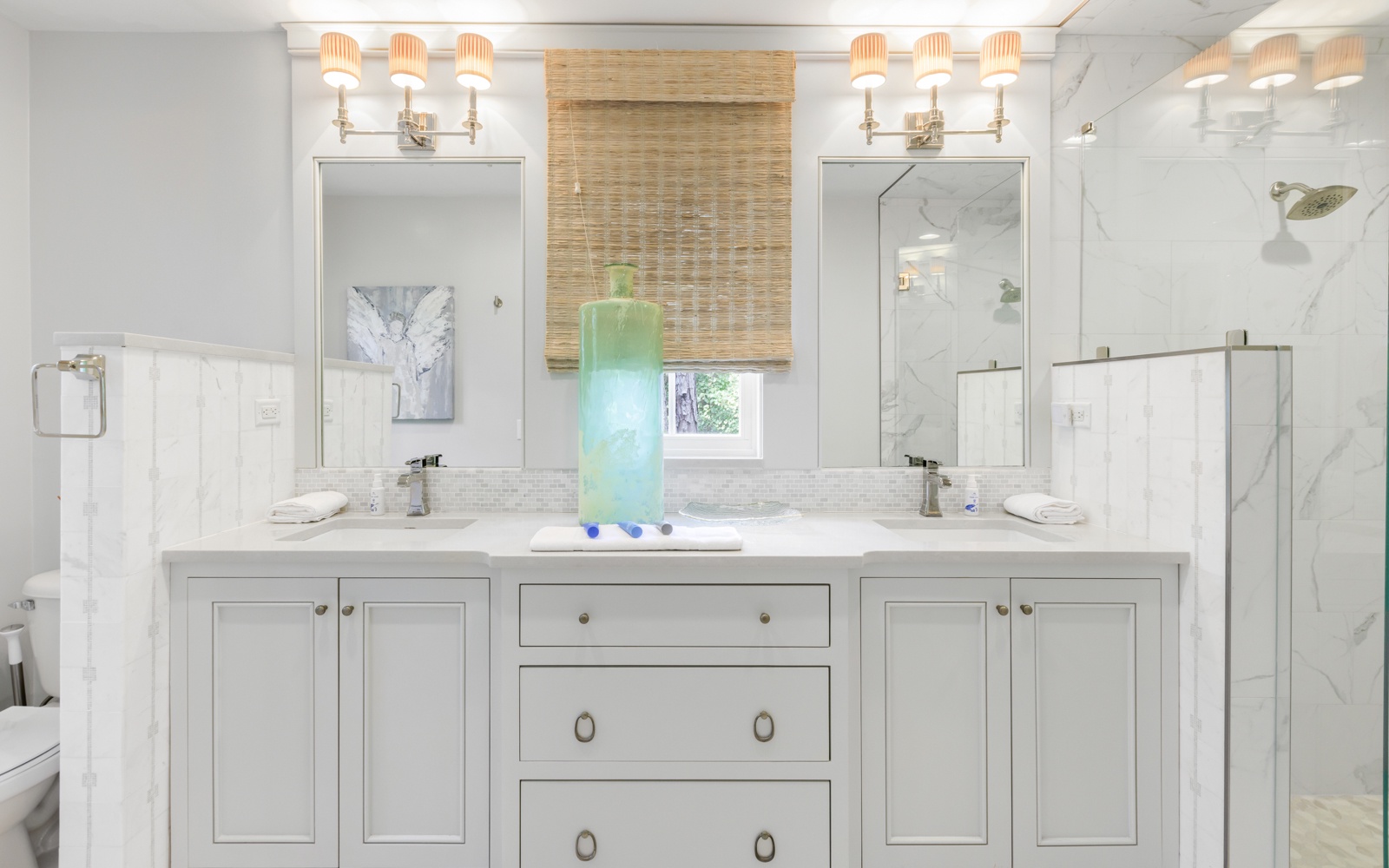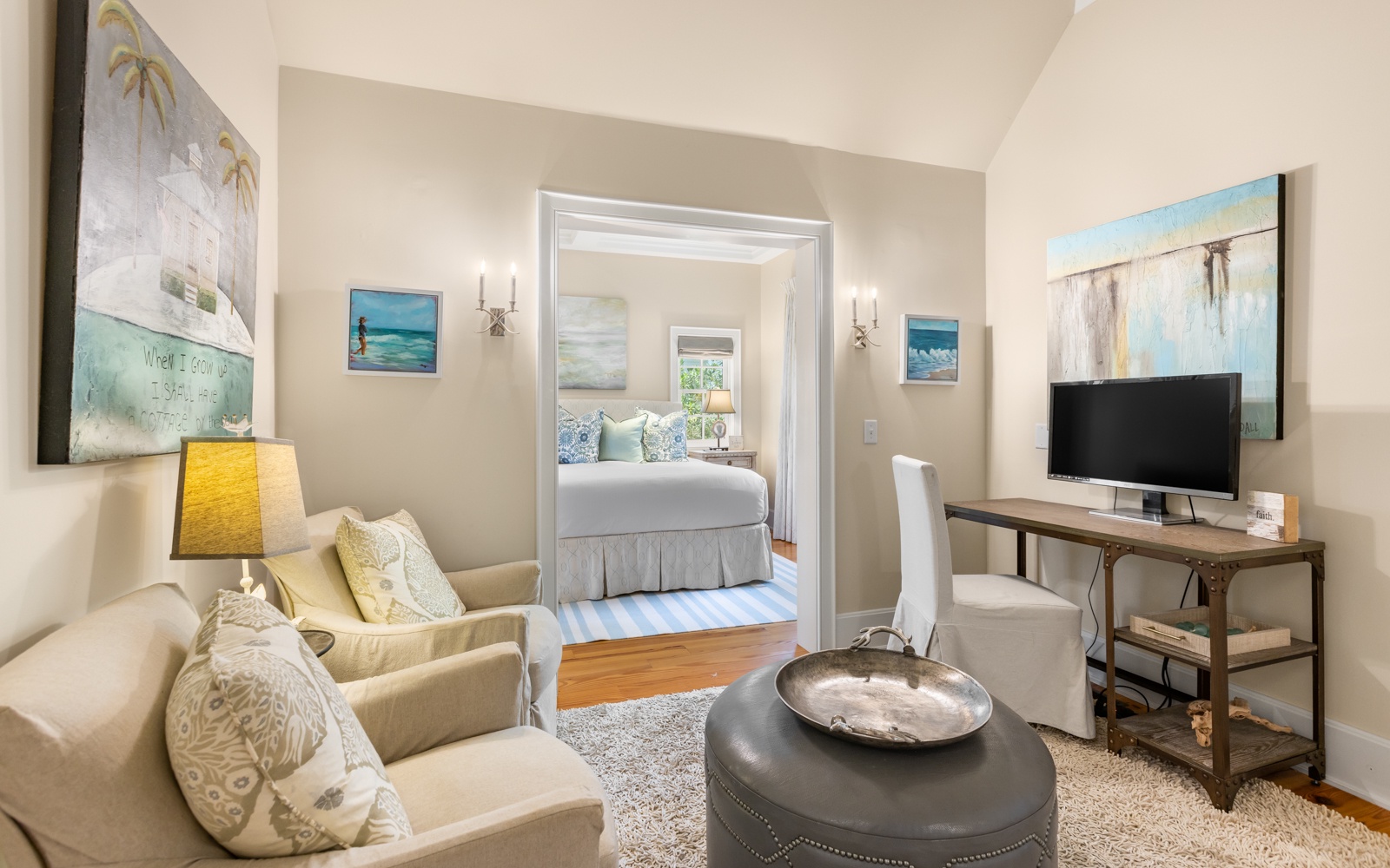The first-floor primary suite, king, features a sitting room, dual shower, dual vanity and a private, screened balcony.