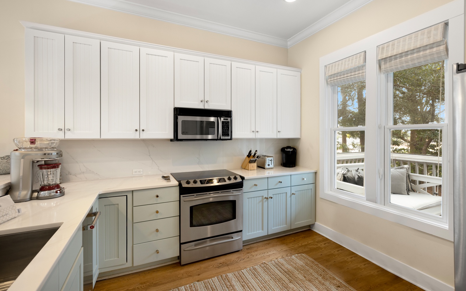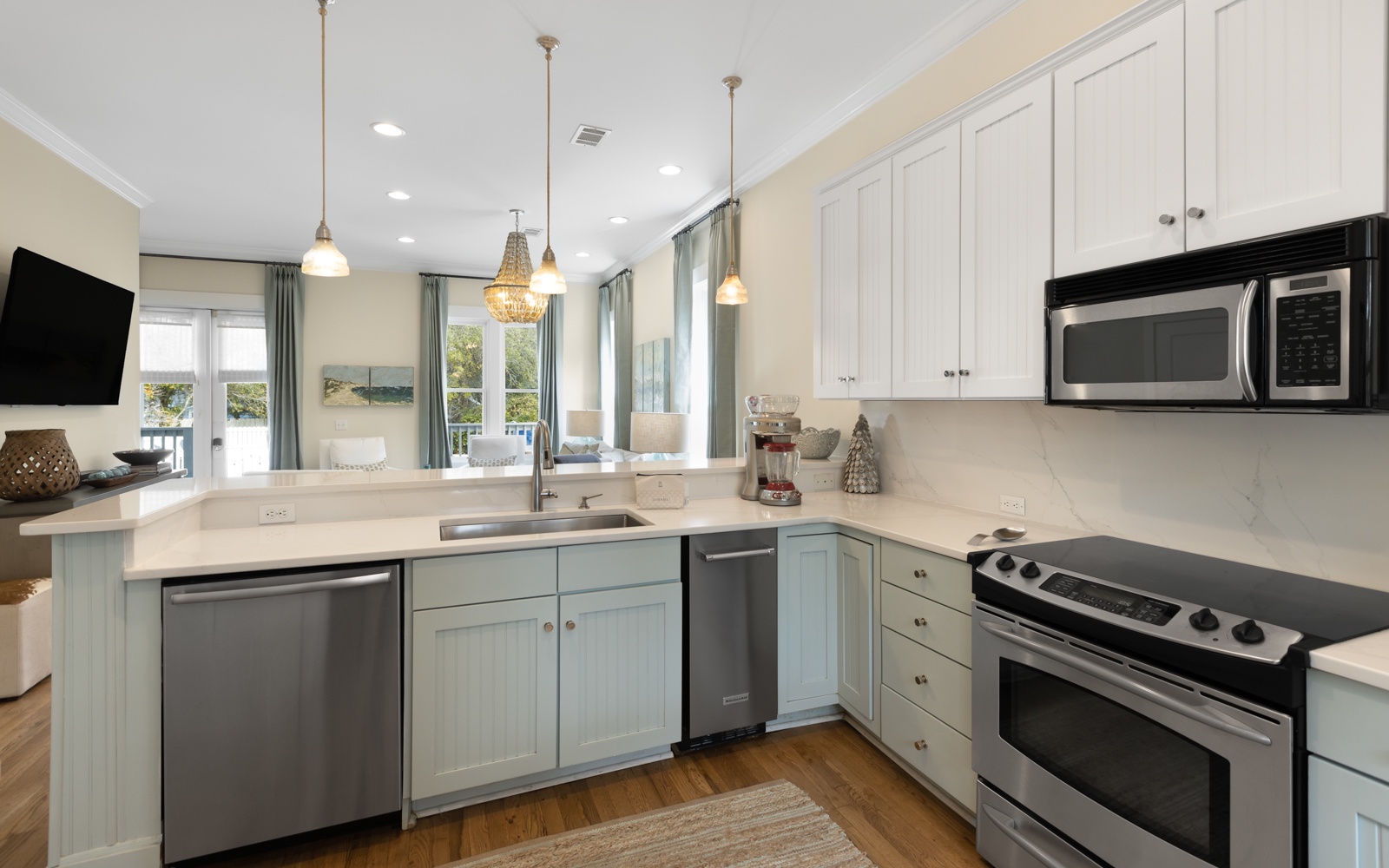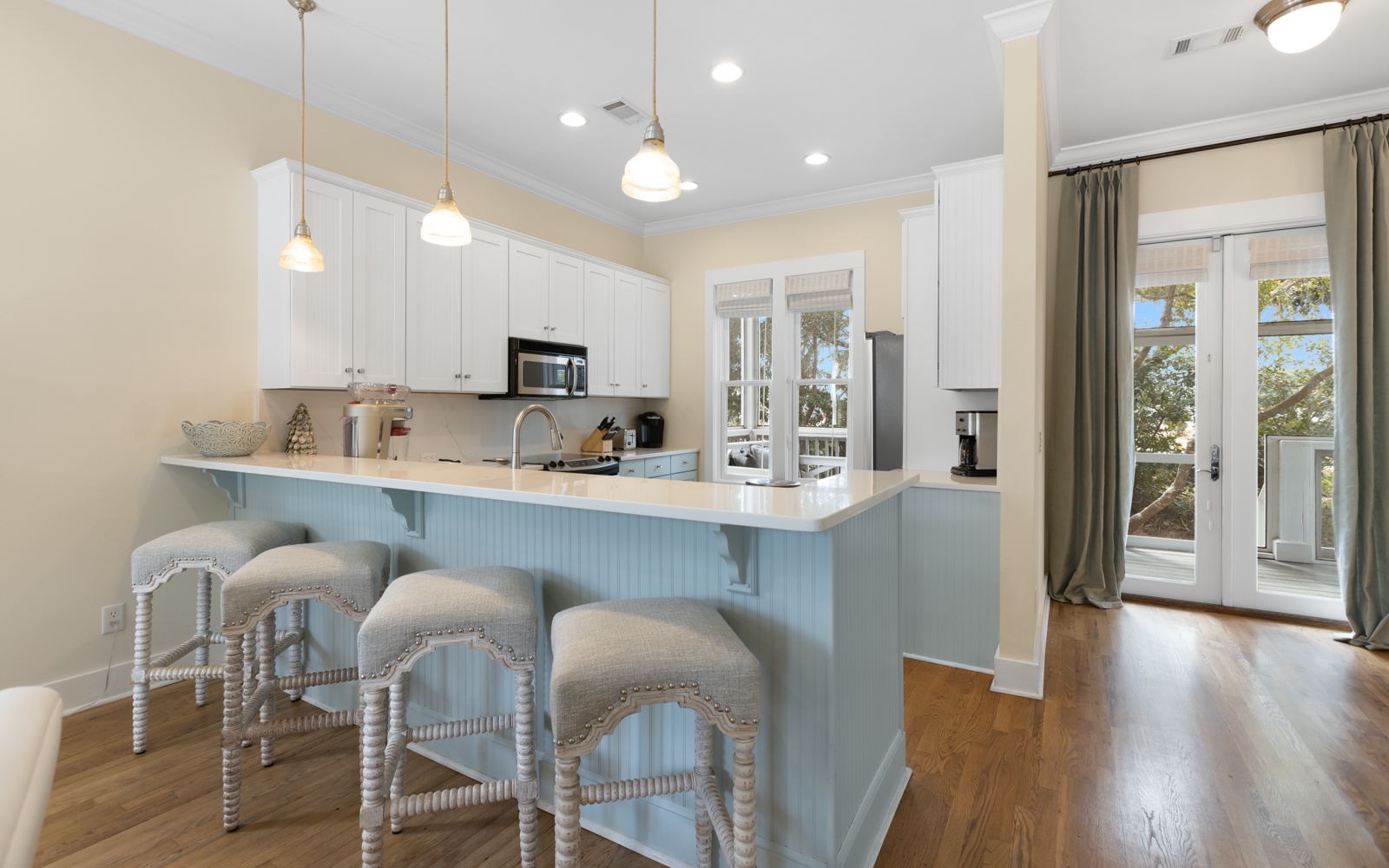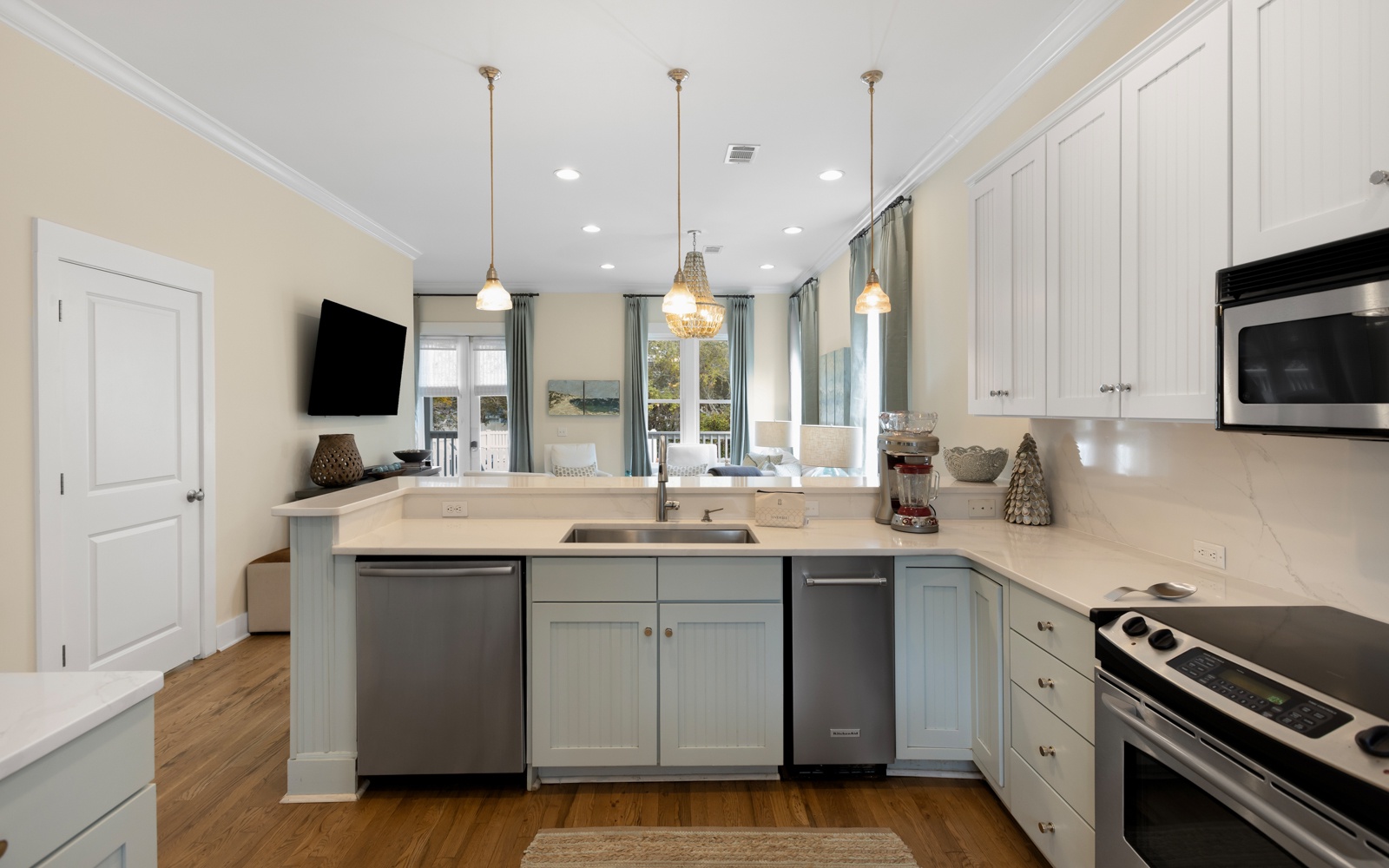 Inside, the first floor includes a spacious, open living and kitchen area, a charming space for gathering after a day at the beach. The kitchen comfortably seats up to 12 guests at the breakfast bar and dining table. A convenient powder room and a cozy guest room with a queen bed, private bath, and TV are also on this floor.