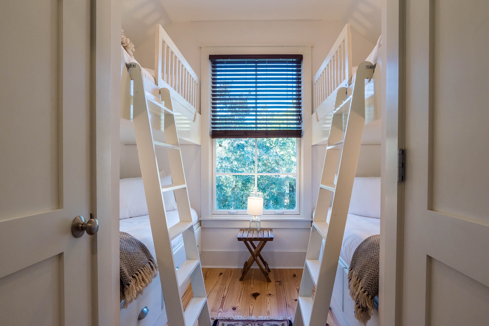 - Two twin-over-twin built-in bunk beds in second-floor guest bedroom; shared bath