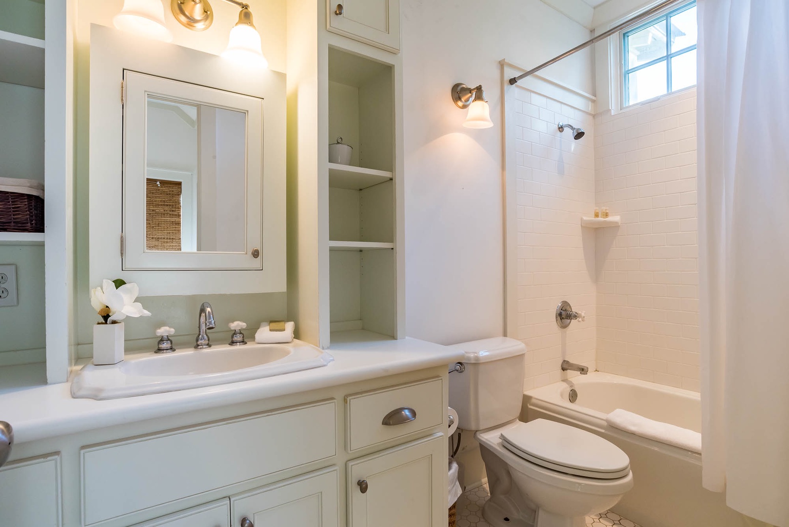 - Queen bed in second-floor guest bedroom; private bath with shower/tub combo