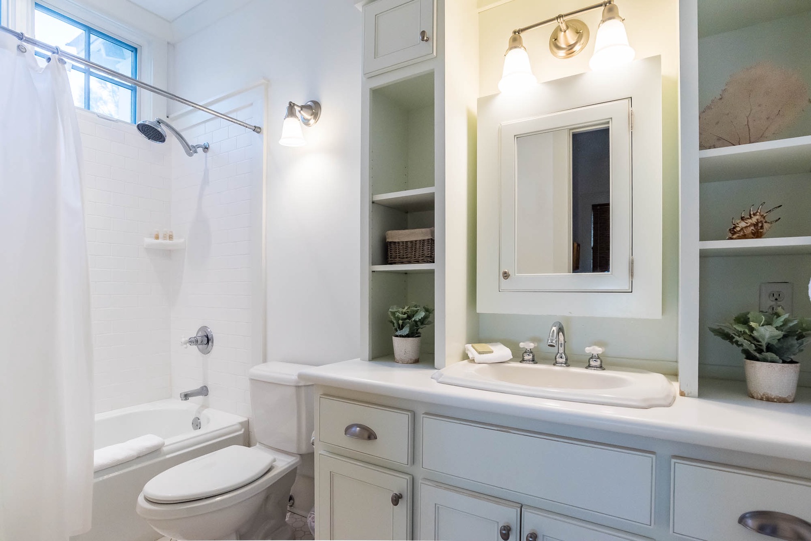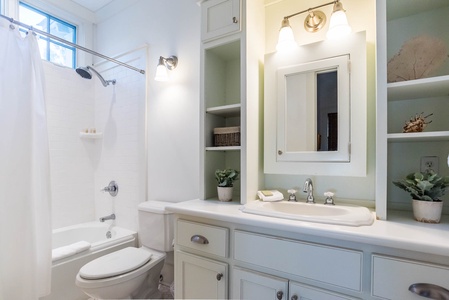 - Queen bed with twin sleeper in second-floor guest bedroom; shared bath with shower/tub combo