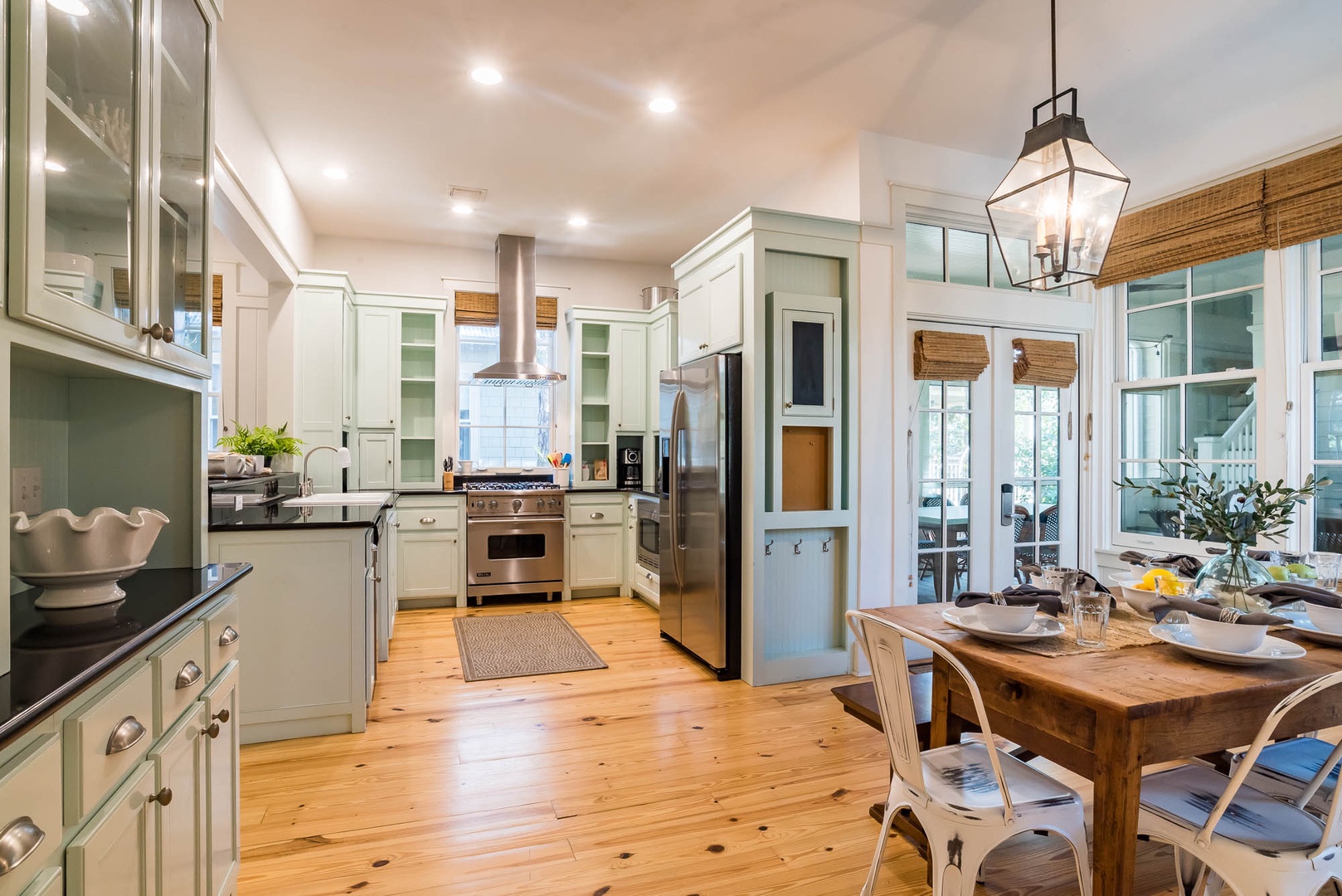 The spacious front porch and ample outdoor seating create a warm welcome for guests arriving at 47 Red Cedar Way. The main living, dining, and kitchen areas are adjoined by an open-concept floor plan that features pine floors throughout. Plush furnishings and a mounted, flat-screen television make the living area a relaxing place to unwind after a long day of fun and sun. The chef's kitchen boasts granite countertops and stainless steel appliances. The nearby dining area offers seating for 8 guests, with 4 additional seats at the breakfast bar.