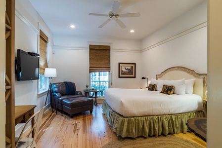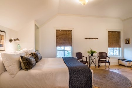 Completing the first floor is the primary suite, which features a king bed and a private en suite bathroom with a shower and a separate soaking tub.