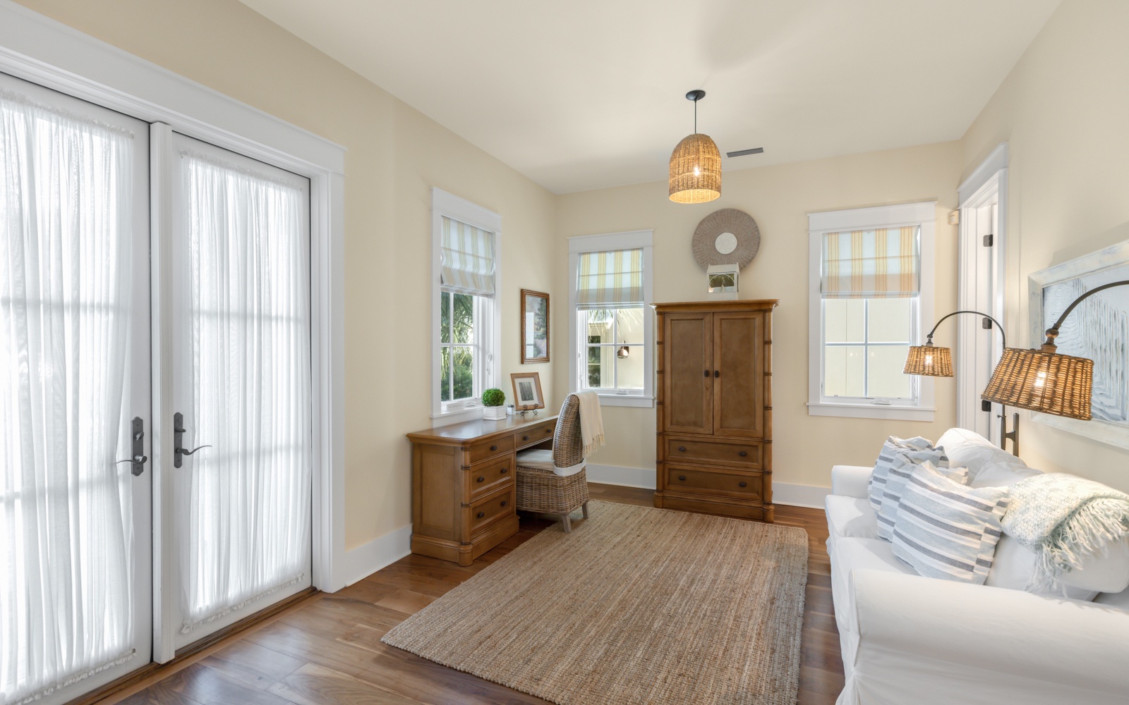 The first floor features a cozy sitting area, complete with a desk and chair, as well as a guest room, queen, with a private ensuite bathroom. A second guest room, full, includes a Jack and Jill bathroom that leads back into the sitting area.