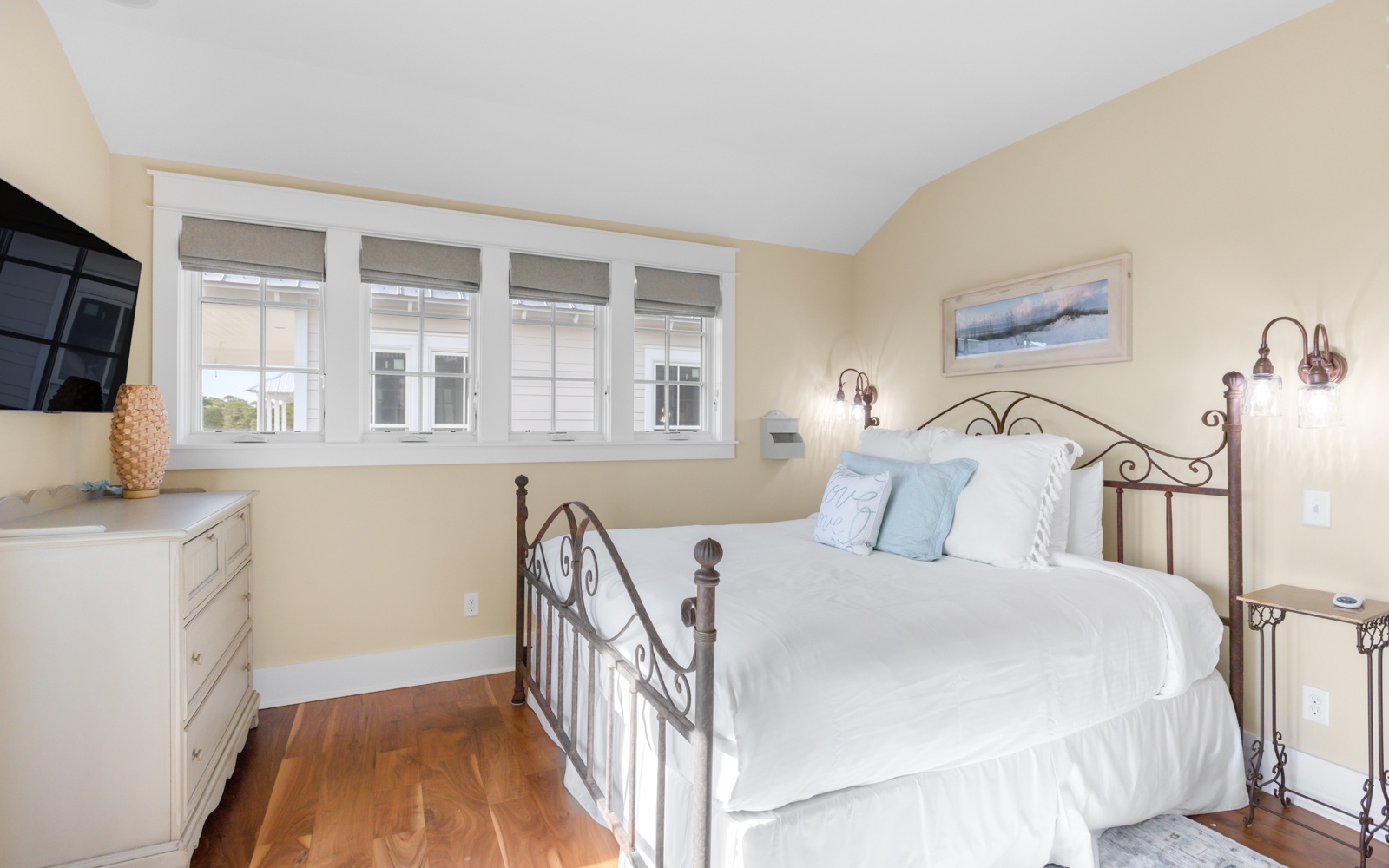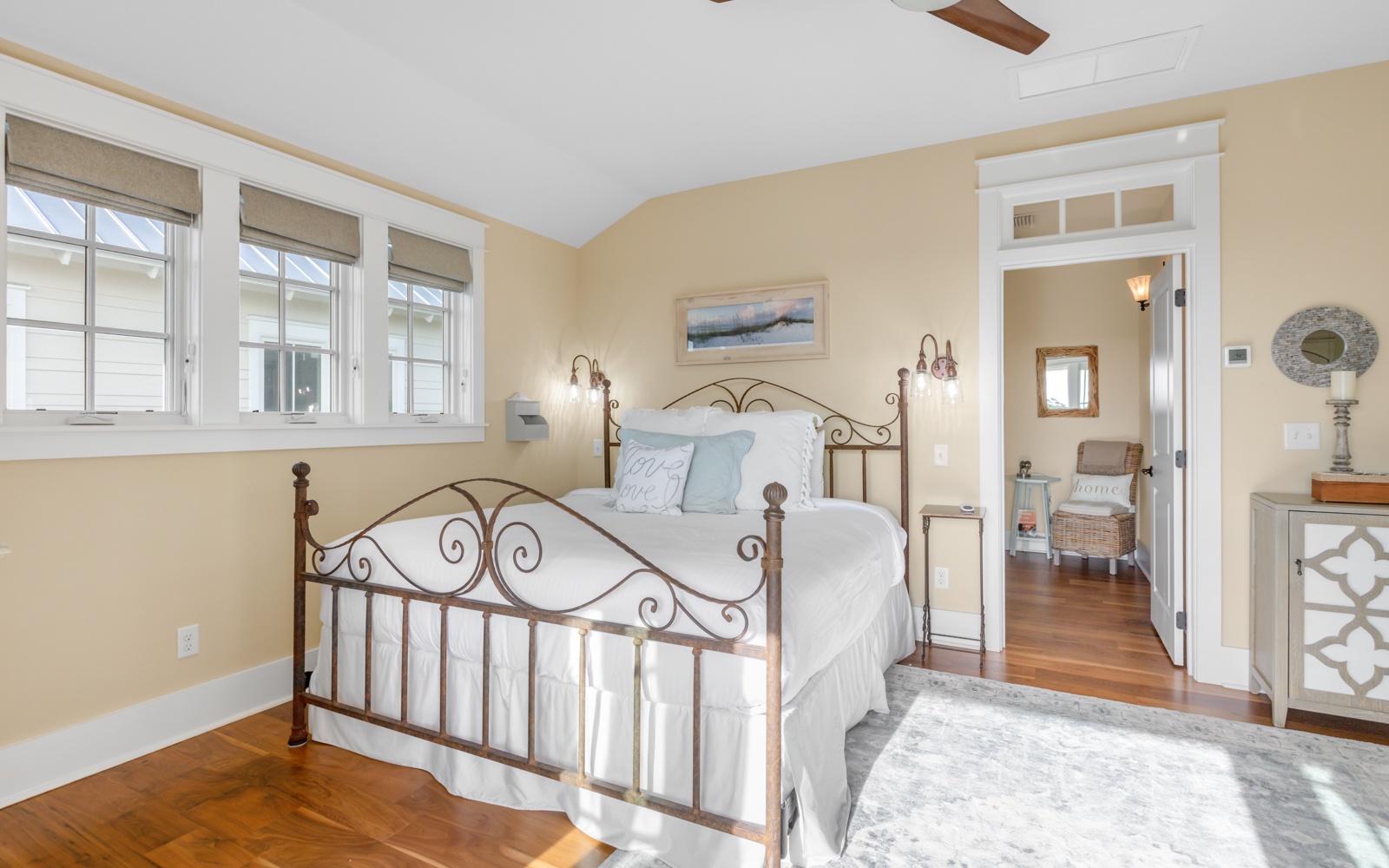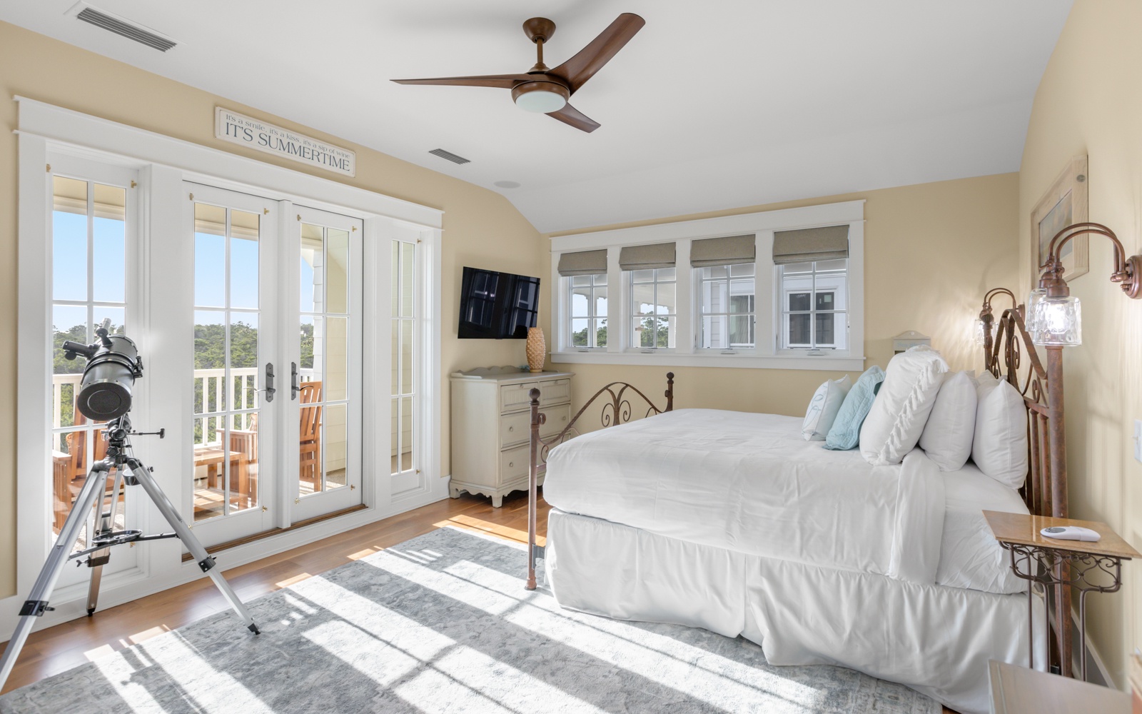 The third floor is dedicated to the private primary bedroom suite, king, complete with a huge ensuite bathroom. Relax in the luxurious Jacuzzi bathtub, gaze at the stars through the large telescope, or step out onto the balcony and take in the views and sounds of the Gulf and The Topsail State Park.
