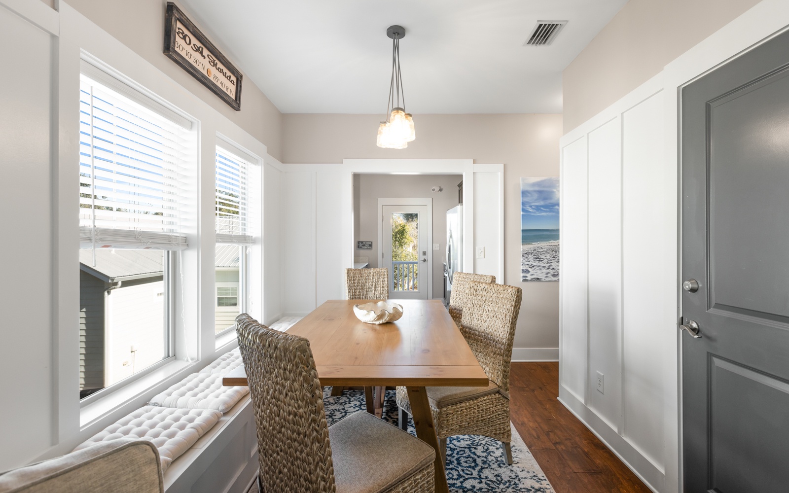 The fully stocked kitchen is ready for anything. Quick beach snacks, big family breakfasts, or a fresh seafood feast. The dining nook comfortably seats six, but let’s be real—you’ll probably want to take your coffee or cocktails outside.