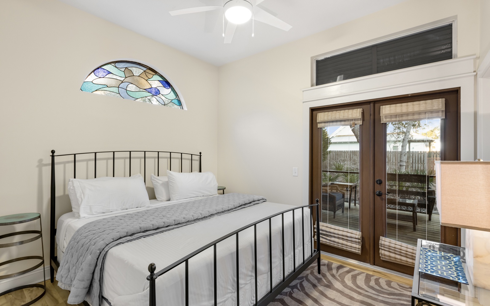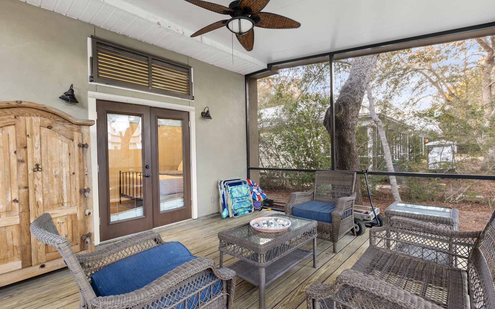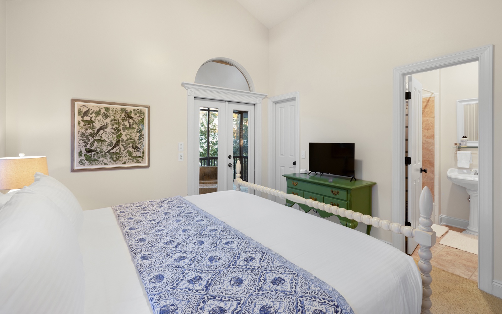 The first-floor guest room, with king bed, private bath, and custom-tiled walk-in shower, opens onto a unique and cozy screened-in porch.